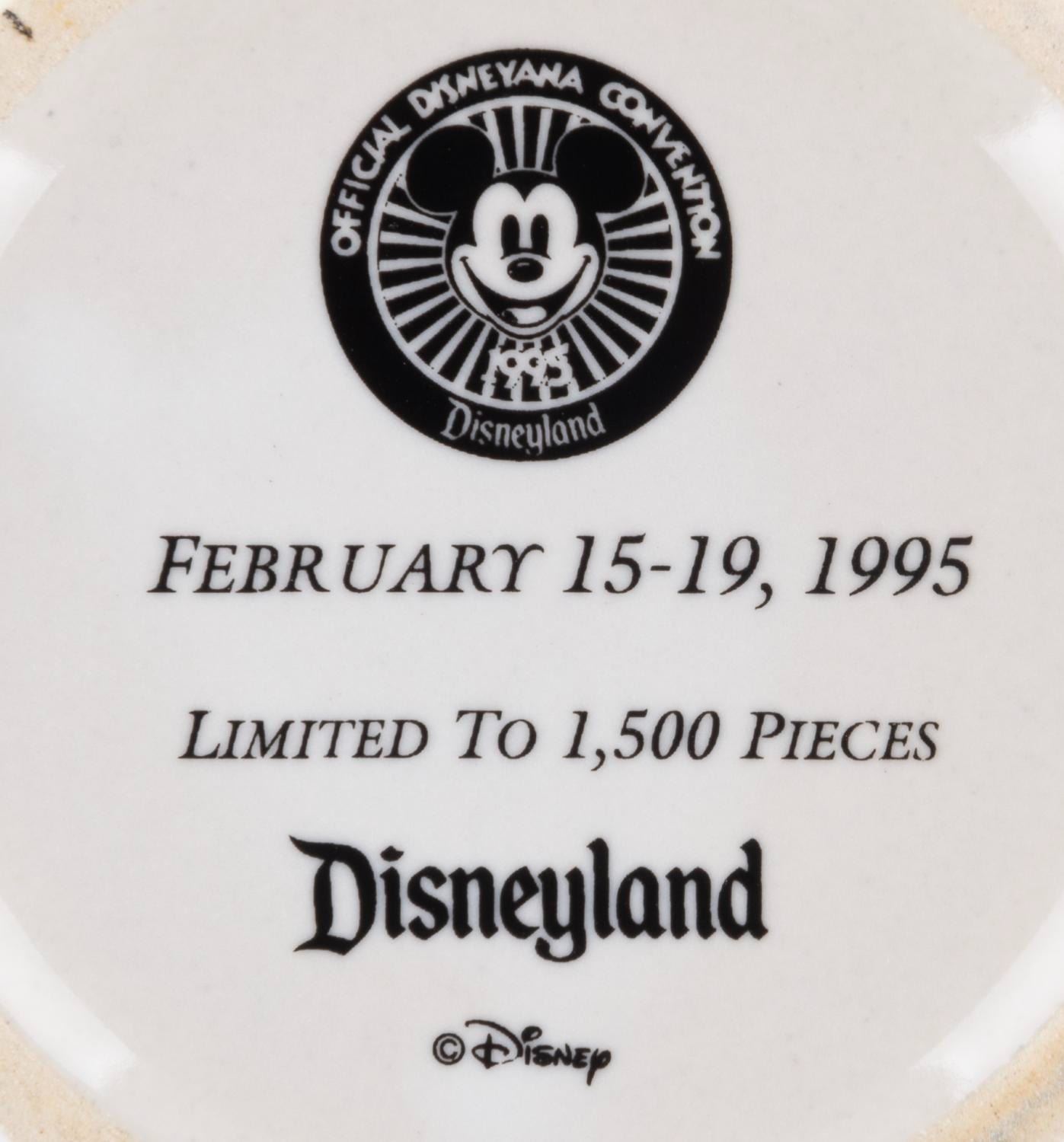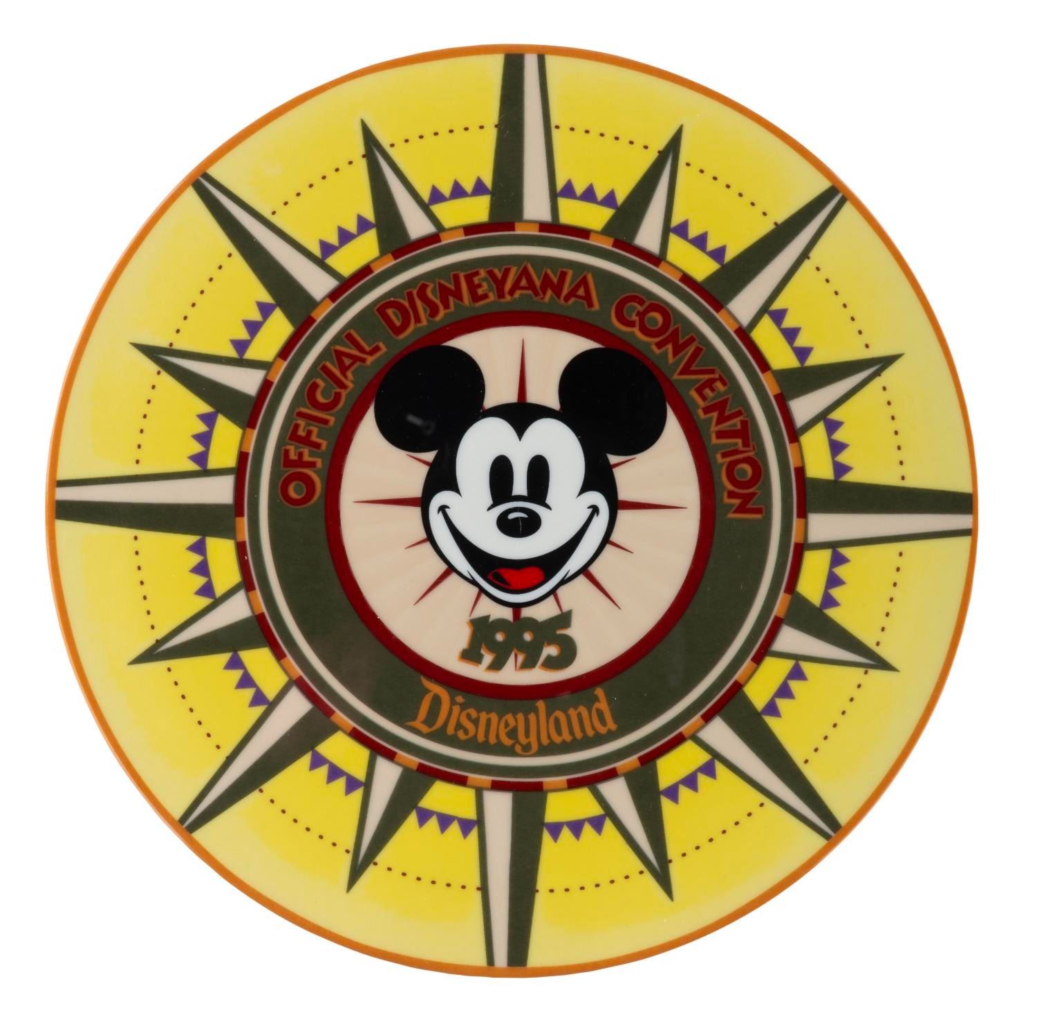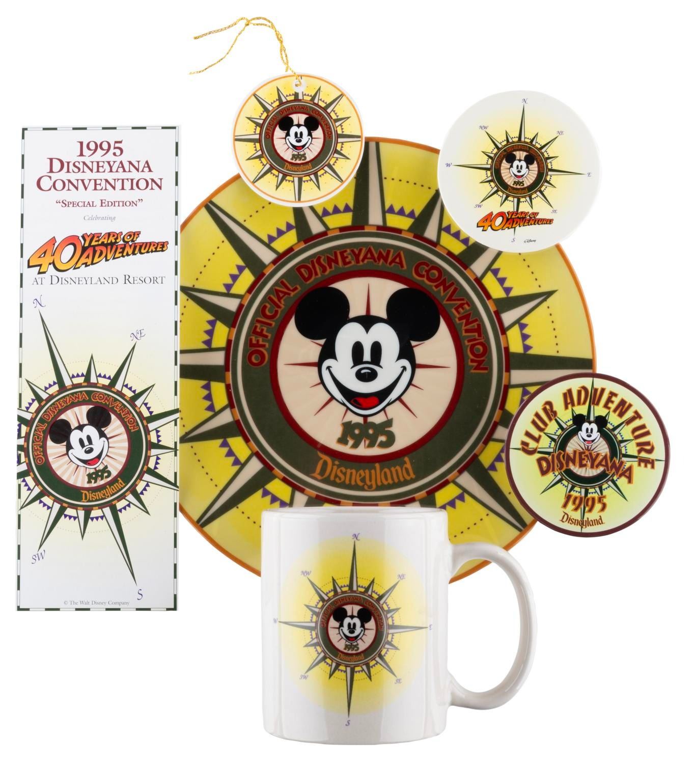 (Disneyana, 1995) A collection of six souvenirs from the 1995 Disneyana Convention with a “40 Years of Adventure” theme. Included are a mug, two buttons, an ornament, and a limited edition 1500 decorative plate, and a flyer promoting the convention. Measuring up to the 8.5” diameter plate, the collection is in very good condition with very light wear from display.