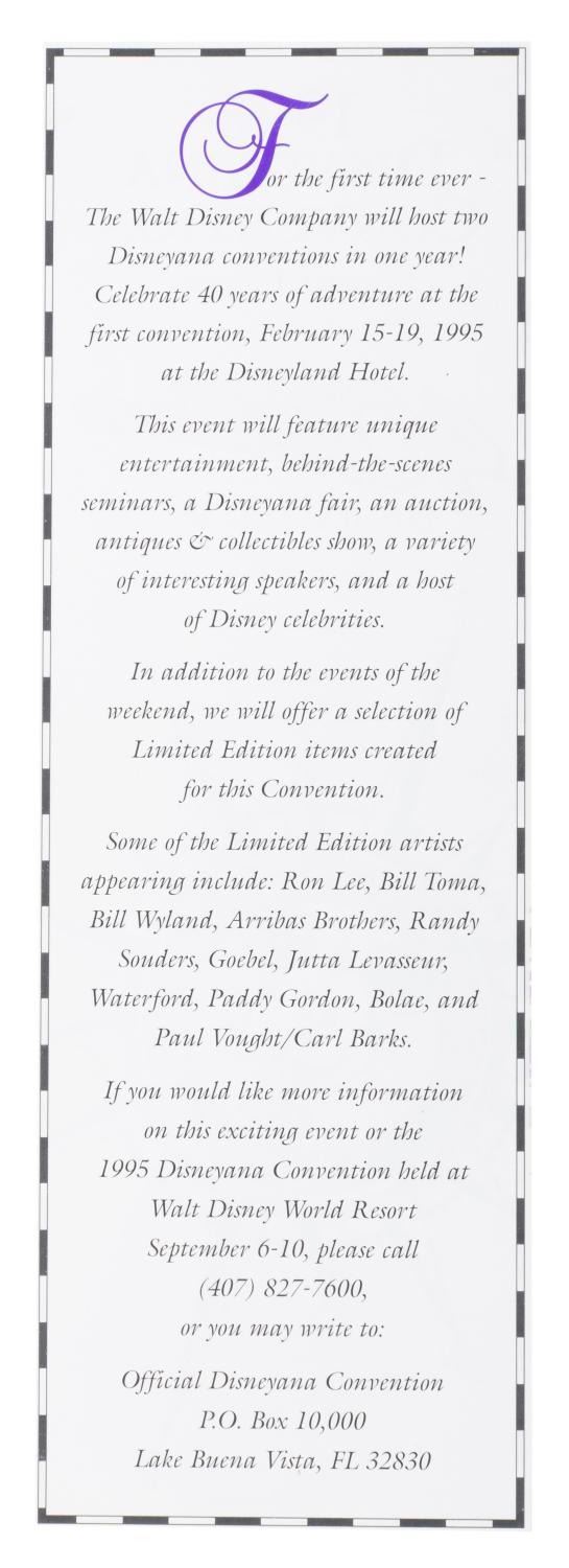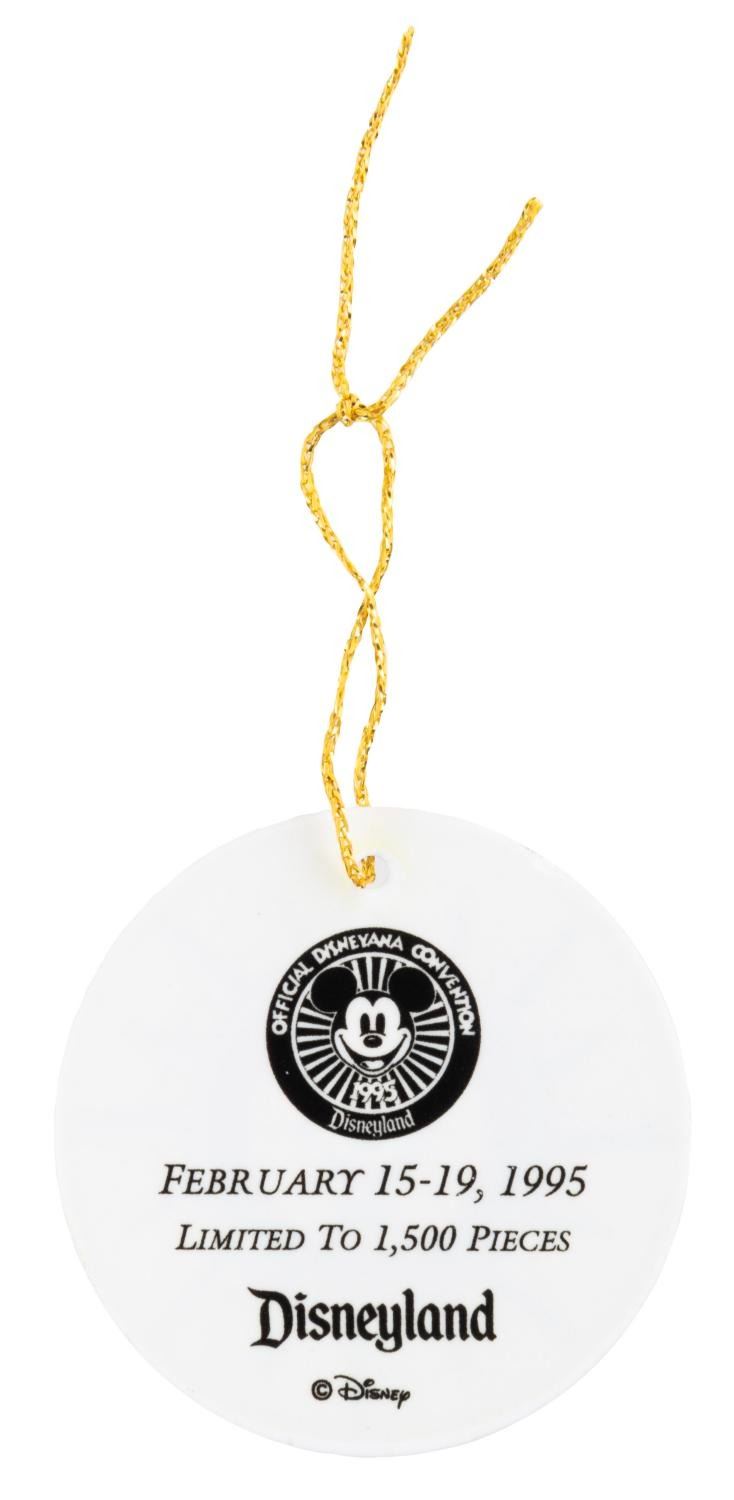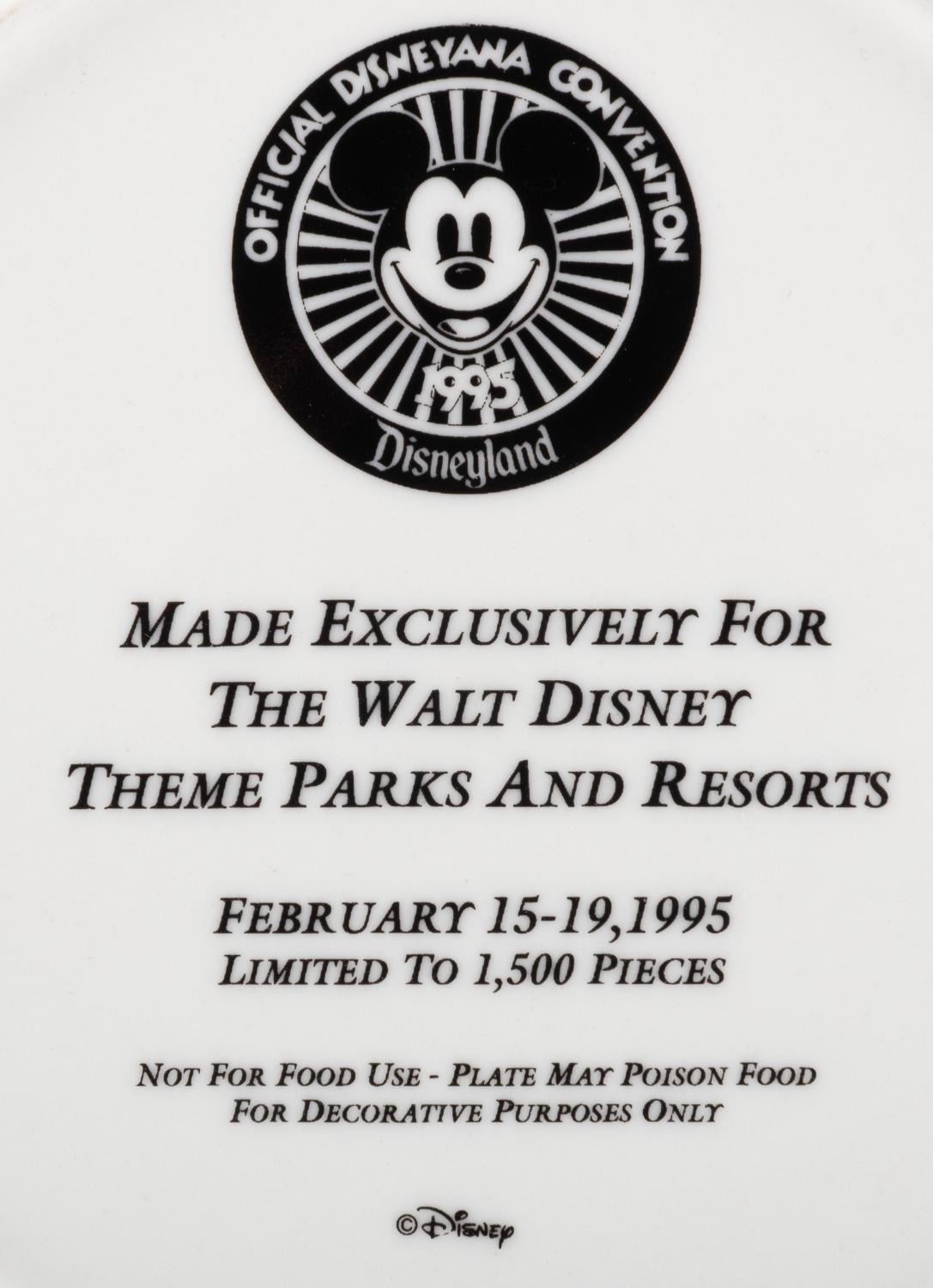 (Disneyana, 1995) A collection of six souvenirs from the 1995 Disneyana Convention with a “40 Years of Adventure” theme. Included are a mug, two buttons, an ornament, and a limited edition 1500 decorative plate, and a flyer promoting the convention. Measuring up to the 8.5” diameter plate, the collection is in very good condition with very light wear from display.