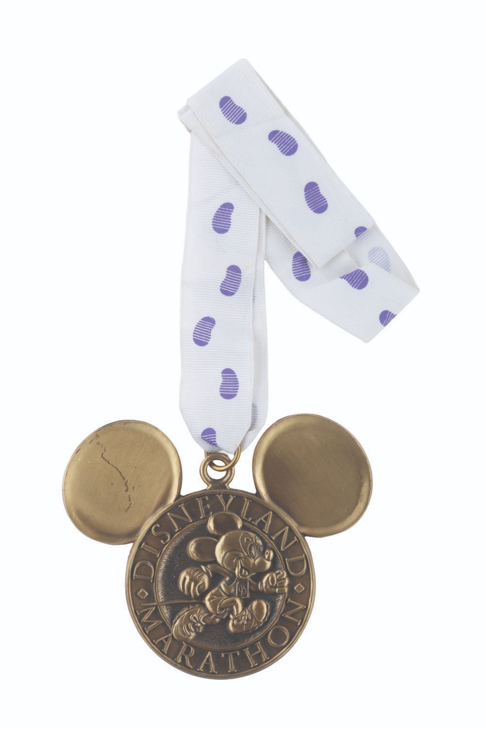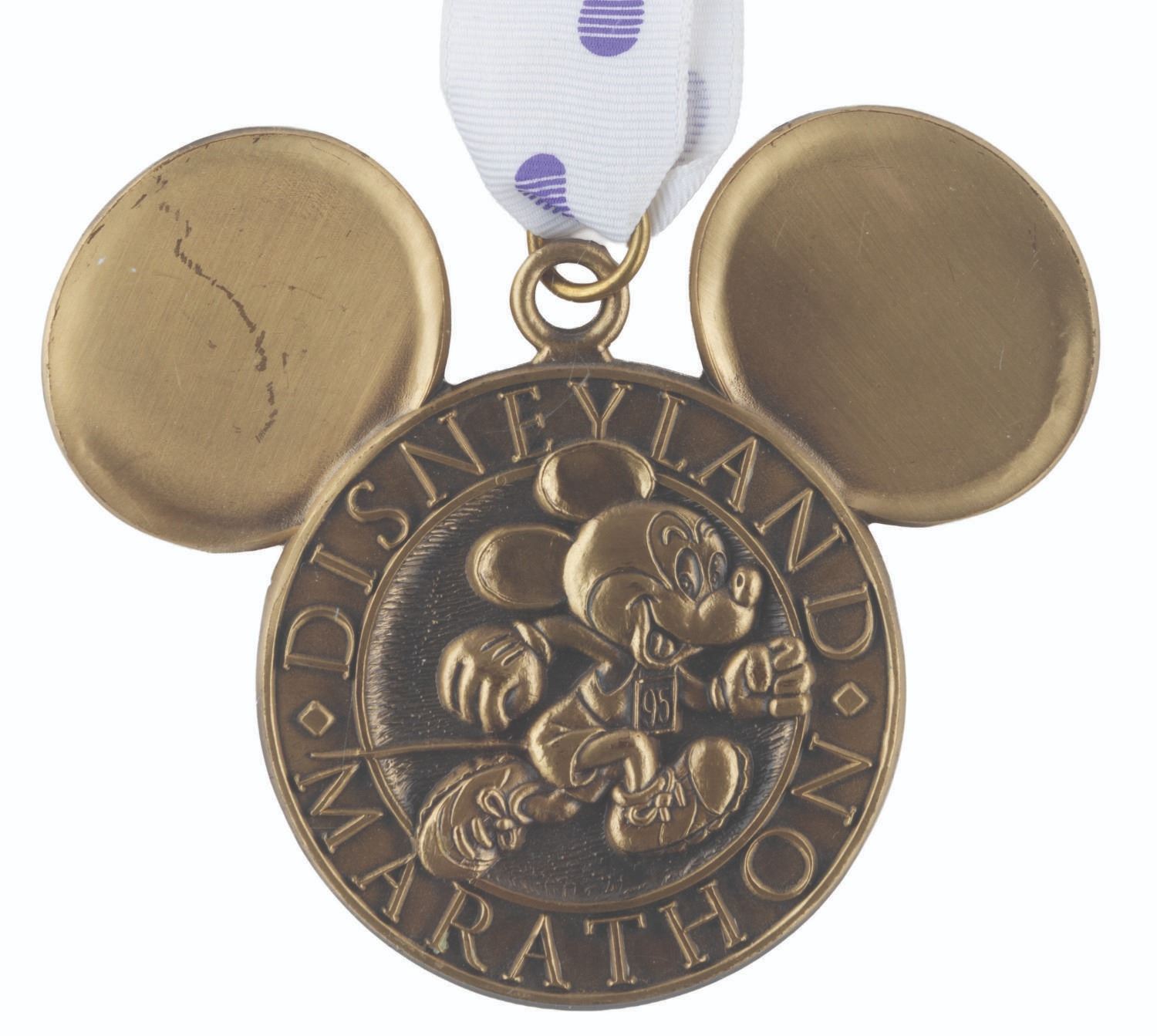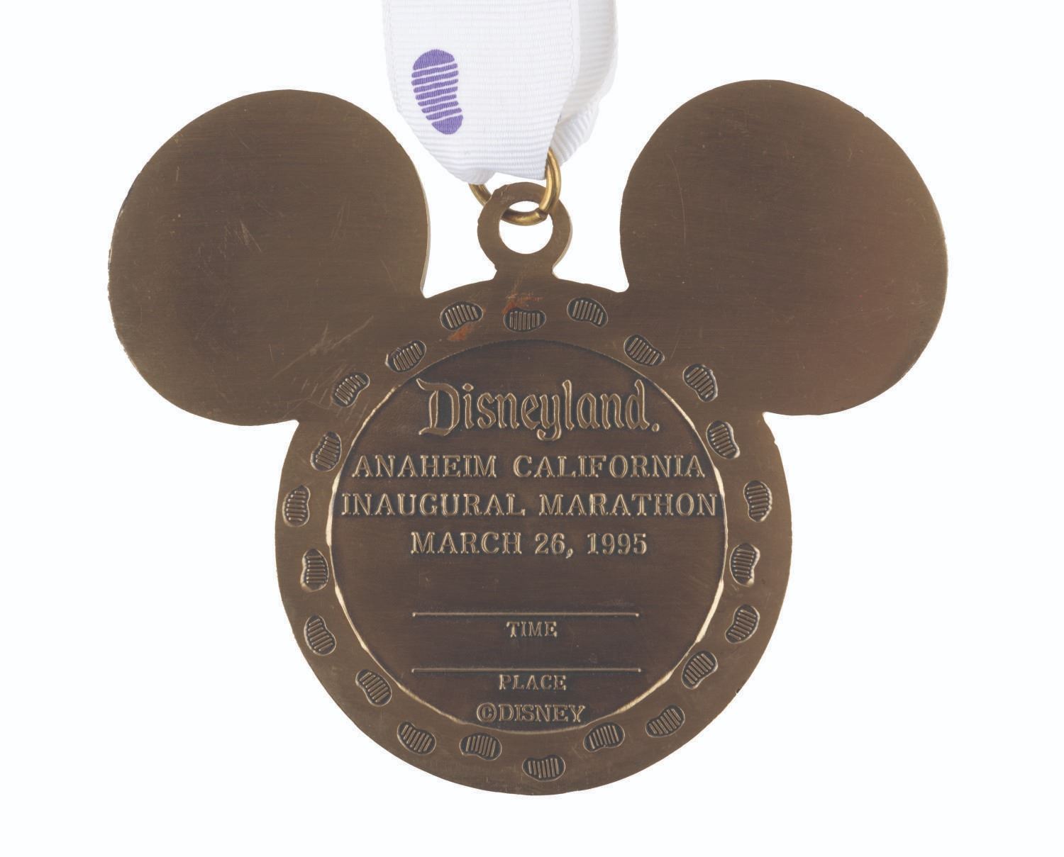 (Disneyland, 1995) A participant medal from the first Marathon run at Disneyland on March 26, 1995. The heavy medallion has not been marked with participant information and comes with a lanyard decorated with footsteps. Measuring 3.5" x 4.25", the medal is in very good condition with some scuffs and scratches.