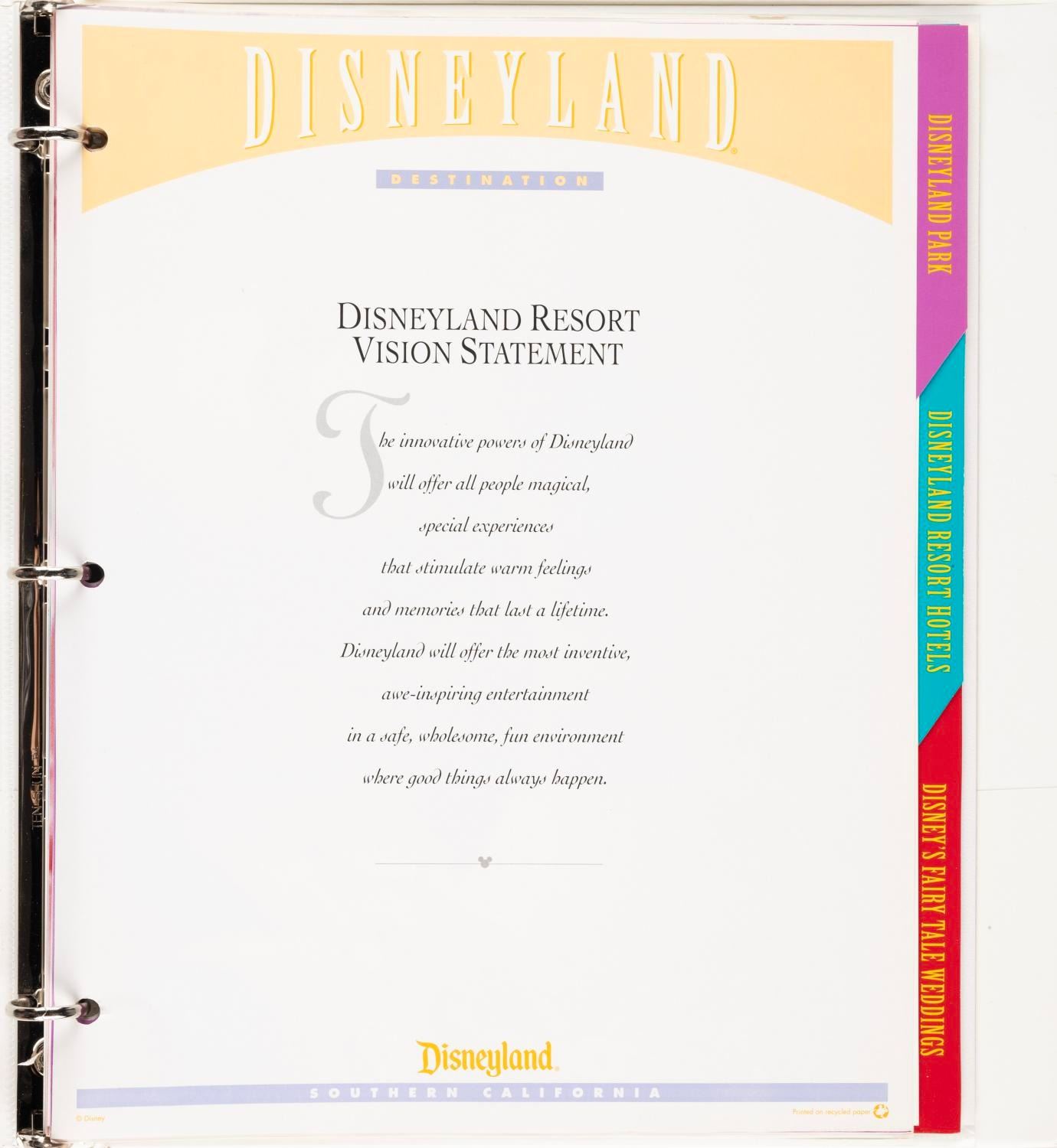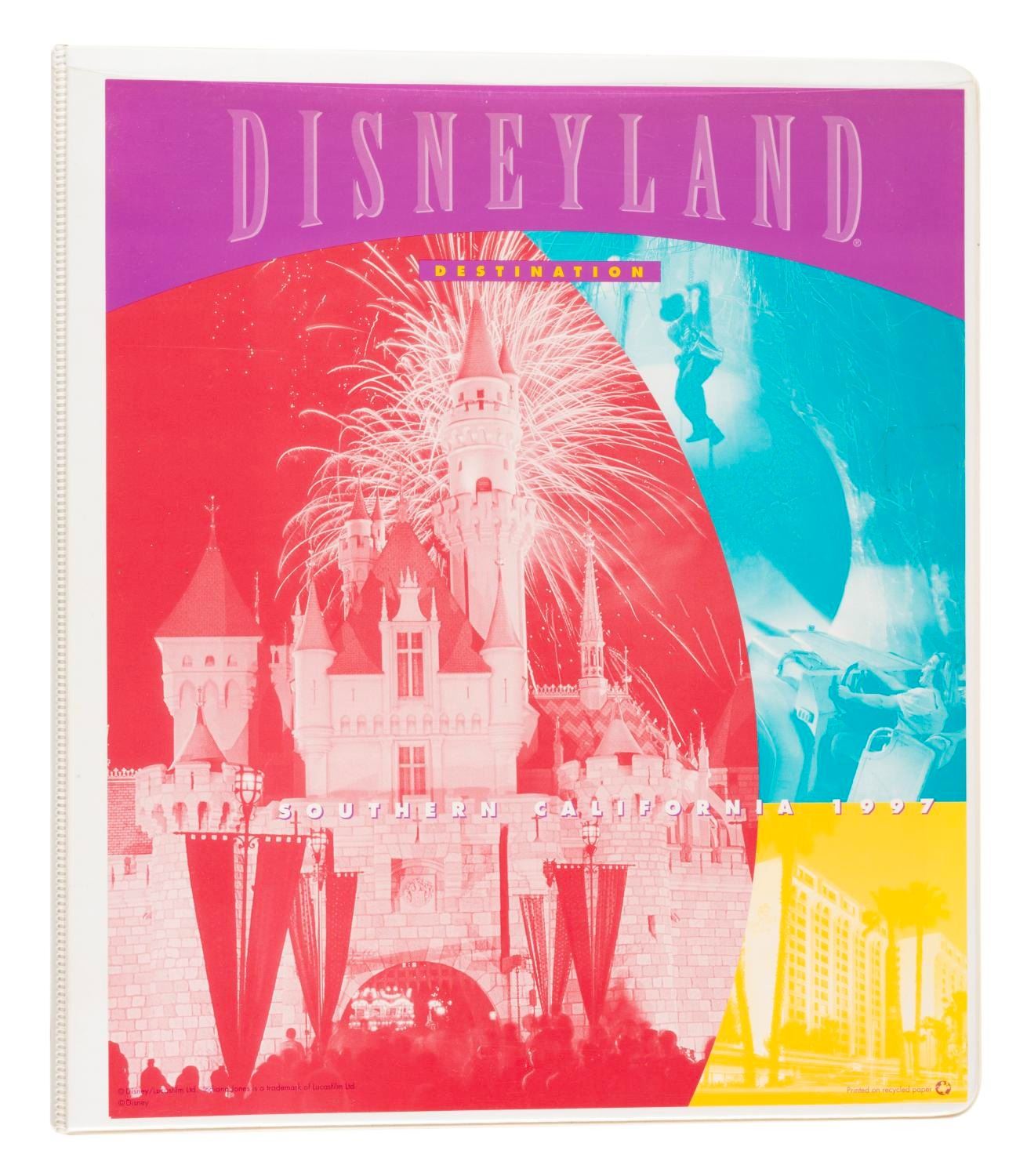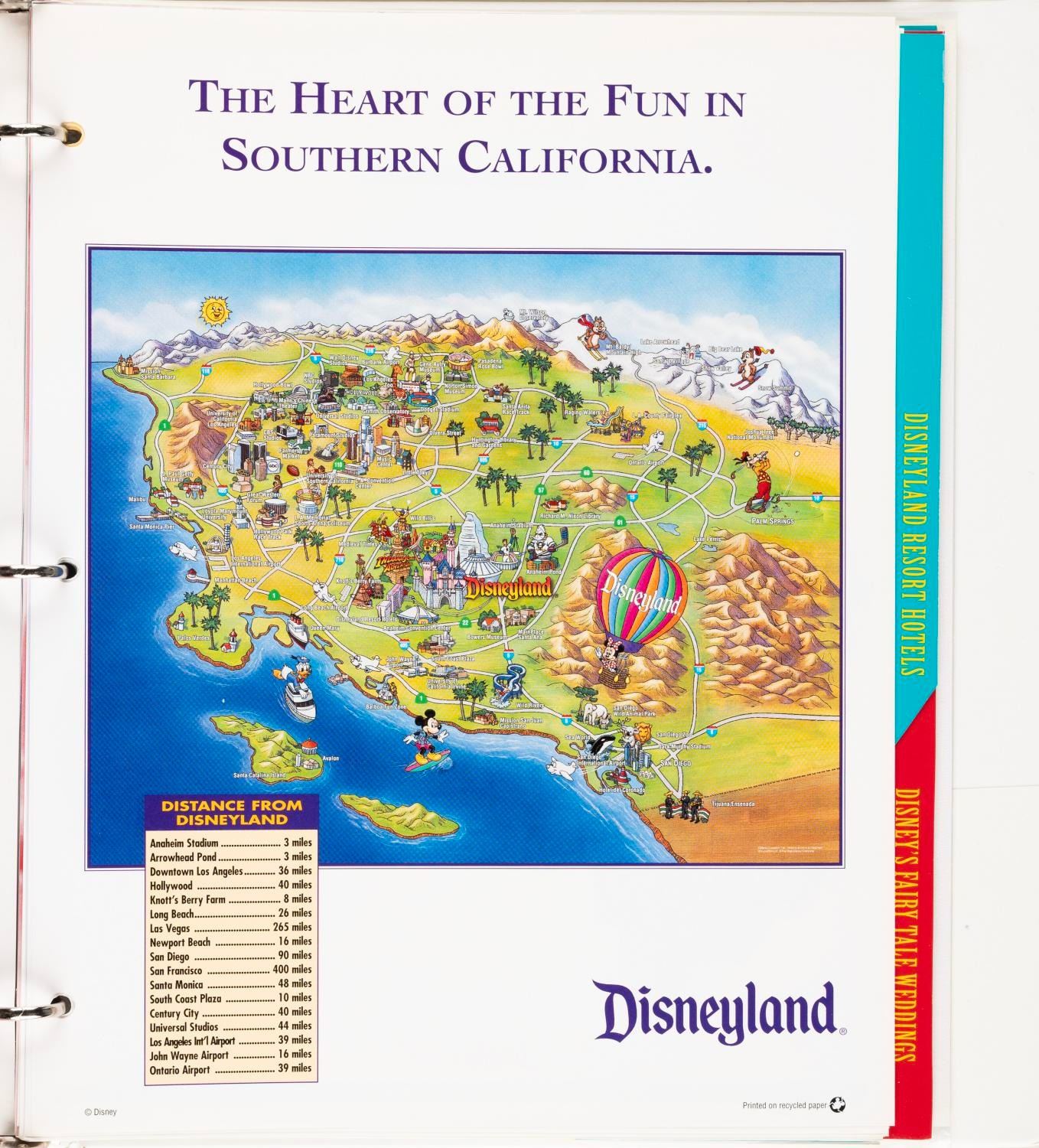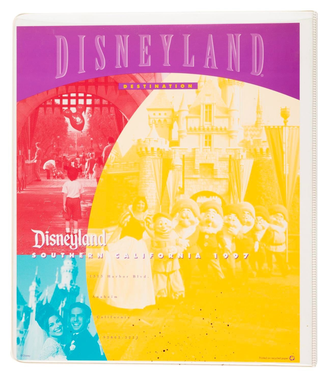 (Disneyland, 1997) A binder containing information on the Disneyland Resort, surrounding area, and wedding packages. Measuring 10” x 11.5”, the binder is in very good condition with light creases and wear.