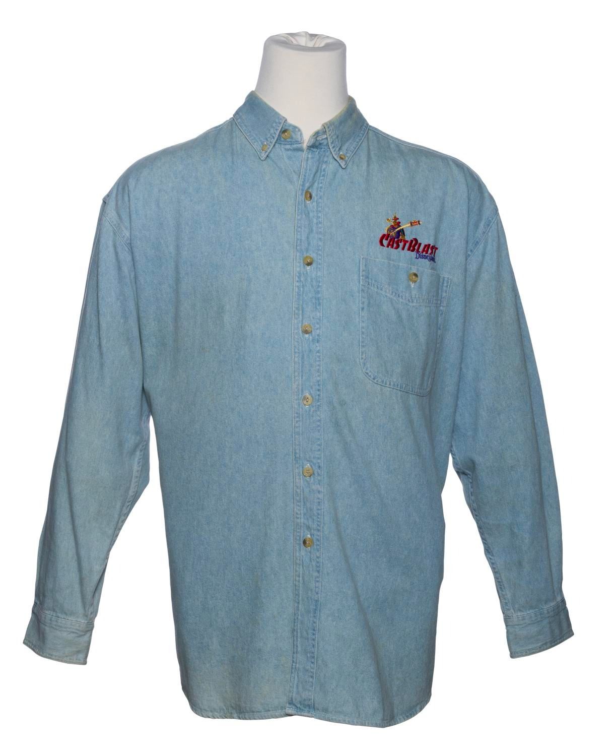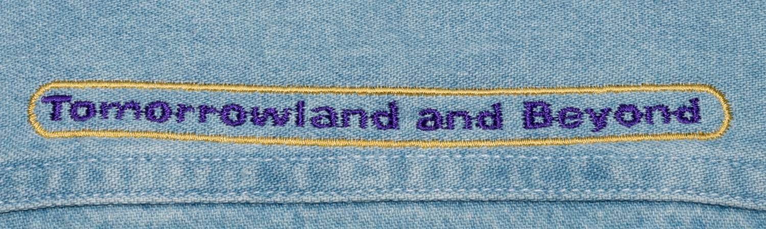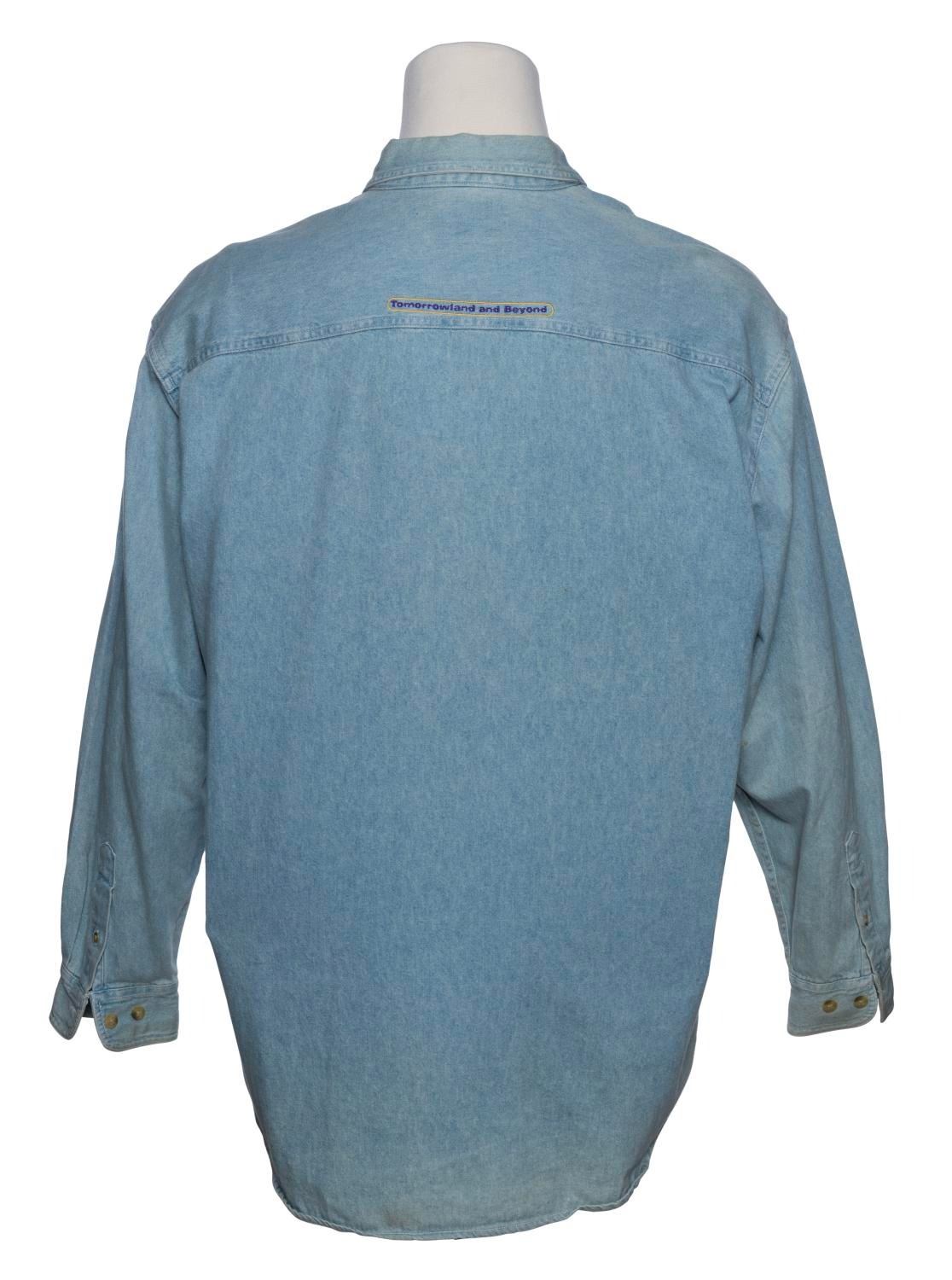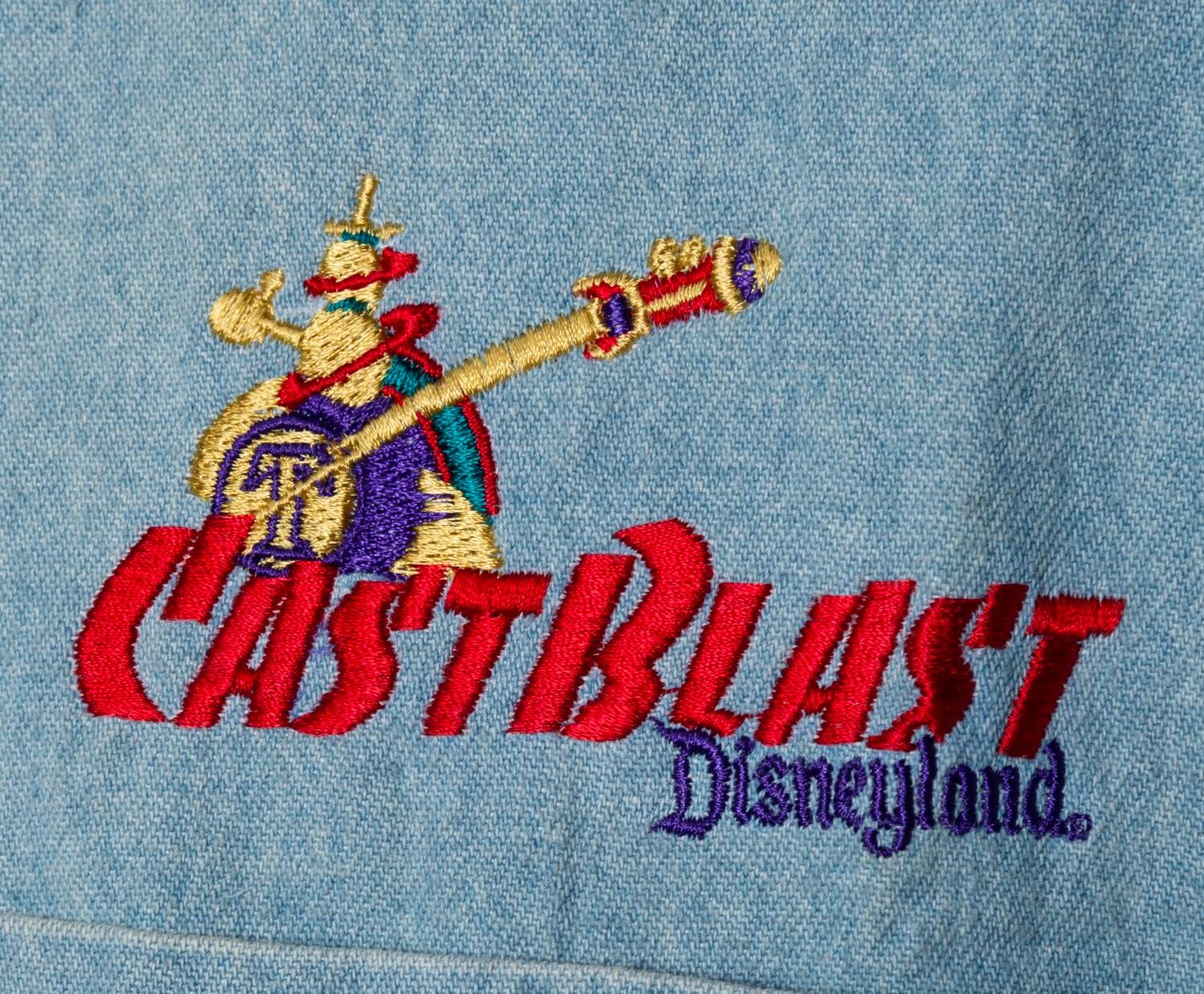 (Disneyland, 1998) A Disneyland Cast Blast souvenir shirt featuring embroidered Astro Orbiter over Tomorrowland. Measuring a size "XL," this shirt is in good condition with some yellowing, discoloration, and wear.