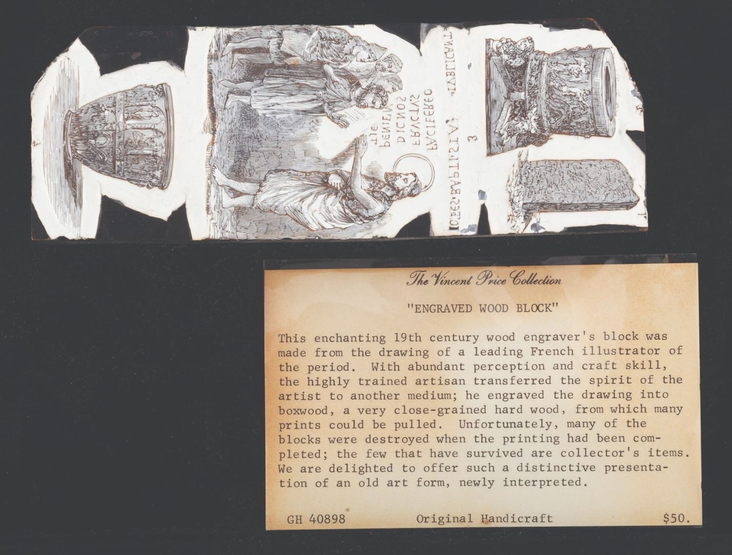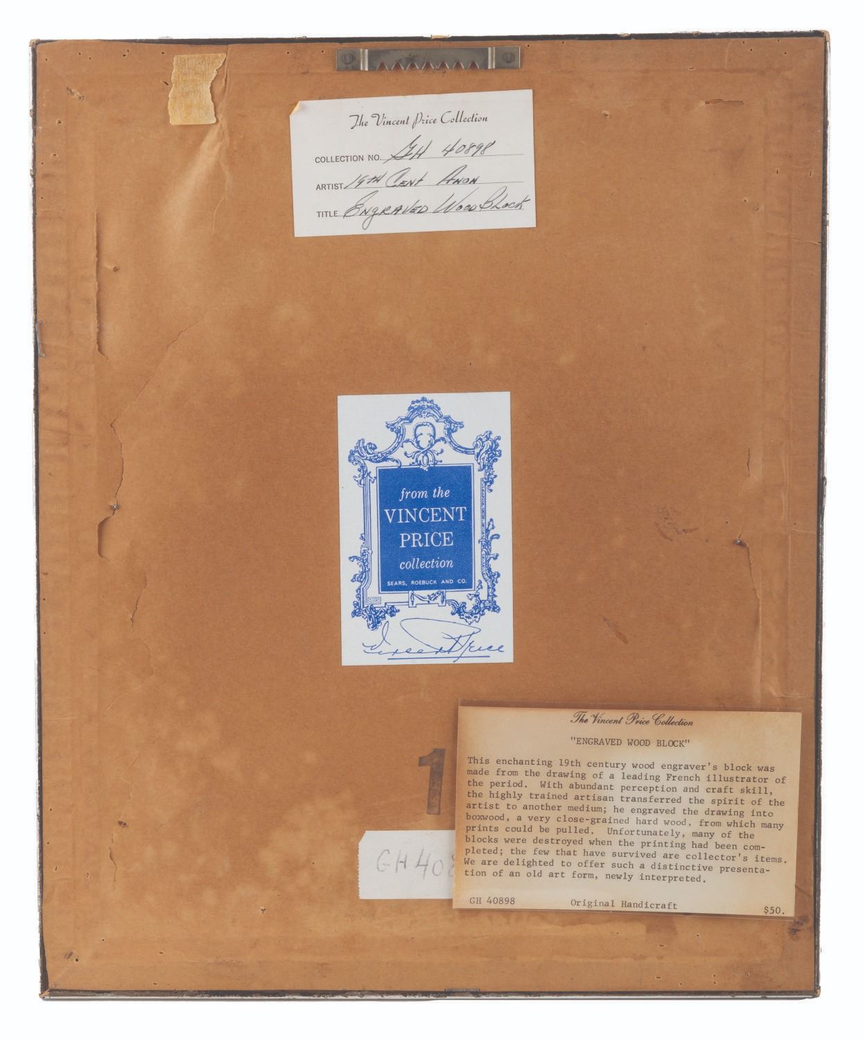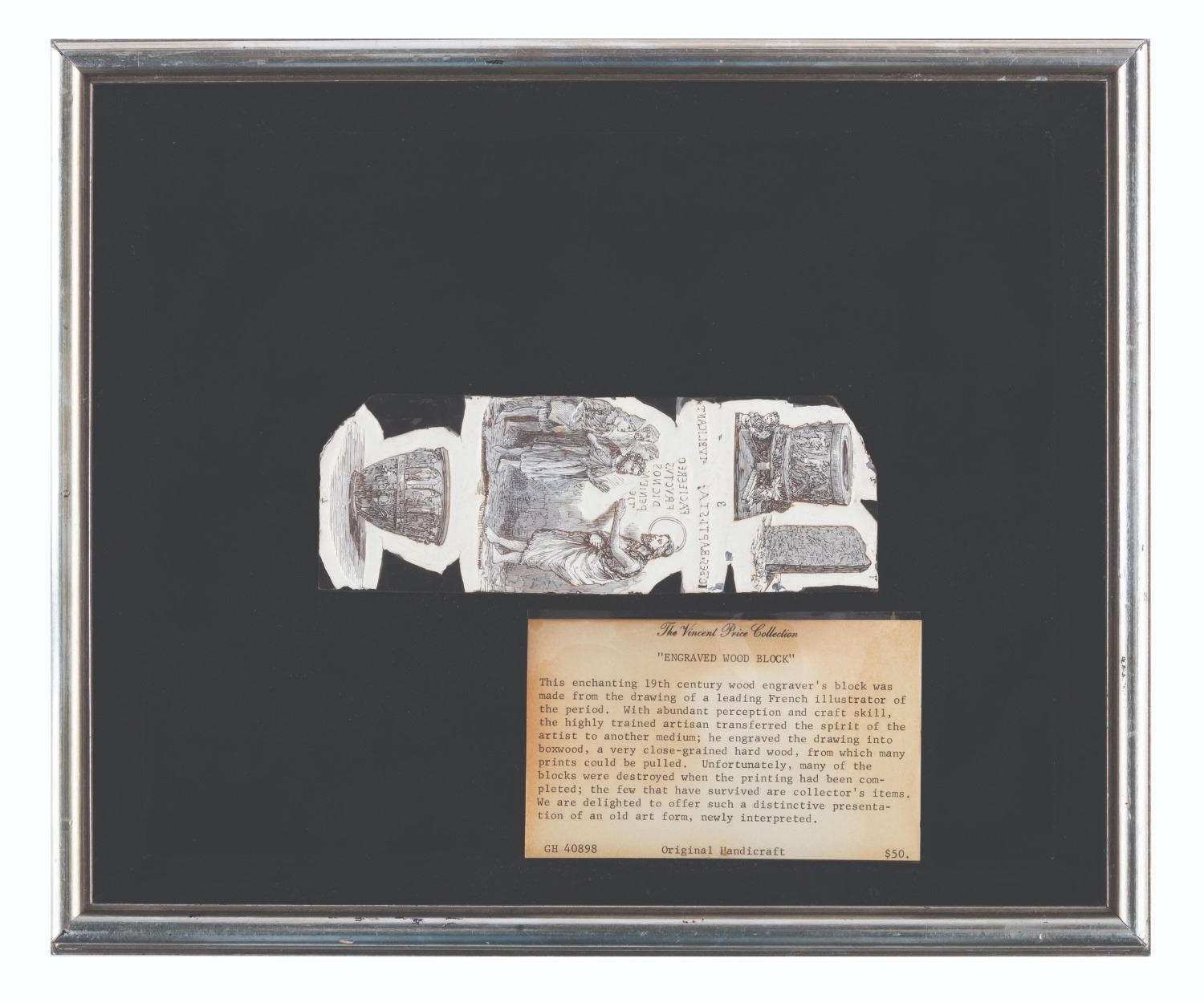 (Vincet Price, 1962-71) A 19th-century French printing wood block in a display box from "The Vincent Price Collection.” An avid art collector himself, Price partnered with Sears to sell artworks and antiquities through their catalog. The back includes the Vincent Price Collection stickers, and a hand-typed card describing the piece. Accomplished in hardwood, the wood block measures 7” x 2.5” x 1” and is in fine used condition with light scratches and spots of chipping. The glassless shadow box measures 14” x 11.5” x 1.75” and displays in very good condition, with typical wear from age to the labels on back.