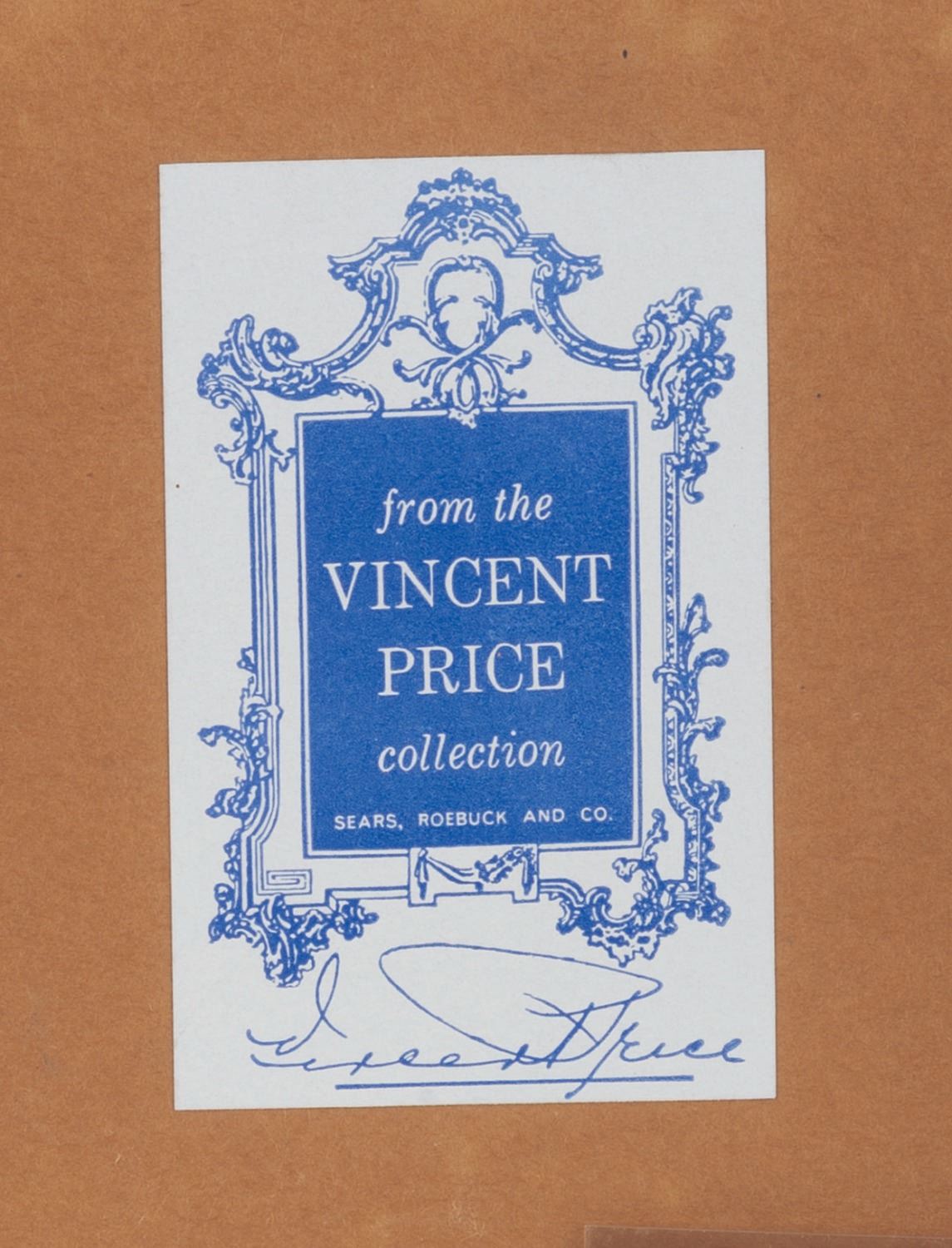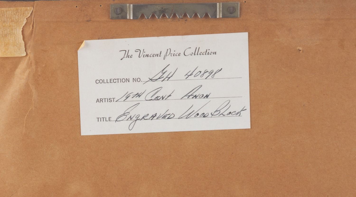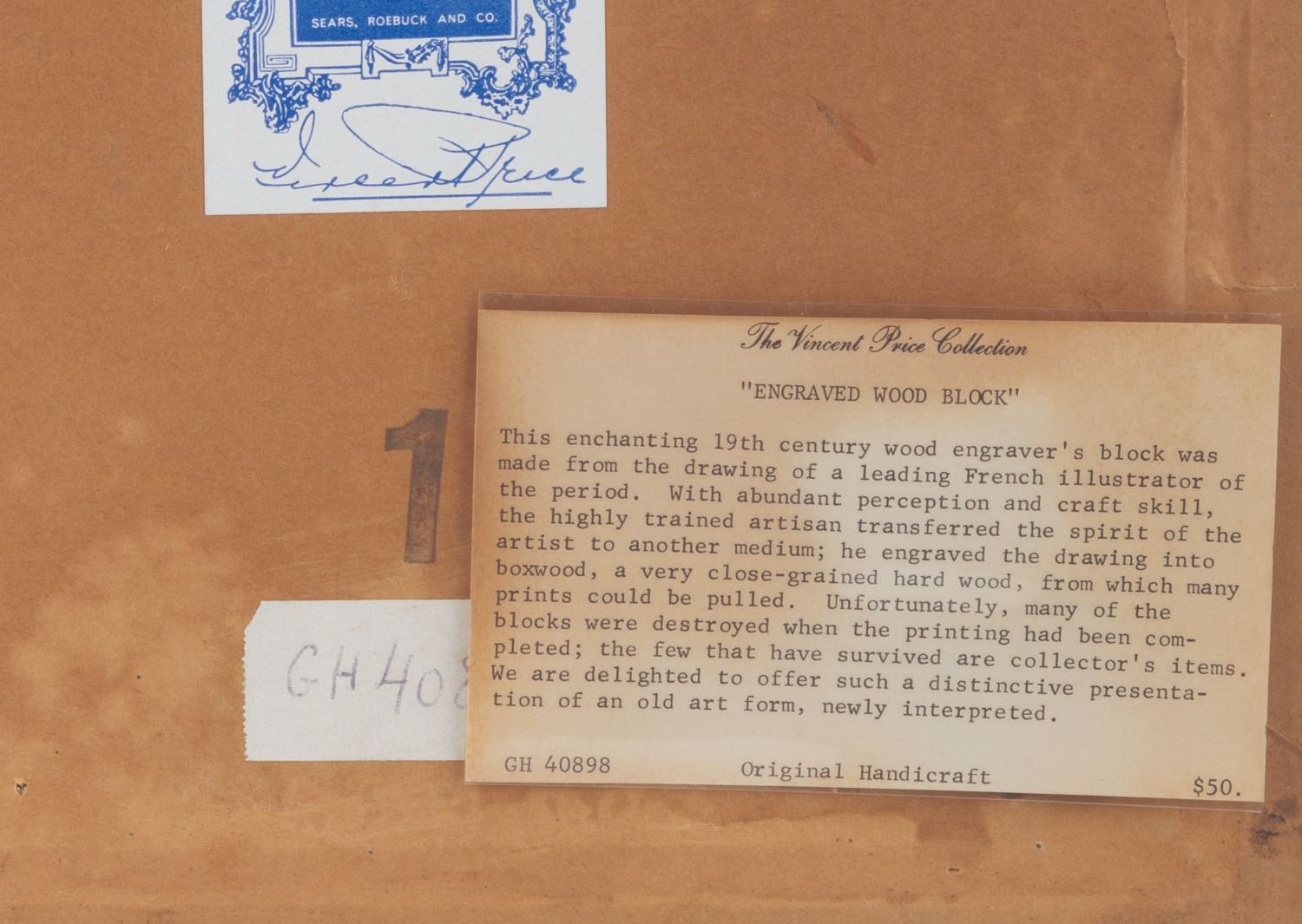 (Vincet Price, 1962-71) A 19th-century French printing wood block in a display box from "The Vincent Price Collection.” An avid art collector himself, Price partnered with Sears to sell artworks and antiquities through their catalog. The back includes the Vincent Price Collection stickers, and a hand-typed card describing the piece. Accomplished in hardwood, the wood block measures 7” x 2.5” x 1” and is in fine used condition with light scratches and spots of chipping. The glassless shadow box measures 14” x 11.5” x 1.75” and displays in very good condition, with typical wear from age to the labels on back.