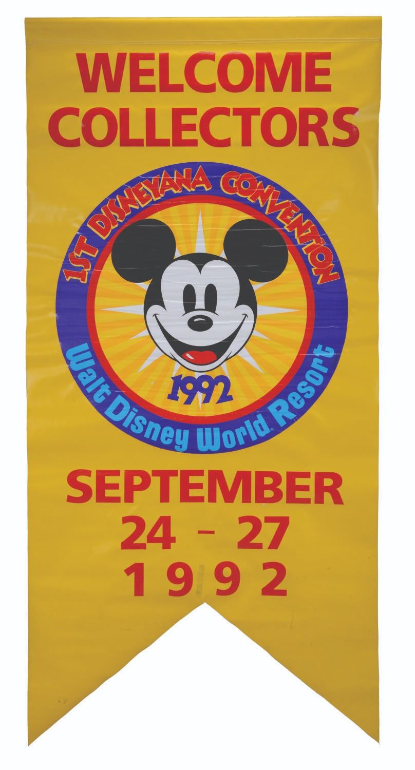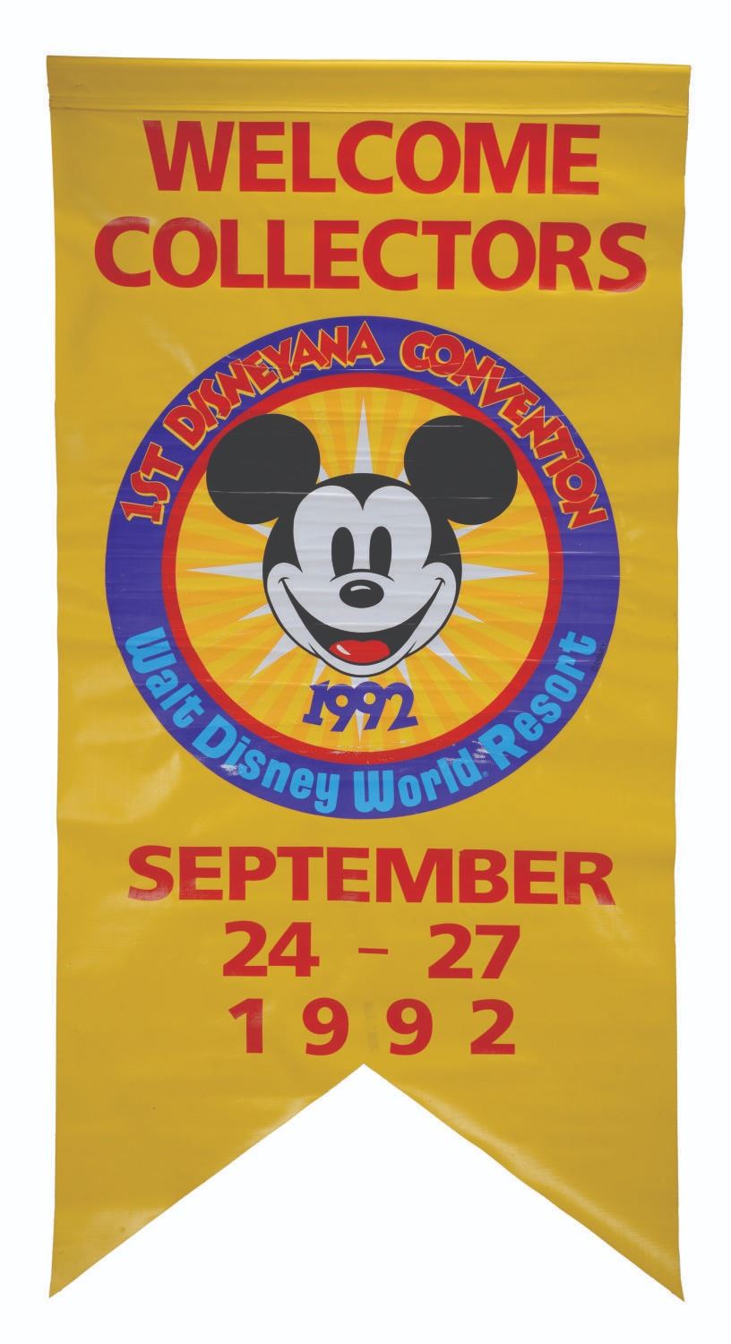 (Walt Disney World, 1992) A large double-sided welcome banner from the 1st Disneyana convention, held September 24-27, 1992, at Walt Disney World. Measuring 36" x 71", the banner is in good condition with heavy rippling from rolled storage, stains, creases, and wear from display.