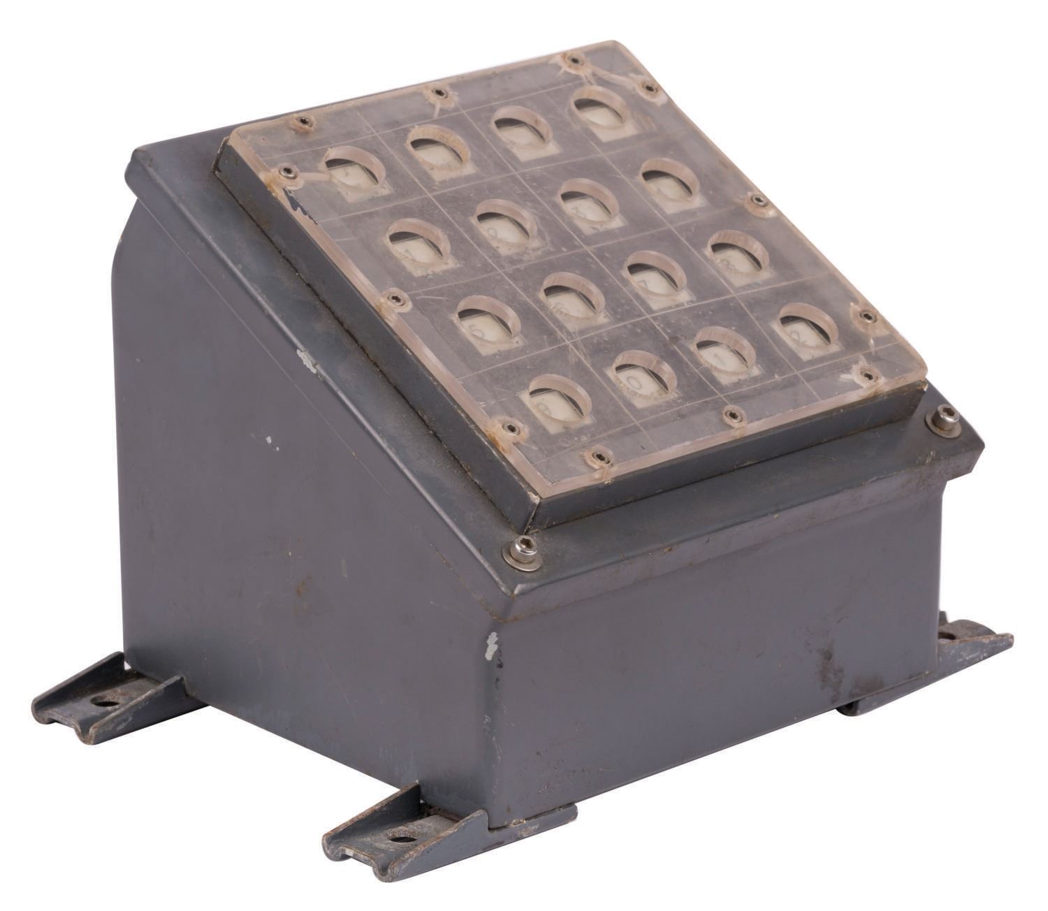(Walt Disney World, 1971-94) An original Pilot's control console box from the 20,000 Leagues Under the Sea attraction at The Magic Kingdom in Walt Disney World. The metal box measures 8" tall and 8.25"x7.5" and is outfitted with (16) buttons, (12) of which are labelled with various points along the track including Dive, Atlantis, Squid, Surface, and more. These buttons were activated by the Pilot, initiate pre-recorded spiels along the route. The component was removed during a repair, rehabilitation, or upon the attraction's closure in 1994, and is in very good Park-used condition with expected wear from handling and age.