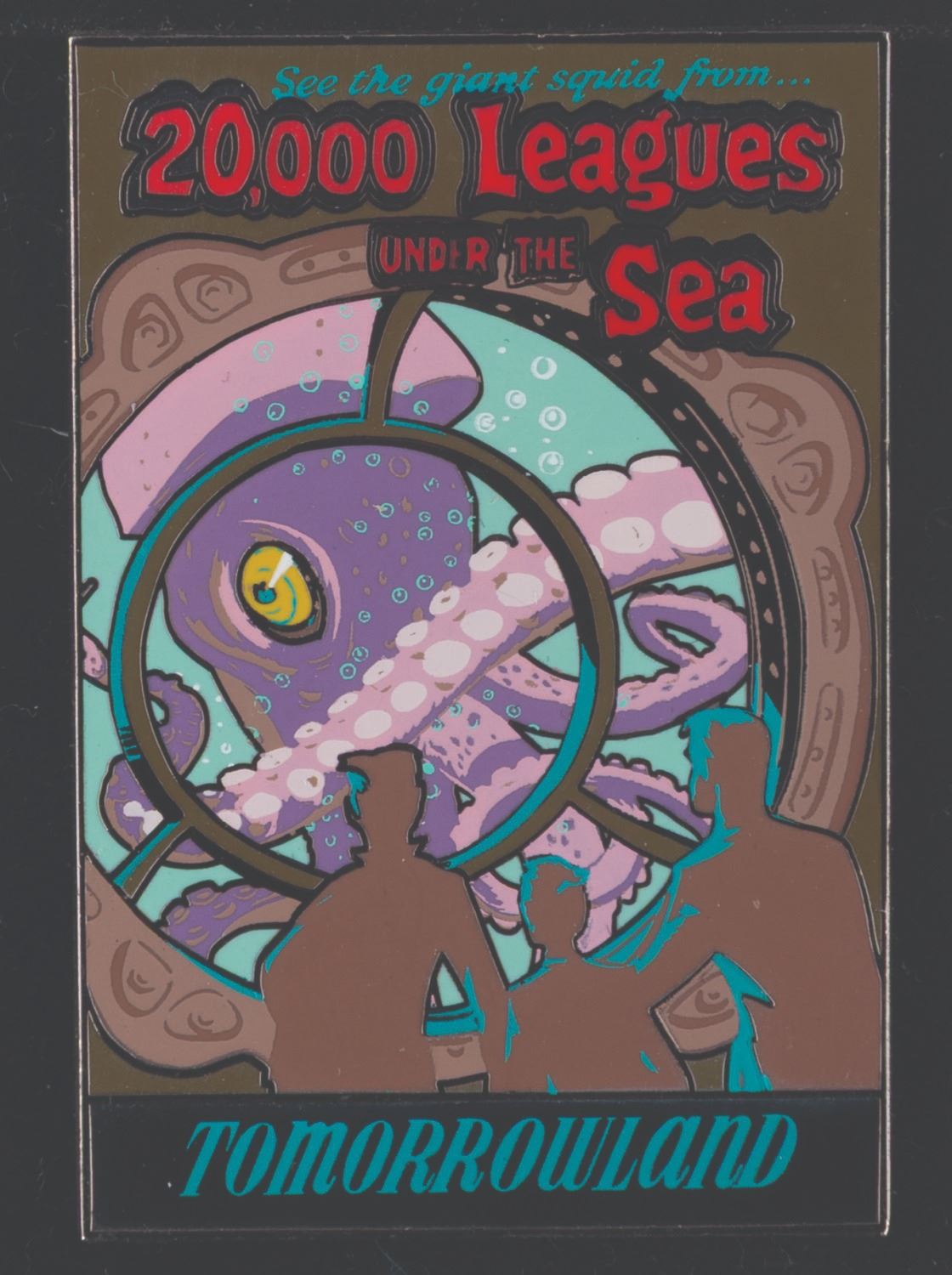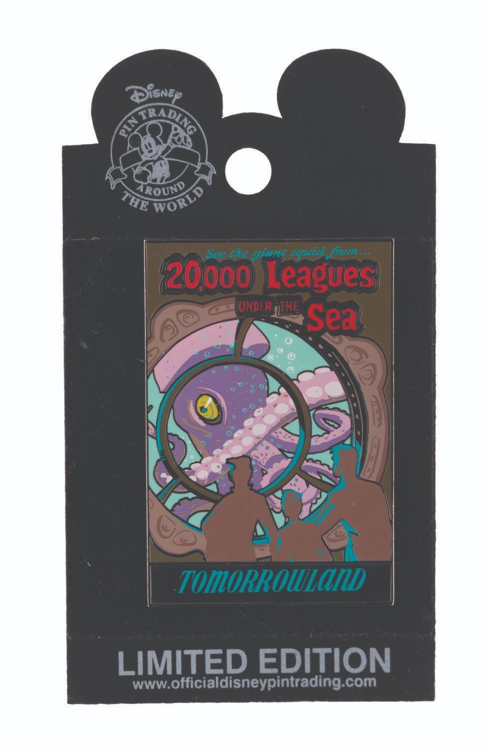 (Disneyland, 2003-04) A limited edition pin of the 20,000 Leagues Under the Sea attraction poster, originally designed by Bjorn Aronson. Part of a limited edition of 1500, the pin measures 1.25” x 2” on its original 2” x 3.5” backing card and is in fine condition.