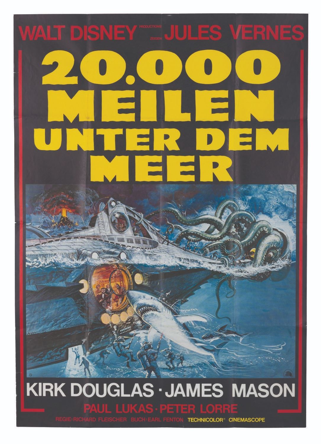 (Disney, 1976) An original A0 poster for the 1976 German re-release of Walt Disney's "20,000 Leagues Under the Sea." Measuring 47" x 33", the poster displays in very good condition, with light edge wear including a few small tears, creases along original folds, and slight separation at two center fold points.
