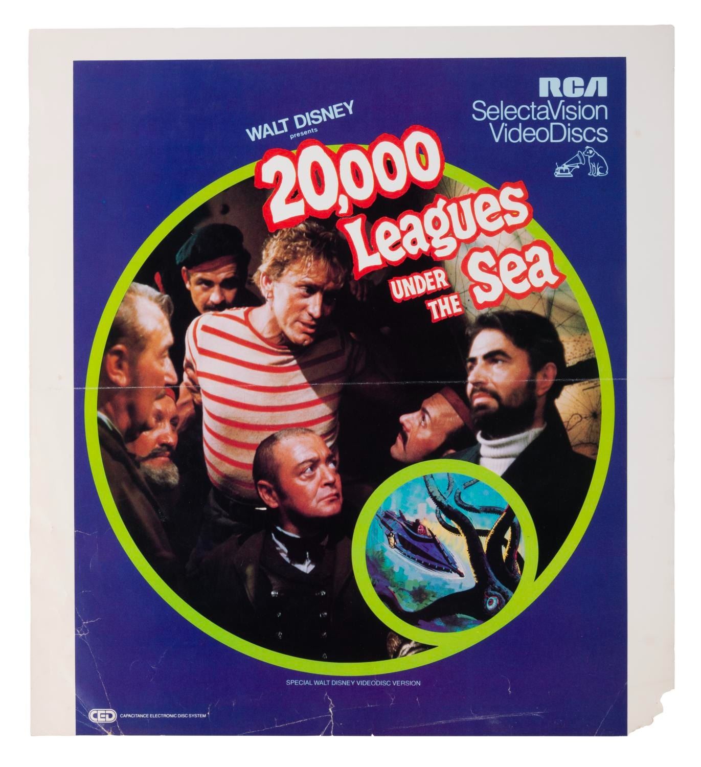 (RCA/ Disney, 1980) A rare poster featuring the cover art for the RCA Selectavision VideoDisc release of Walt Disney’s "20,000 Leagues Under the Sea." Measuring 12.75" x 14", the poster is in good condition with a horizontal fold, small creases, a 1" tear in the bottom edge, and a 1" tear off the bottom right corner.