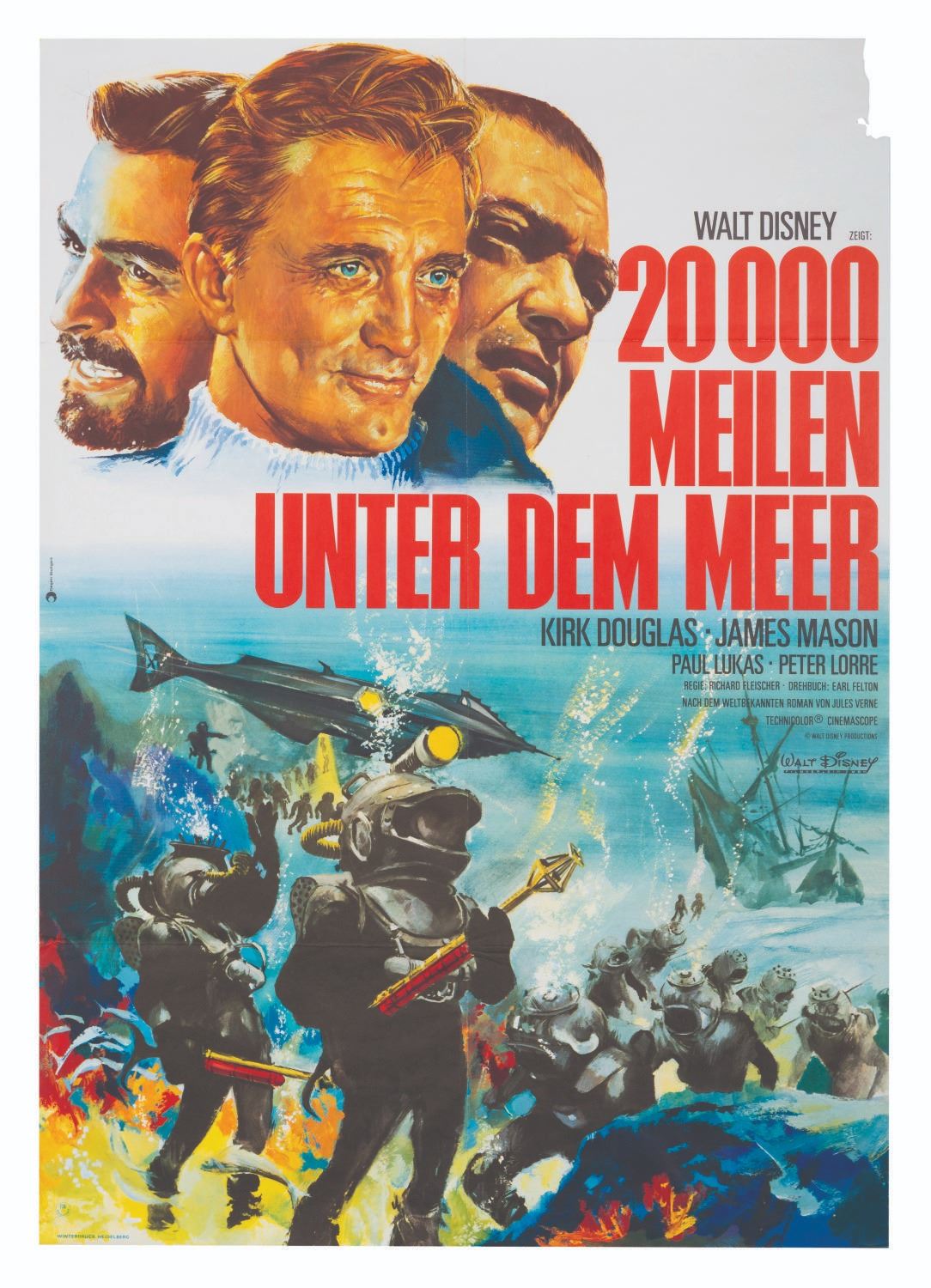 (Disney, 1961) A very rare German reissue A1 poster for "20,000 Leagues Under the Sea." This poster features original art painted specifically for the German market by artist Kurt Degen. Measuring 23” x 33”, the poster displays in very good condition with original folds, a missing 3" x 0.5" piece from the top right corner, and a 1” x 1” V-shaped tear in the top left corner that has been repaired with tape.
