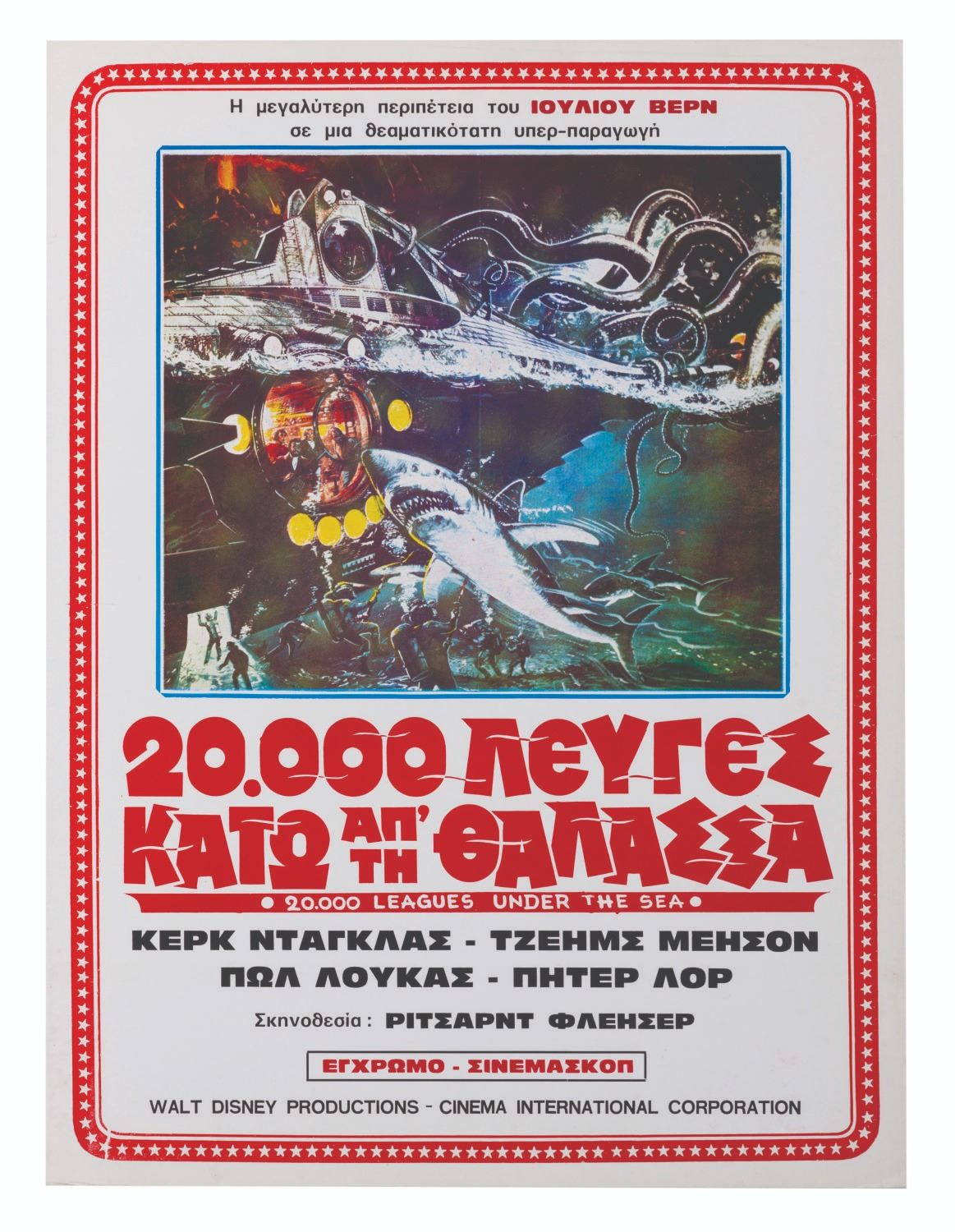 (Disney, 1970s) A rare window card for the Greek re-release of Walt Disney's "20,000 Leagues Under the Sea." Measuring 11.75" x 15.75", the poster has embossed text and is in good condition with creases, light stains, and wear from display.
