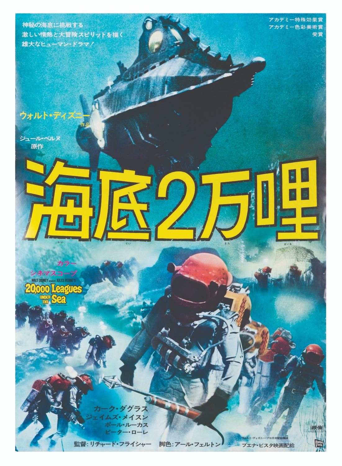 (Disney, 1955) An original theatrical poster for the Japanese release of “20,000 Leagues Under the Sea.” Measuring 20” x 28.5”, the poster is in good condition with creases throughout and edge wear.