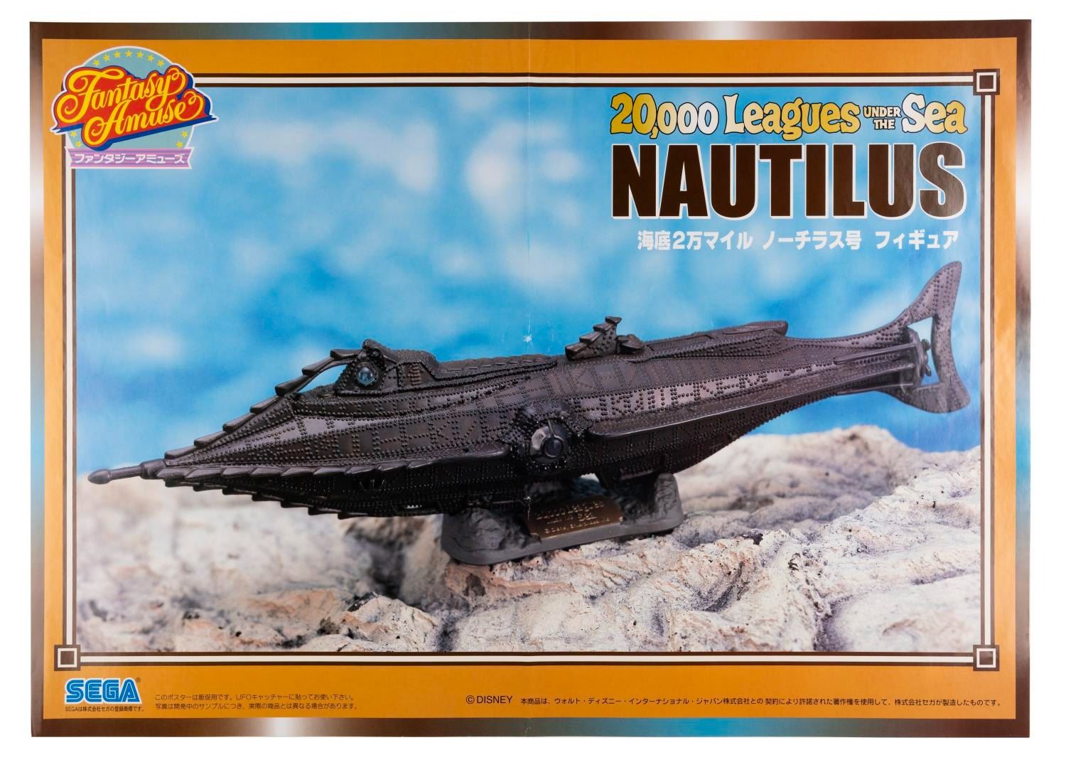 (SEGA, 2002) A Fantasy Amuse arcade chain poster for the Sega Nautilus plastic model, which was issued as a prize in crane game machines. Measuring 28.5" x 20.5", the poster displays in good condition, with a small spot of paper loss at the center of a vertical fold, and light handling wear.