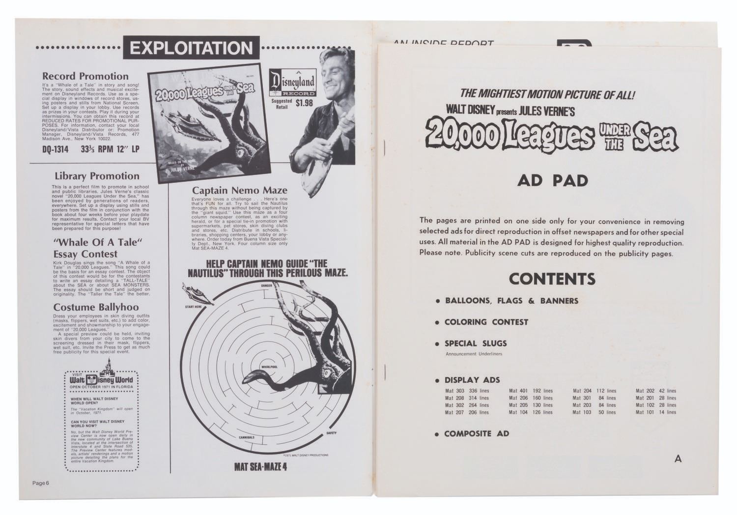 (Disney, 1971) A press book for the 1971 re-release of Walt Disney's "20,000 Leagues Under the Sea. " Included is an ad pad with advertisements, layouts for a balloon order form, and a coloring contest. Measuring 11 " x 14.75 ", the press book displays in good condition with creases, wear, and spotting throughout the interior and back.