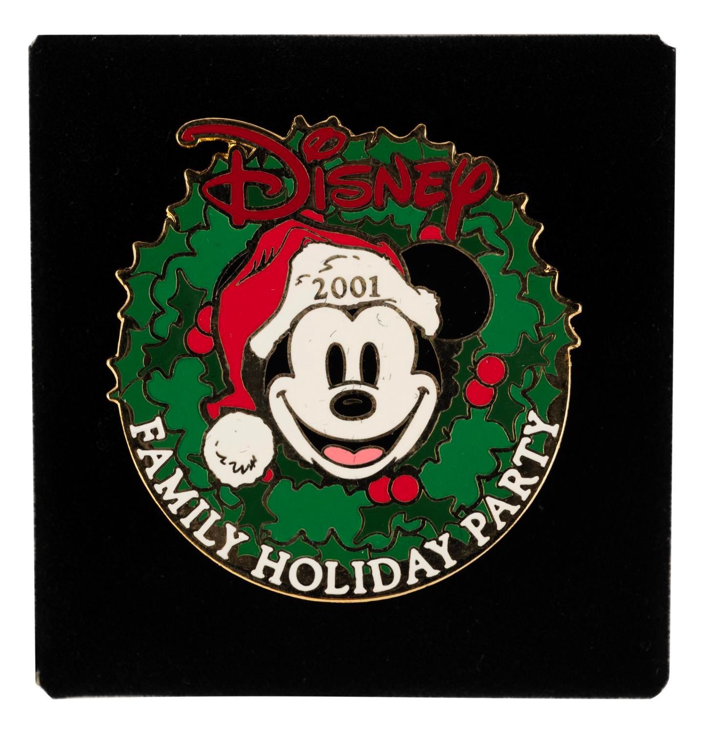 (Disneyland, 2001) A Disney Family Holiday Party souvenir pin featuring a festive Mickey Mouse. A battery-operated sound feature still plays "Jingle Bells," although the battery is near the end of its life. Released in a limited edition of 5,000 this Cast-exclusive pin is in very good condition. The 2.75" x 2.75" original case is in good condition with a small piece of foam adhered to one edge.