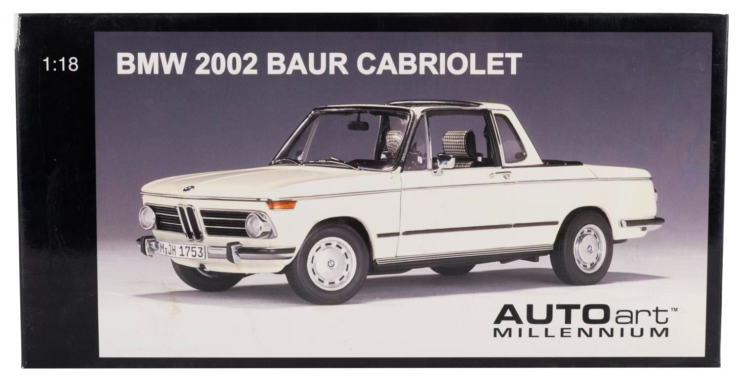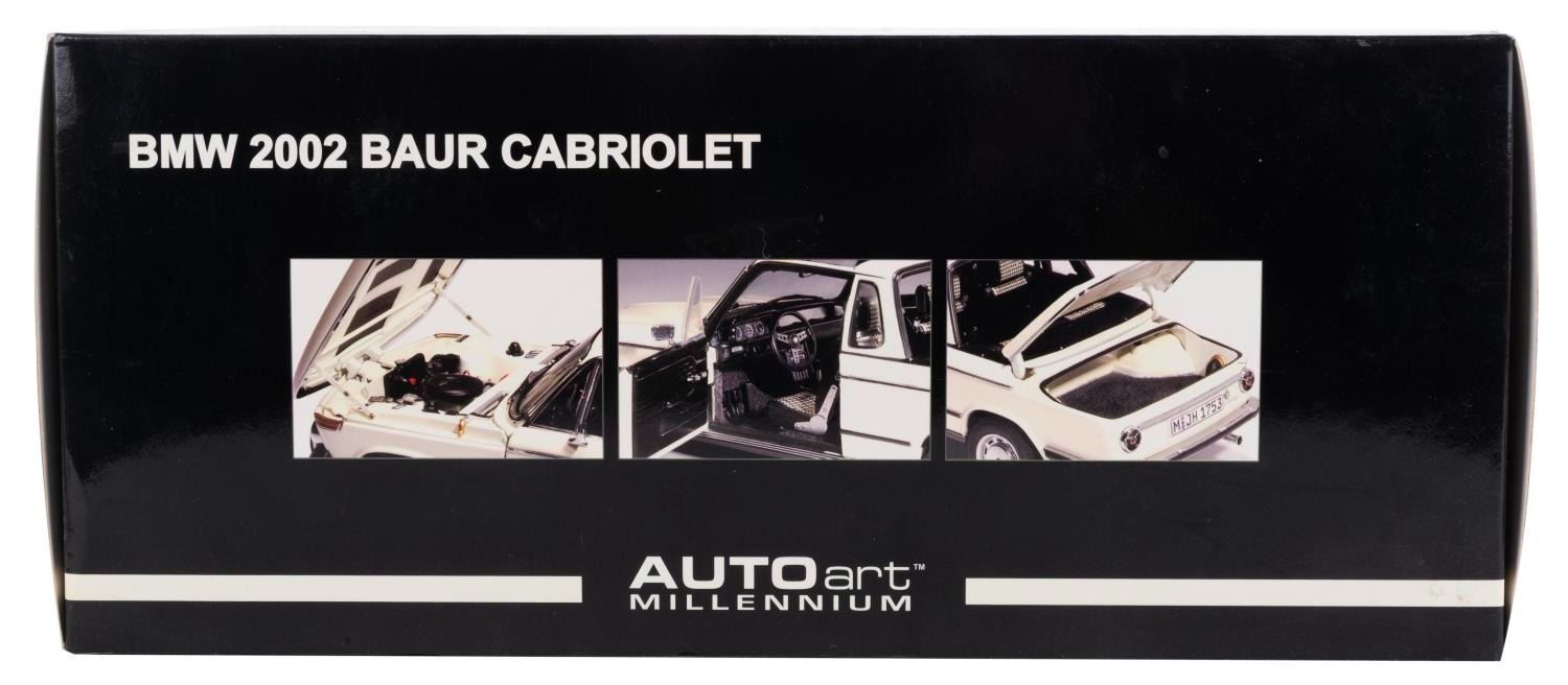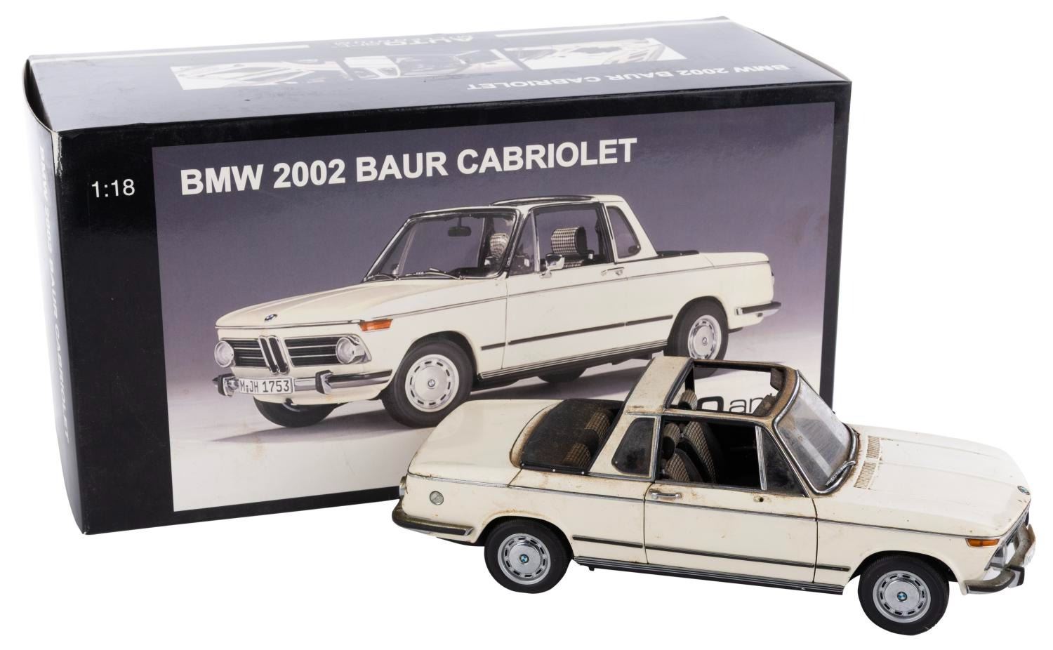 (Gateway Global Limited, 2002) A BMW 2002 Baur Cabriolet 1:18 model car. Measuring 9" x 3.25" x 3.25" tall with its 12.75" x 6.5" x 5.75" original box, the car is in fair condition with heavy stains, scratches, wear, and the passenger side mirror missing.