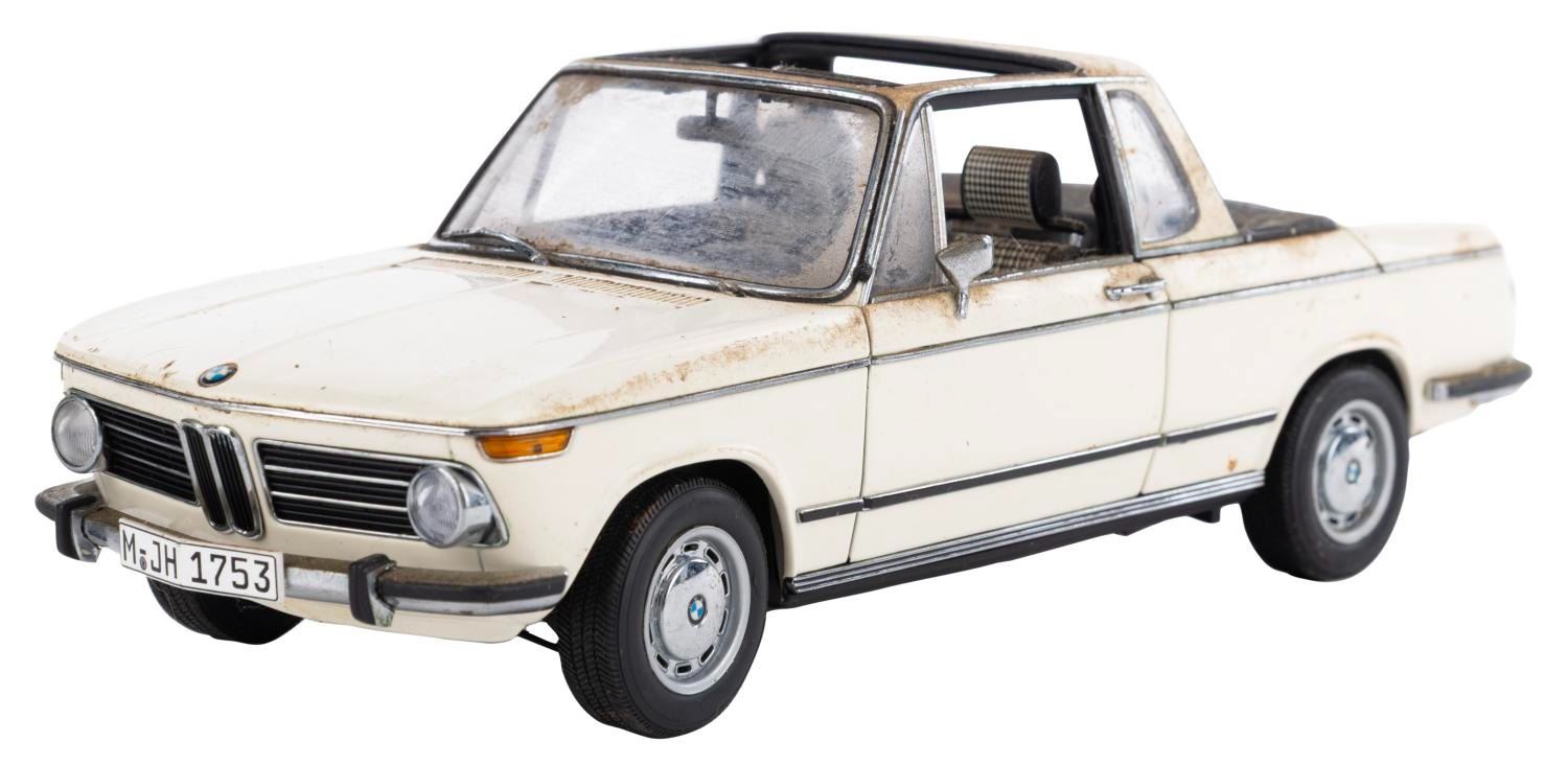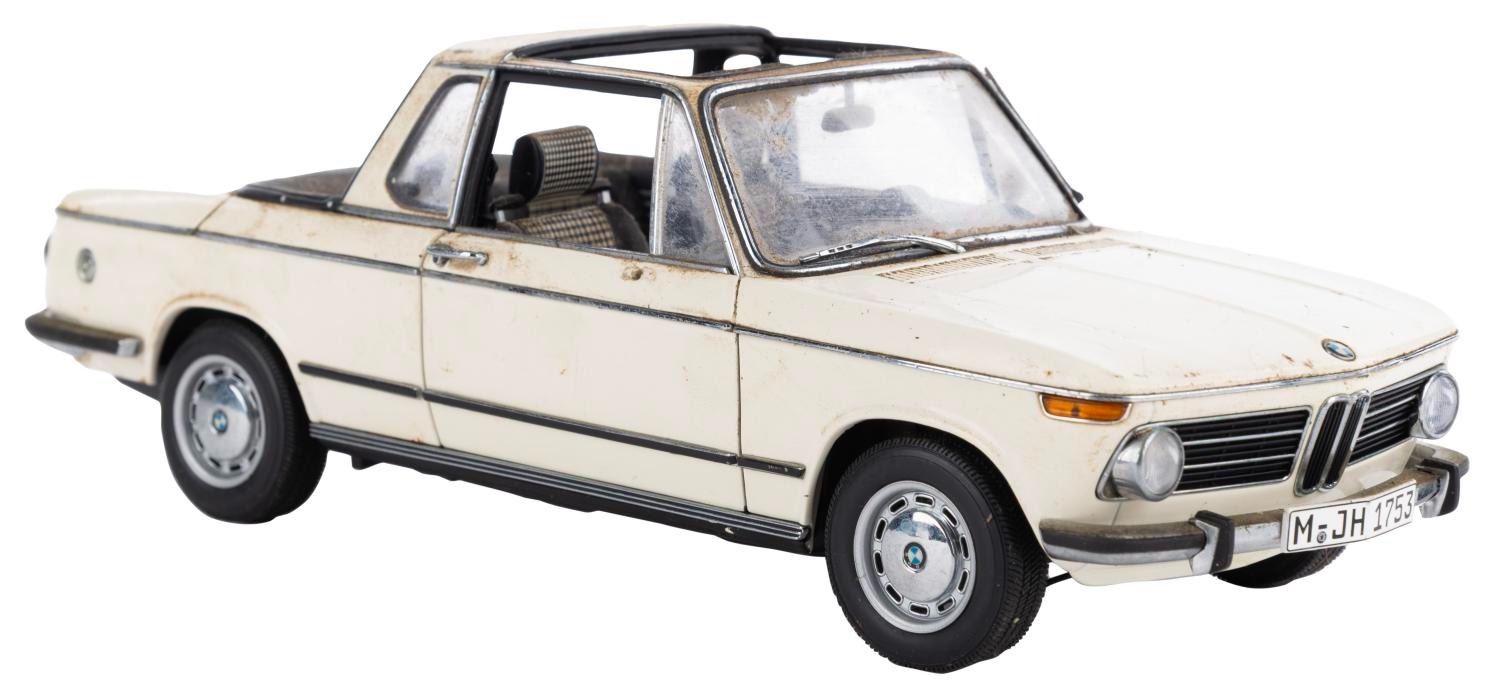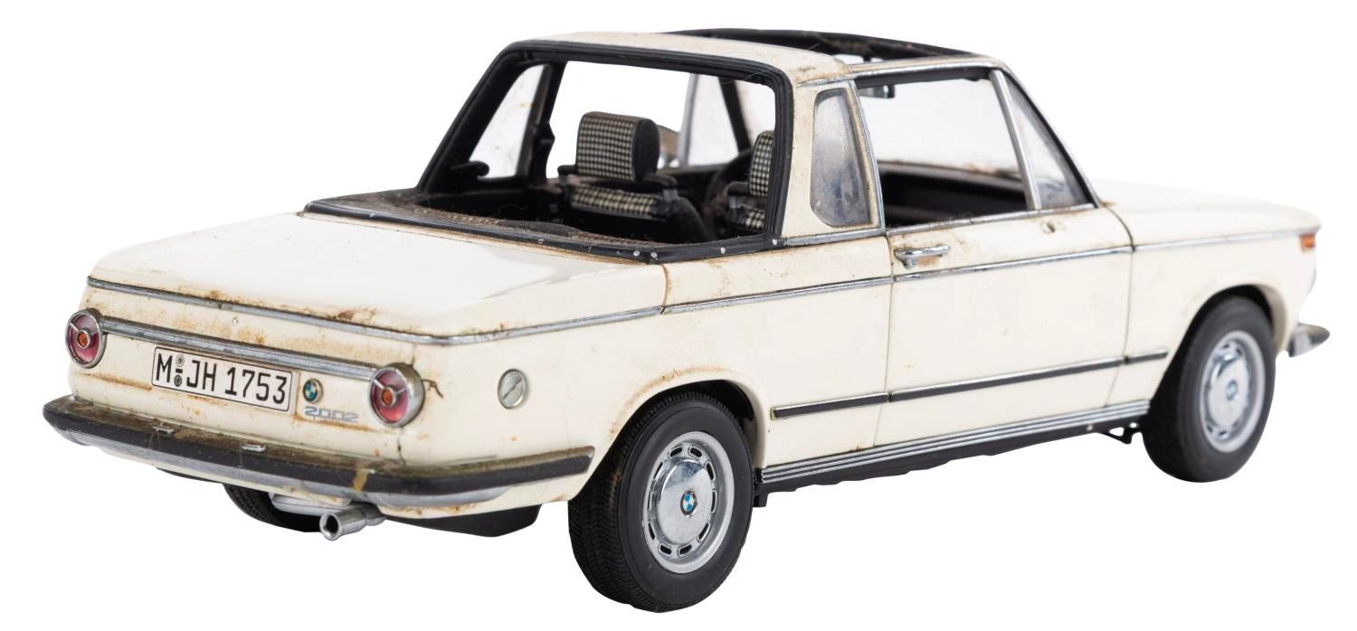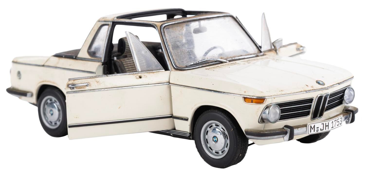 (Gateway Global Limited, 2002) A BMW 2002 Baur Cabriolet 1:18 model car. Measuring 9" x 3.25" x 3.25" tall with its 12.75" x 6.5" x 5.75" original box, the car is in fair condition with heavy stains, scratches, wear, and the passenger side mirror missing.