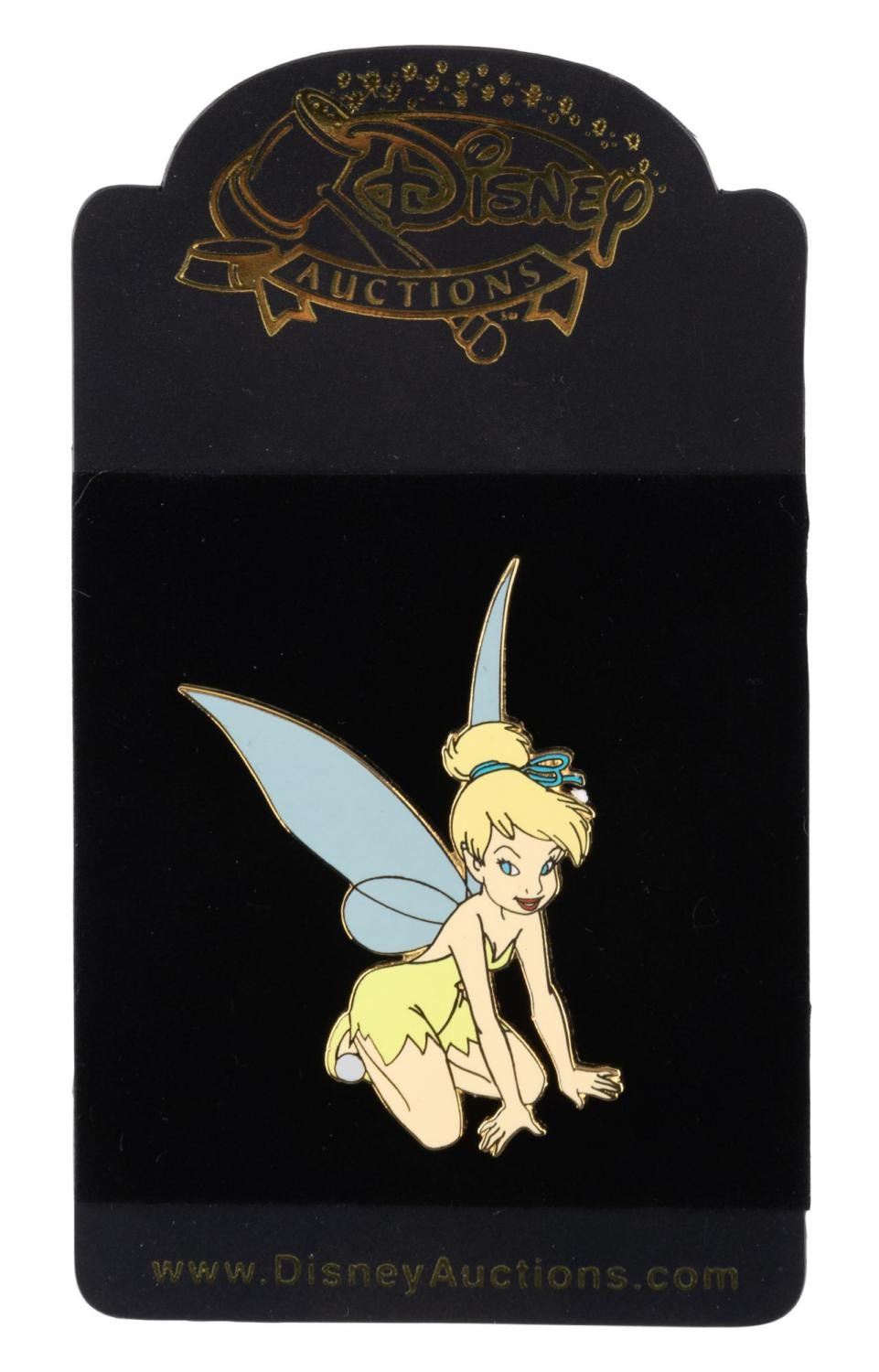 (Disney, 2003) A pin of Tinker Bell kneeling, released in a limited edition of 1000 by Disney Auctions. Measuring 2” x 1.5”, the pin is in fine condition on the original card.