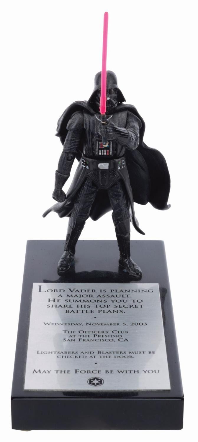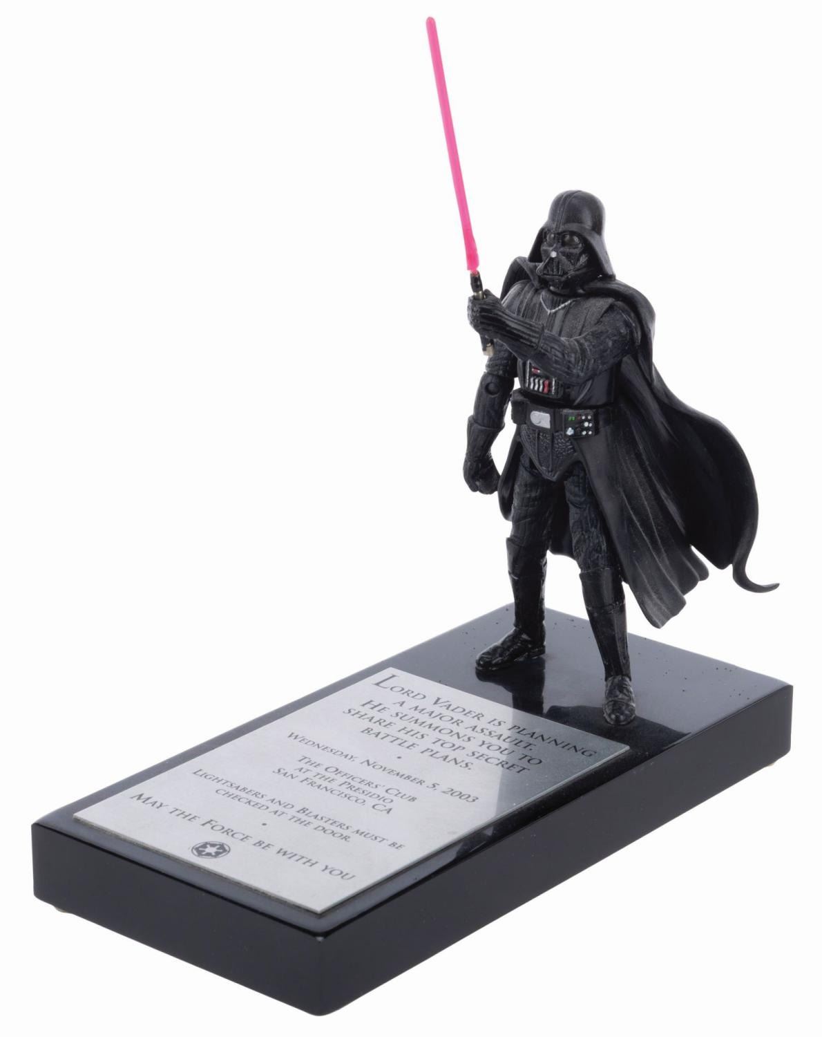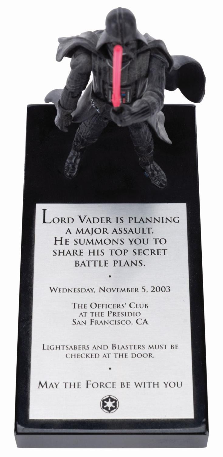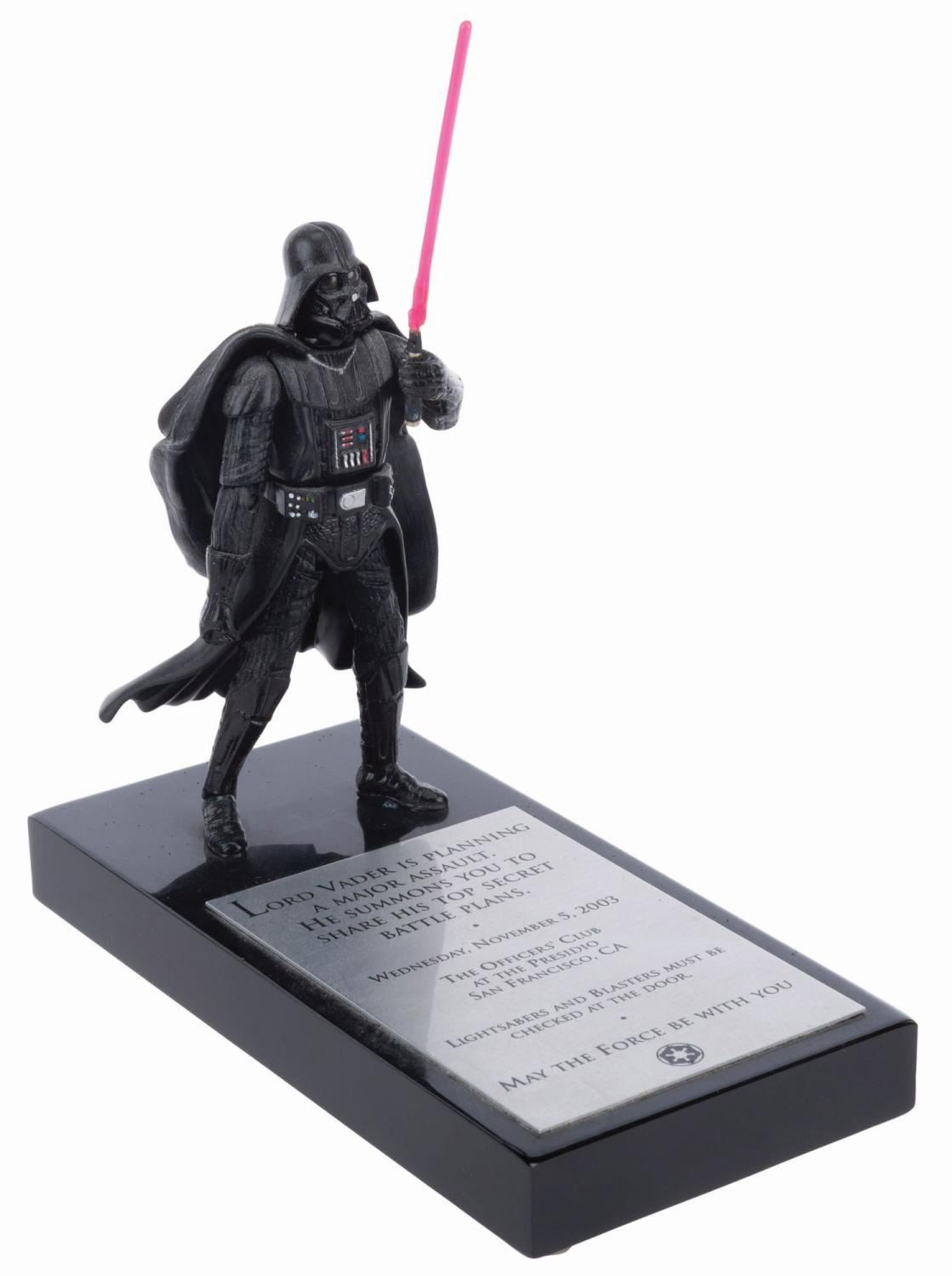 (Lucasfilm, 2003) A rare Darth Vader action figure on a plaque, sent to merchandising licensees and Lucasfilm staff as an invitation to the 2003 Star Wars Summit at The Presidio in San Francisco. The plaque amusingly states, "Lightsabers and blasters must be checked at the door." Measuring 3" x 6" x 7" tall, the invite is in very good condition with light discoloration from age and wear.
