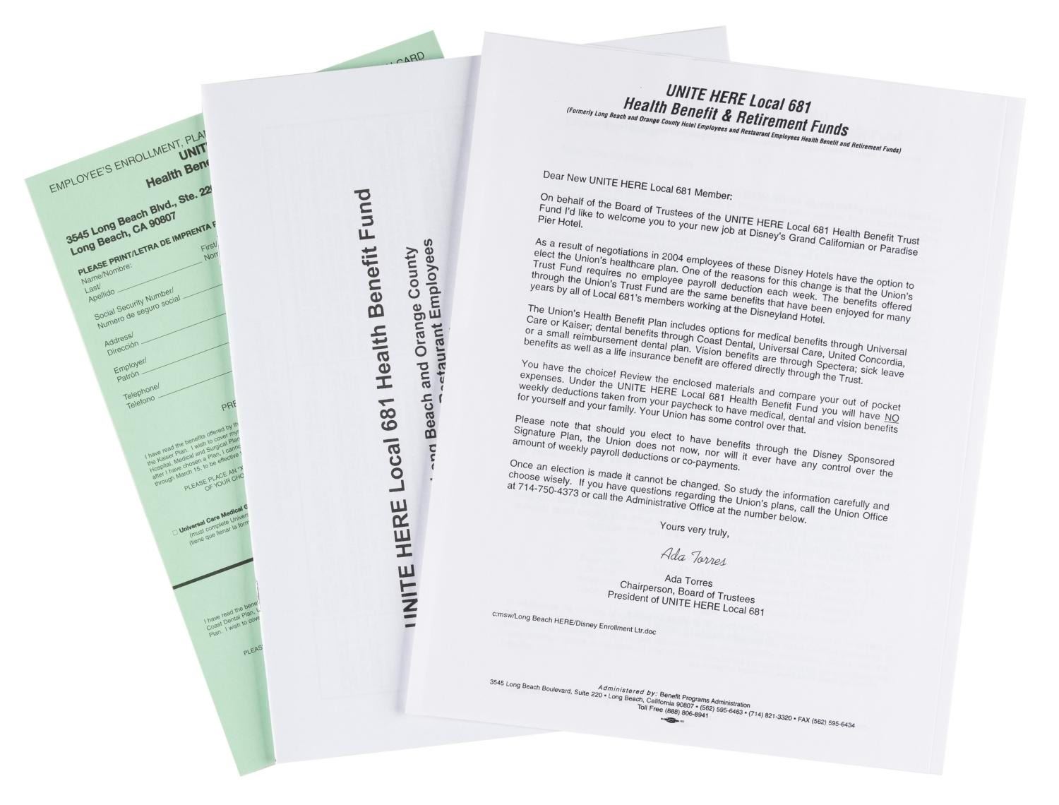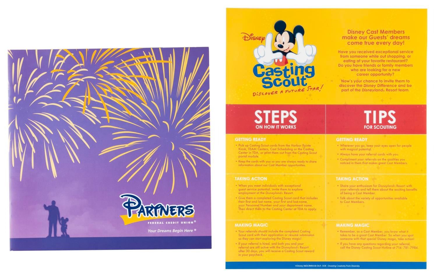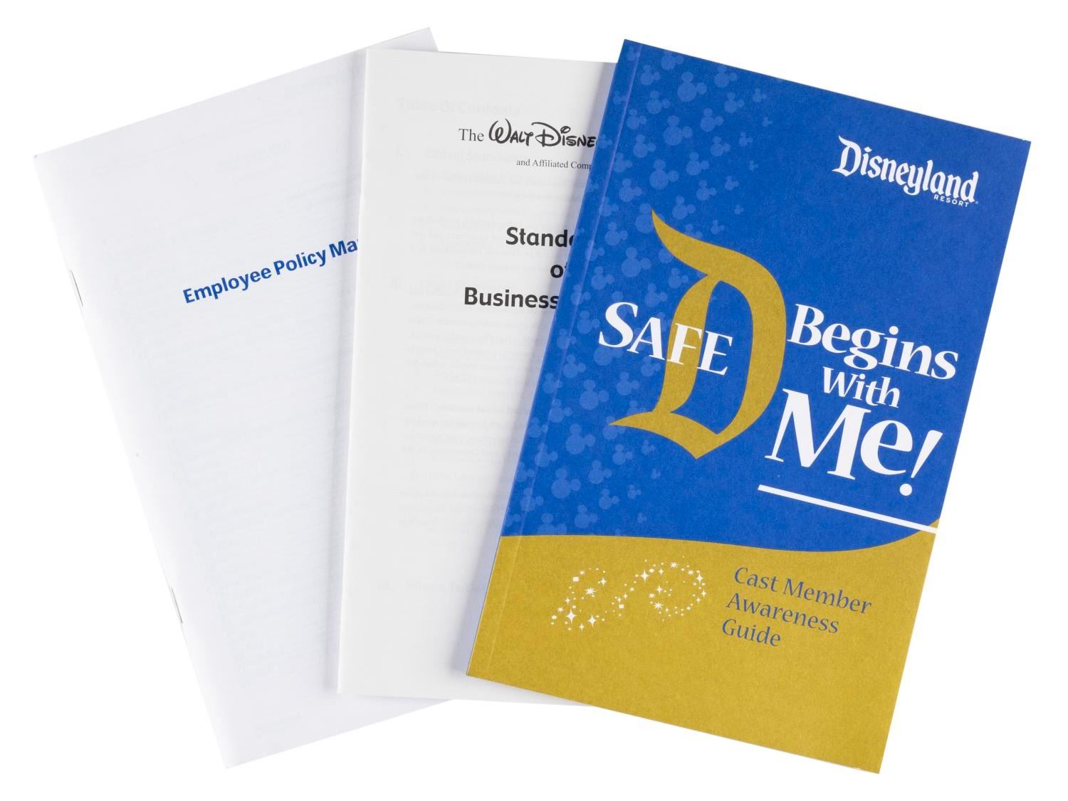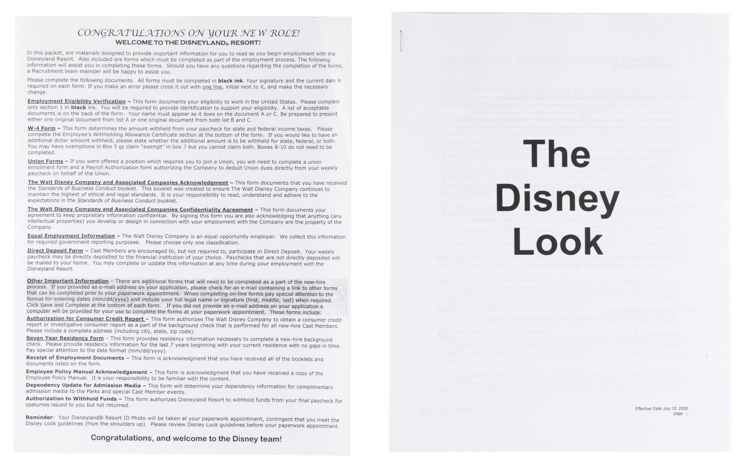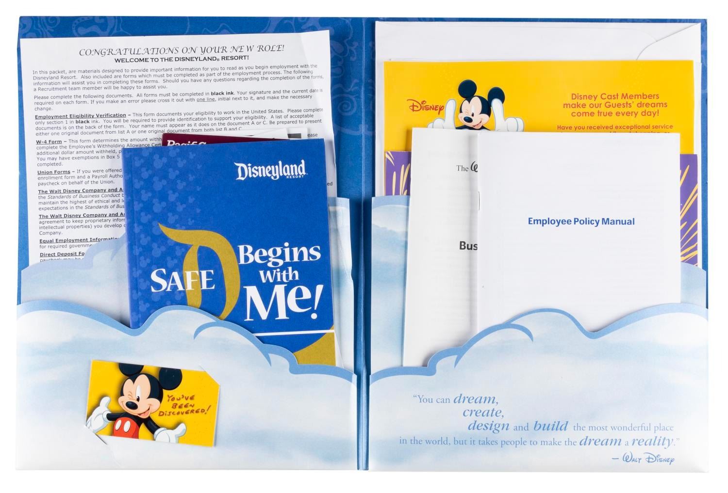 (Disneyland, 2006) A Disneyland new hire packet including a Safety Awareness booklet, union paperwork, benefit and resource pamphlets, a welcome letter, and a xeroxed copy of the 2006 version of "The Disney Look" guide to acceptable Cast Member grooming and dress. Measuring 9.5" x 12.5" overall, the packet is in very good condition, with wear to the folder including small scuffs, and a creased interior tab.