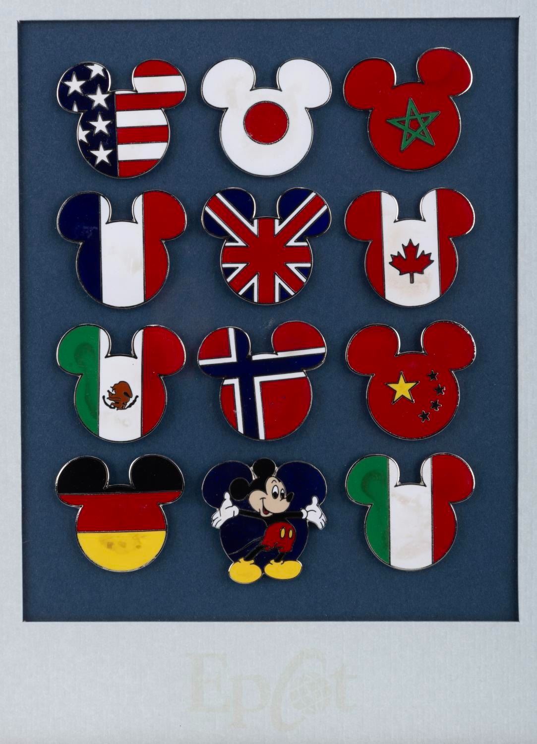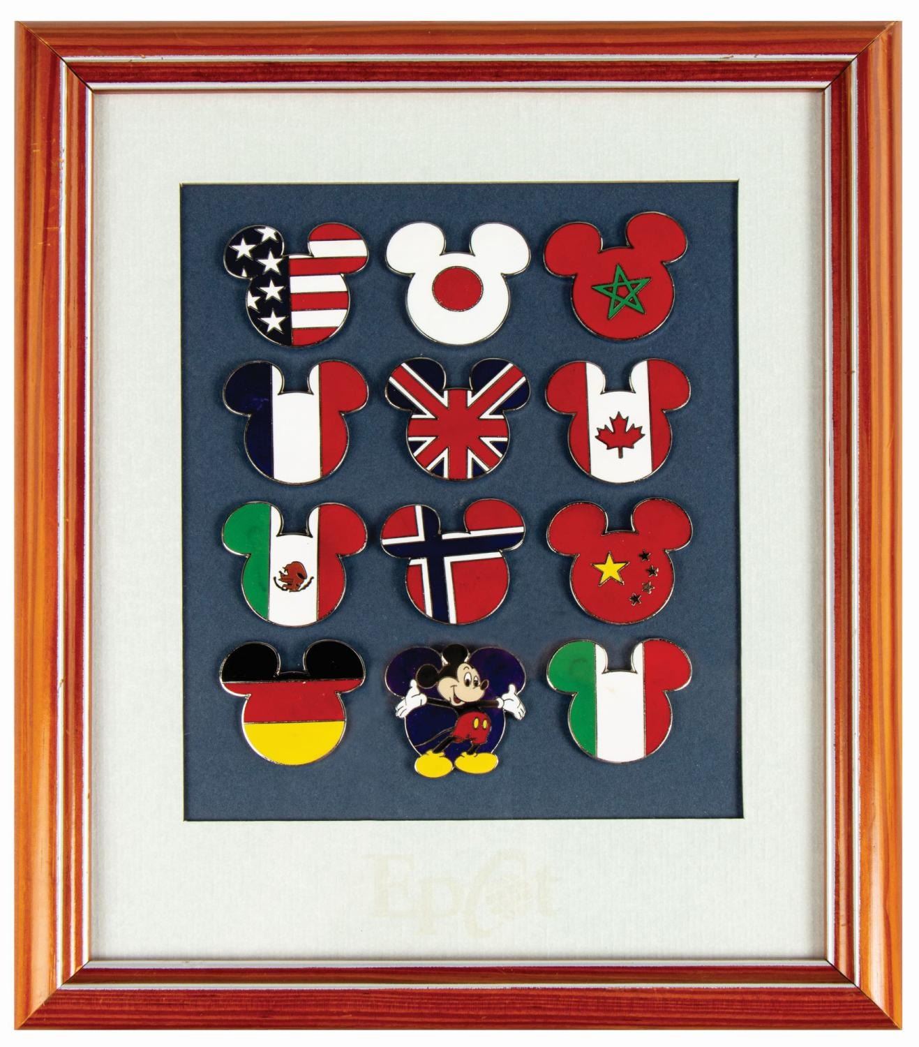 (Epcot, 2007) A complete collection of twelve pins based on Epcot's World Showcase. These Mickey's head pins represent the flags of the 11 countries with pavilions in the EPCOT World Showcase, with a 12th pin featuring Mickey Mouse. Each pin measures 1.5"x1.5", beautifully mounted for display within an 11.5"x9.5" frame. The condition of this piece is good overall, exhibiting surface wear to a few of the pins, and fading to the "Epcot" text on the frame.
