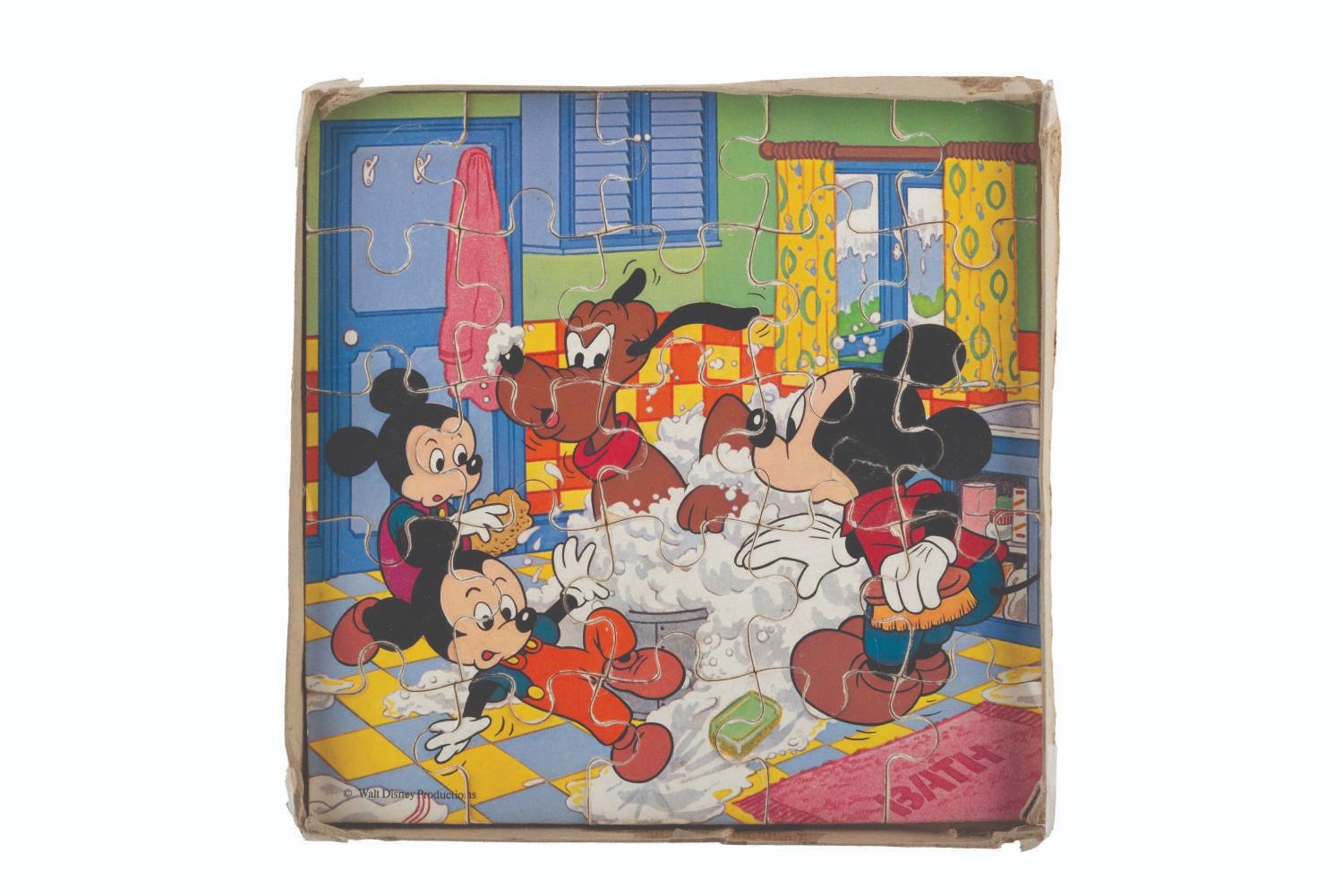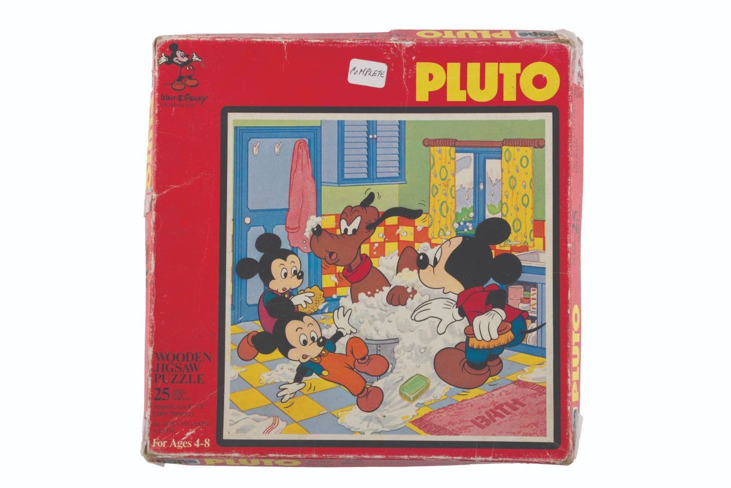 (Hope, 1970s) A 25-piece wooden jigsaw puzzle"Pluto Takes a Bath," with the original box. Measuring 8" x 8", the puzzle is in good condition with wear from use, and the box in fair condition with heavy wear and tape repairs.