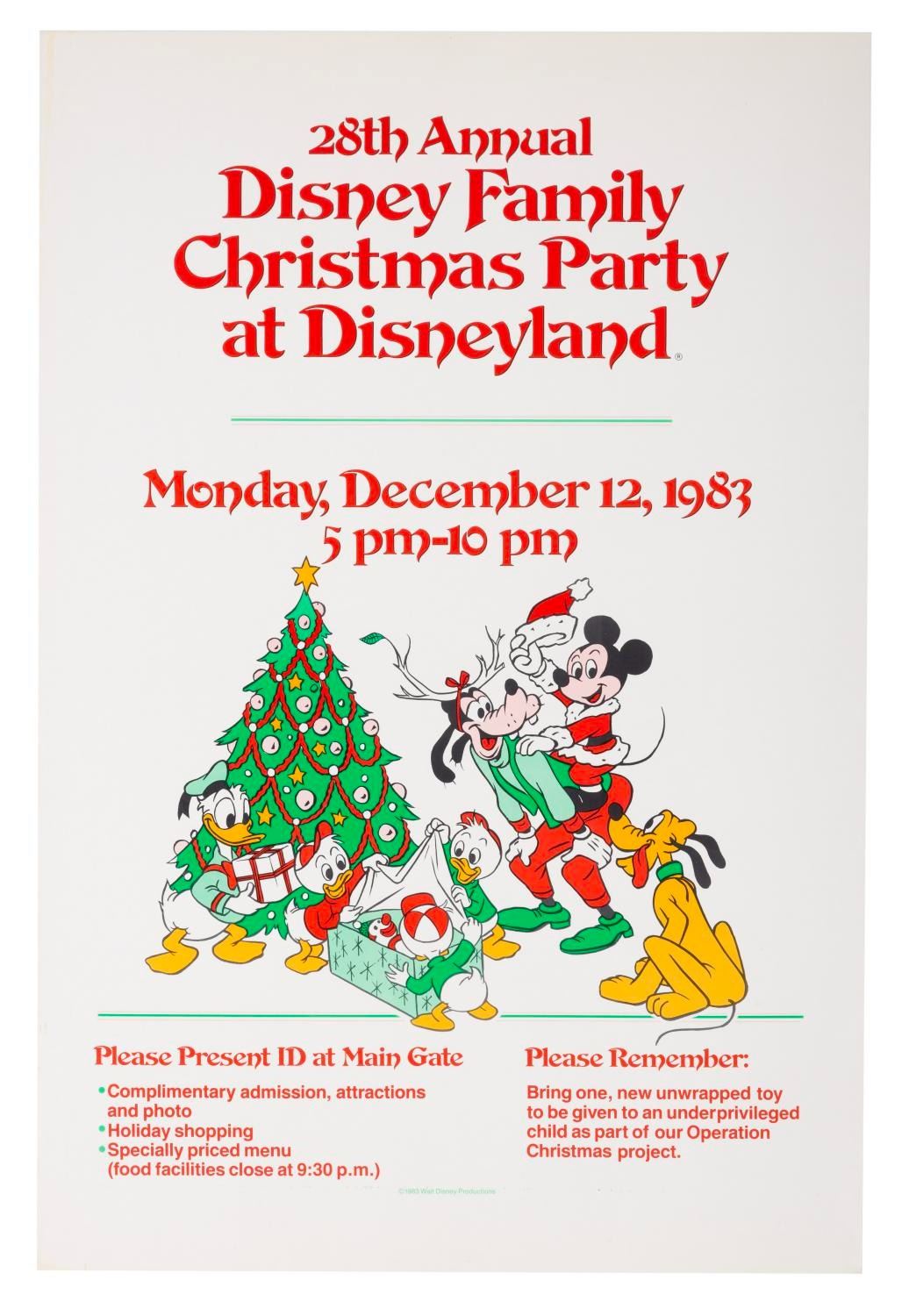 (Disneyland, 1983) A Cast Member poster for the 28th Annual Disney Family Christmas Party. Measuring 20" x 30", the poster is in very good condition with light wear, and faint staining at the top left corner.