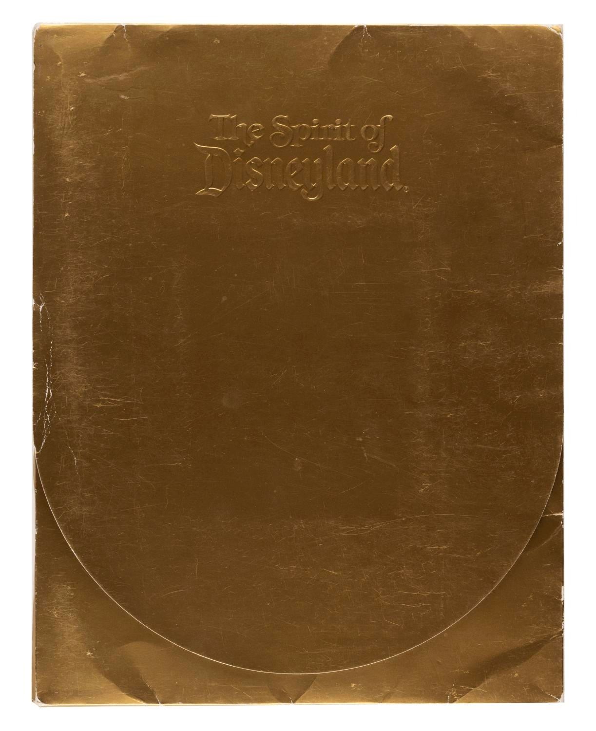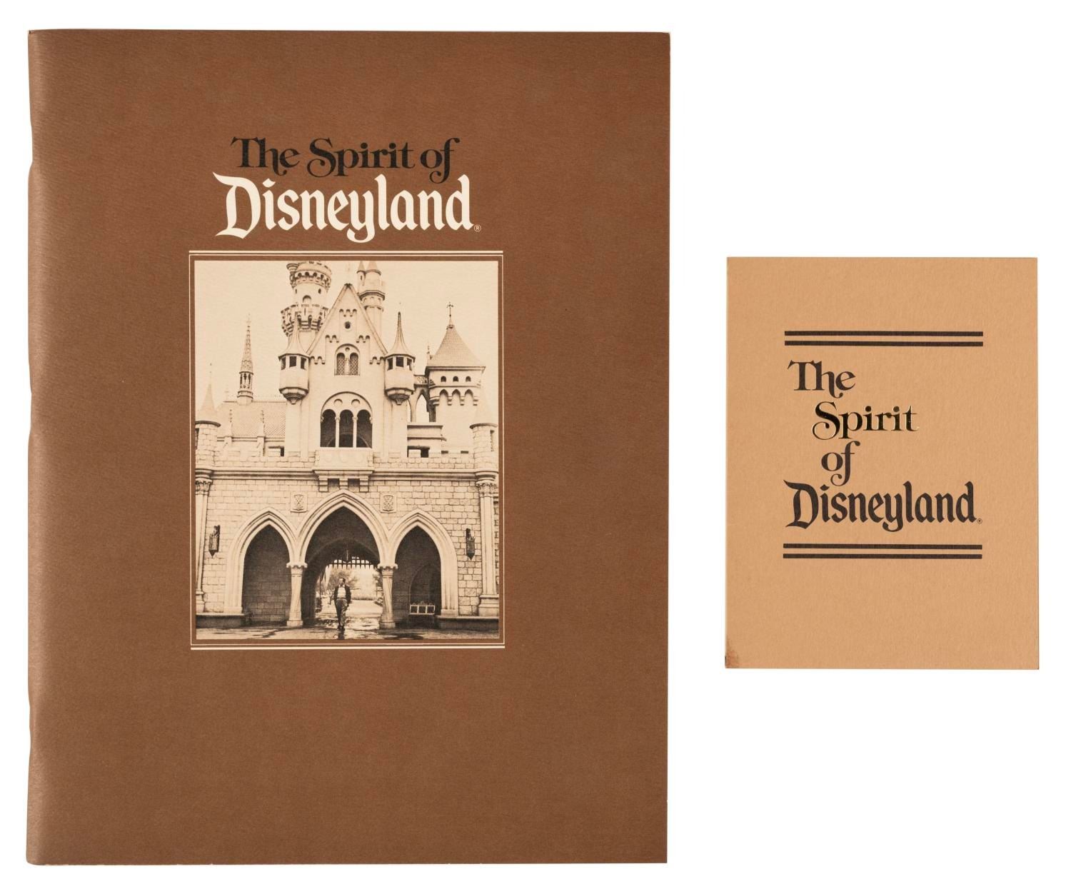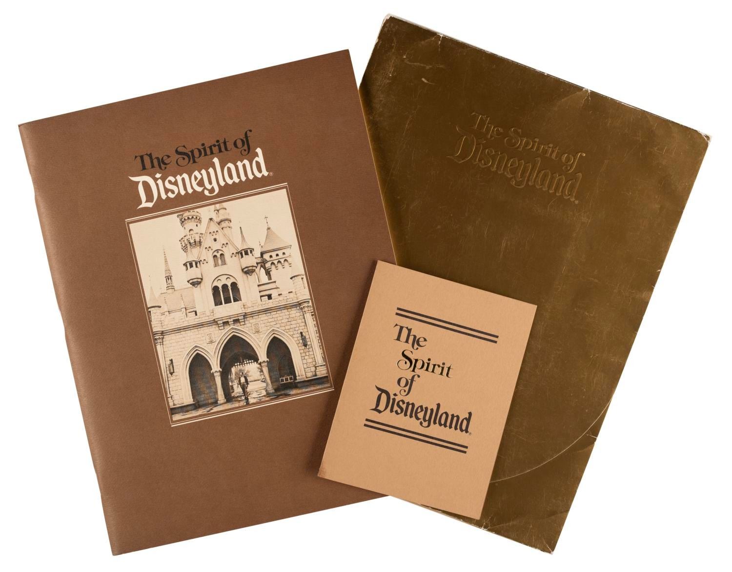 (Disneyland, 1985) A souvenir book, folder, and event itinerary card, created for the "Spirit of Disneyland" presentation held for Cast Members and their family members during the Park's 30th anniversary. The 58-page souvenir book features sections dedicated to Walt's life and work, and the dream, reality, and pioneering years of Disneyland. Measuring between 4"x5.5" and 11"x8.5", the booklet and itinerary are in very good condition with a small stain on the bottom corner of the booklet. The exterior folder is in fair condition with notable creasing and edge wear.