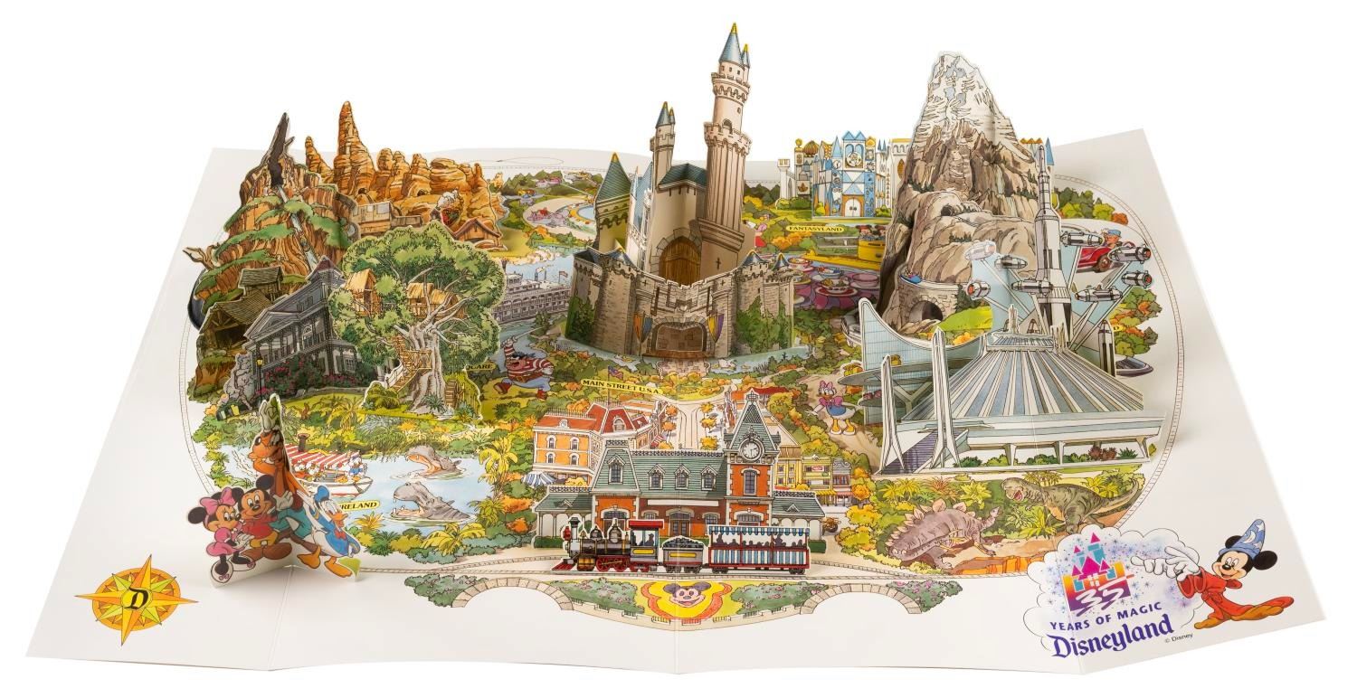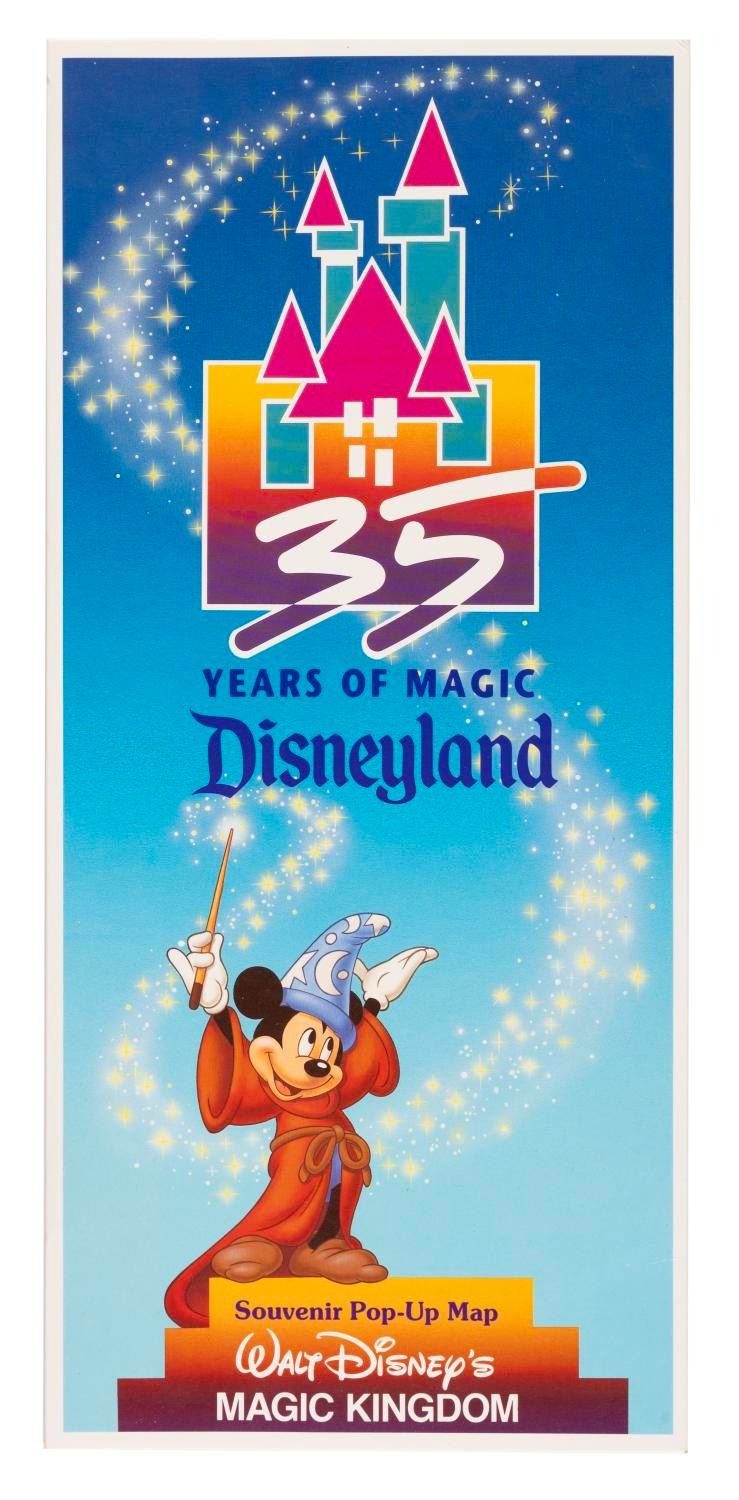 (Disneyland, 1990) A 35 Years of Magic souvenir pop-up map of Disneyland. This colorful double gatefold map features pop-ups of attractions and Disney characters. Measuring 18" x 8.25" folded and 26" x 18" when open, the map is in very good condition with minimal handling wear along the edges.