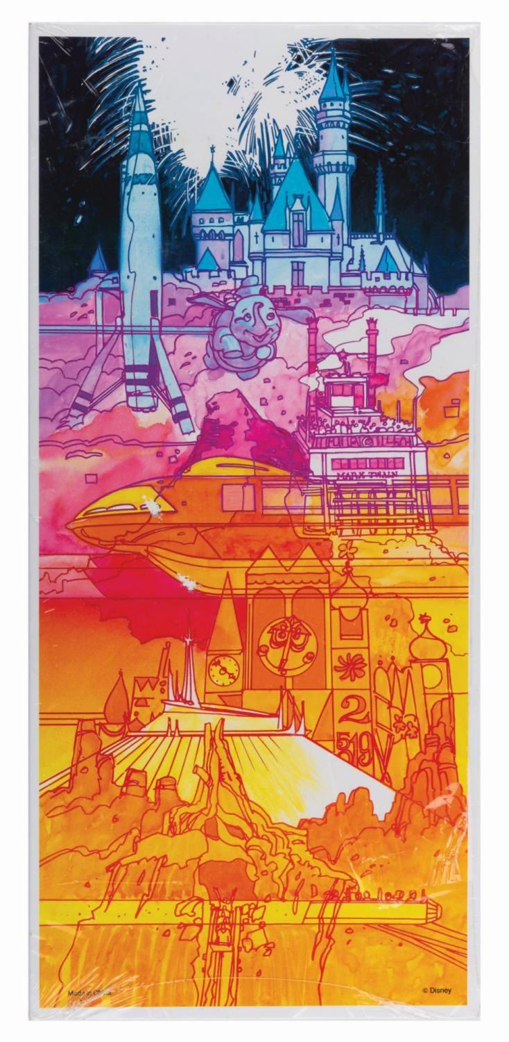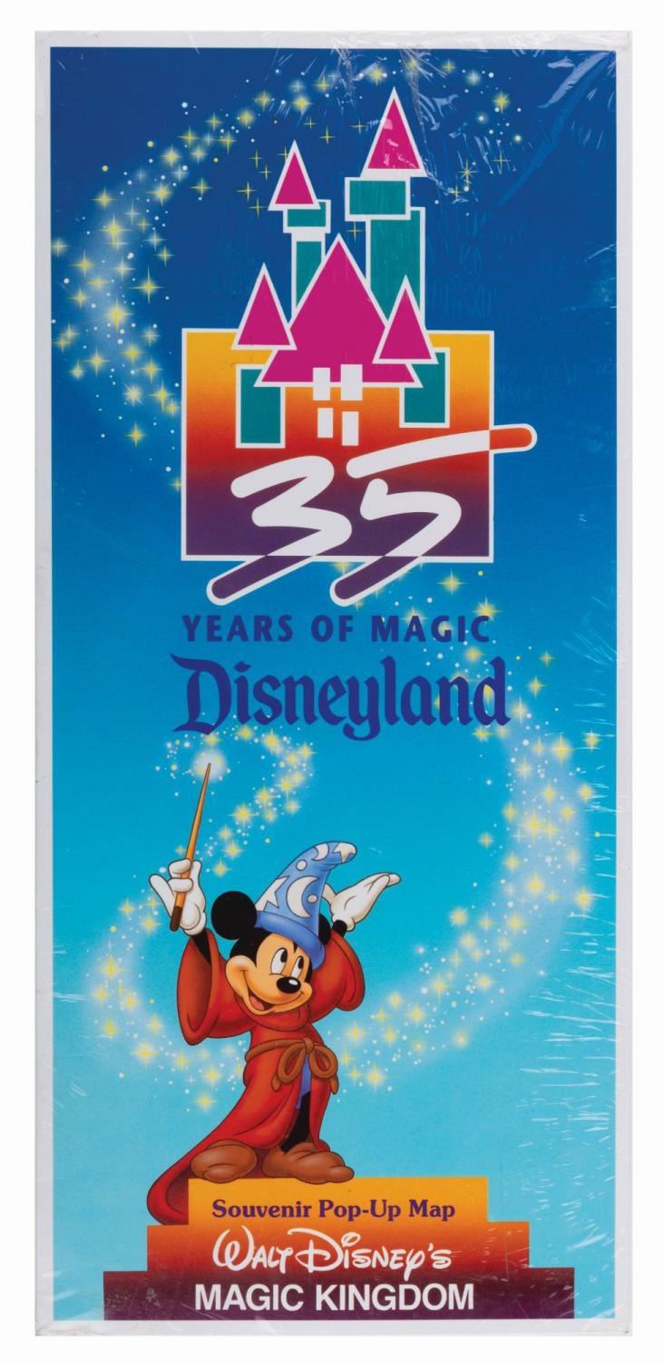 (Disneyland, 1990) A 35 Years of Magic souvenir pop-up map of Disneyland. This colorful double gatefold map features pop-ups of beloved attractions and Disney characters. Measuring 8.25" x 18", the map is in fine condition, sealed in original cellophane.