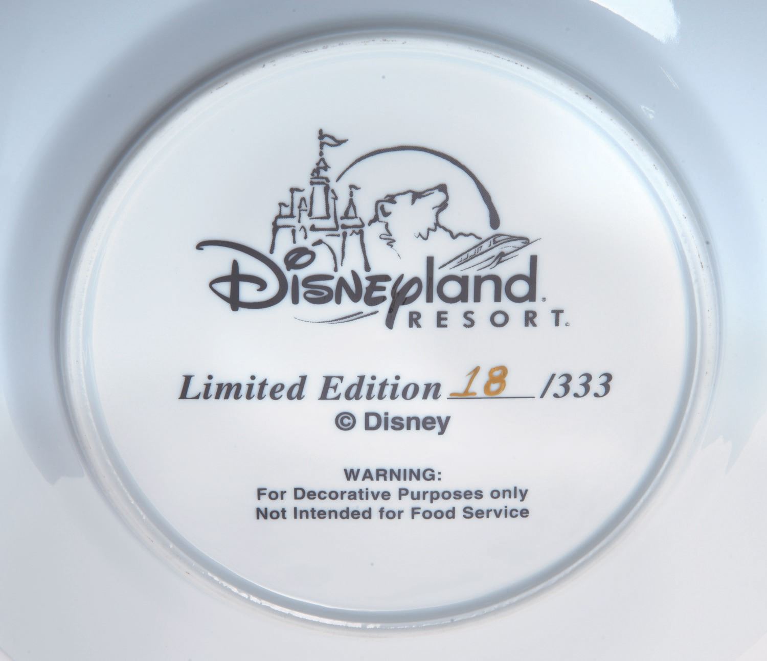 (Disneyland, 2002) A rare, limited-edition plate commemorating the 35th anniversary of Club 33 at Disneyland. The decorative plate is numbered 18/333. Measuring 10.5" in diameter, the souvenir is in very fine condition.