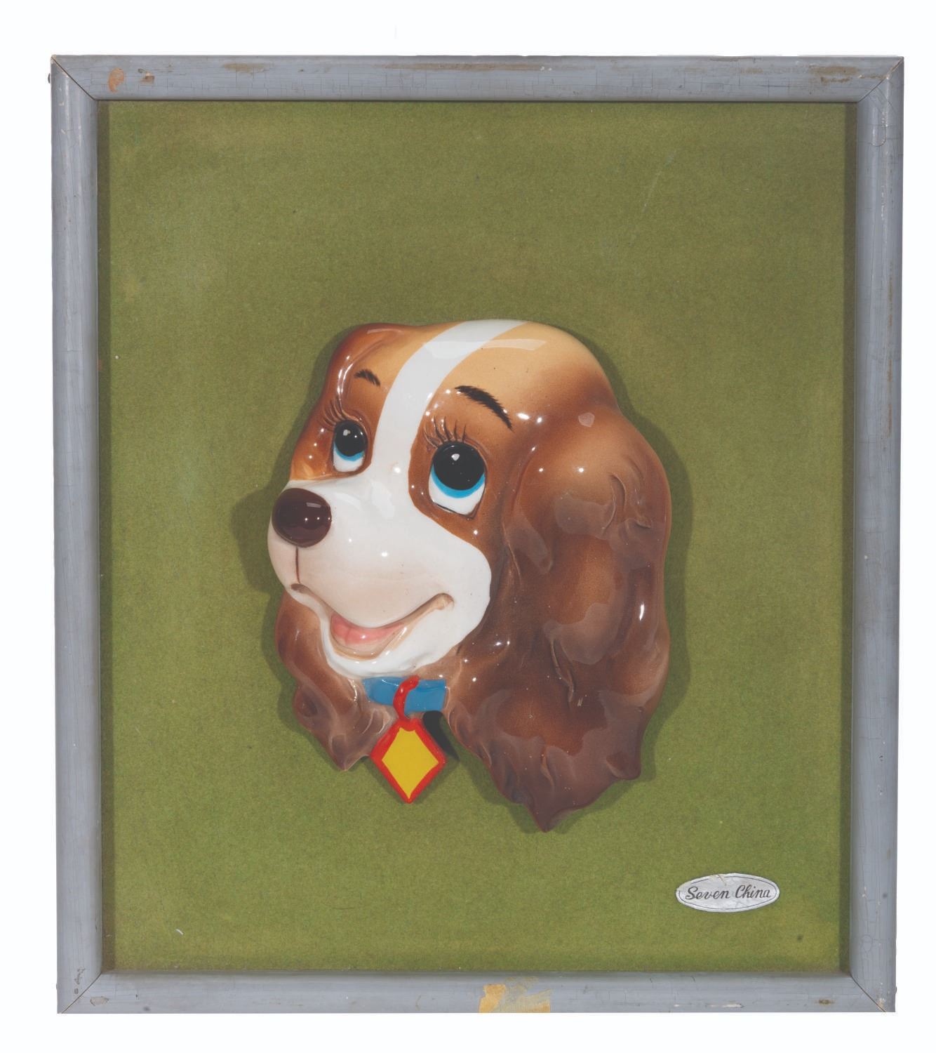 (Seven China, 1960s-70s) A 3D ceramic wall decoration of Lady from "Lady and the Tramp.” The ceramic is mounted to a felt-lined frame with a "Disney’s Fancy” label featuring Bambi on the reverse. Measuring 9” x 10” overall, with Lady measuring 5.5” x 4.5” x 1.25”, the piece displays in good condition with light crazing to the nose and mouth, and scuffs. The frame is in fair condition with adhesive residue and cracks.