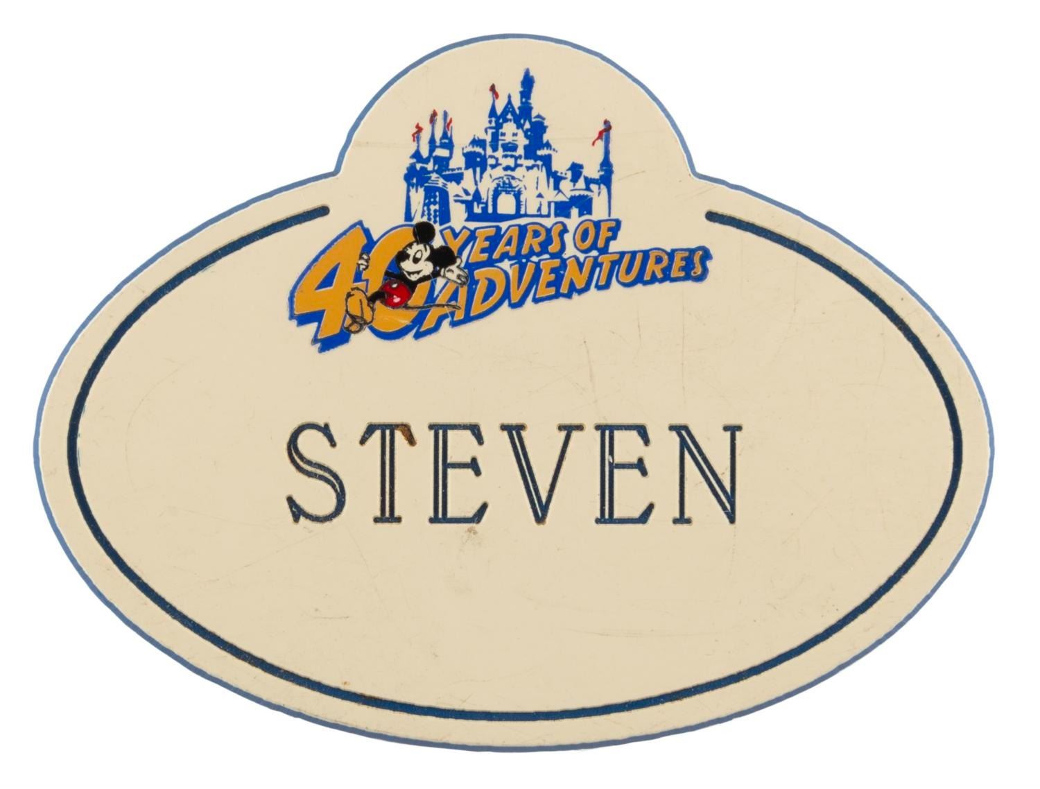 (Disneyland, 1995) A Cast Member "Steven" name badge from Disneyland's 40 Years of Adventure celebration. Measuring 2" x 2.5", the name badge is in good condition with heavy surface scratches throughout and wear from Park use.
