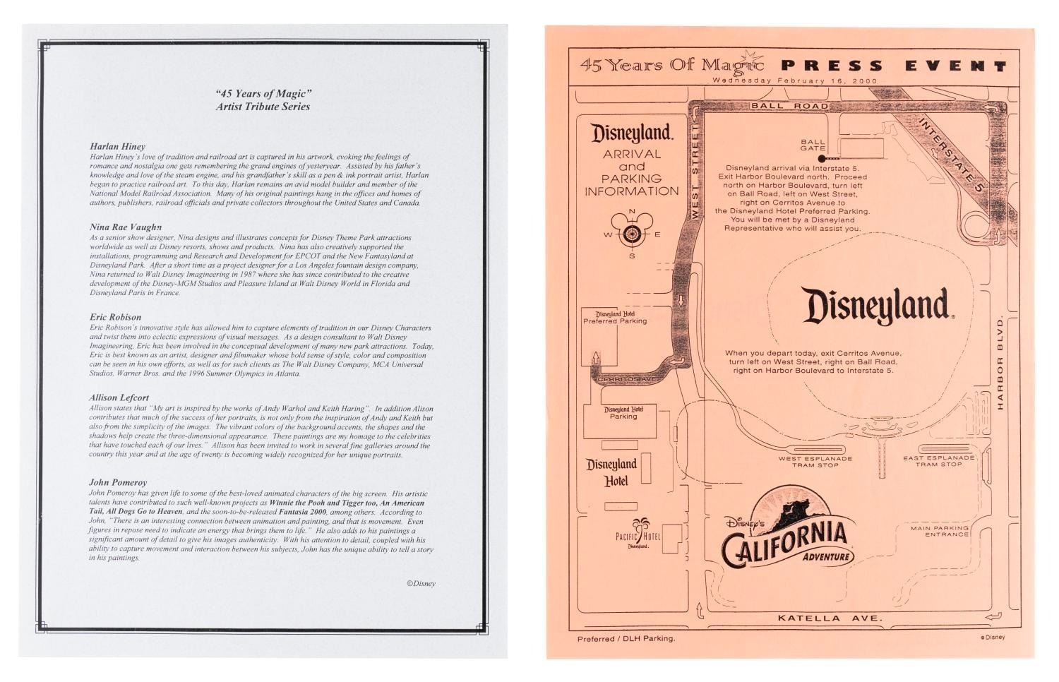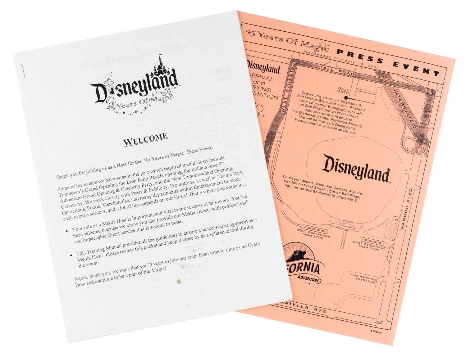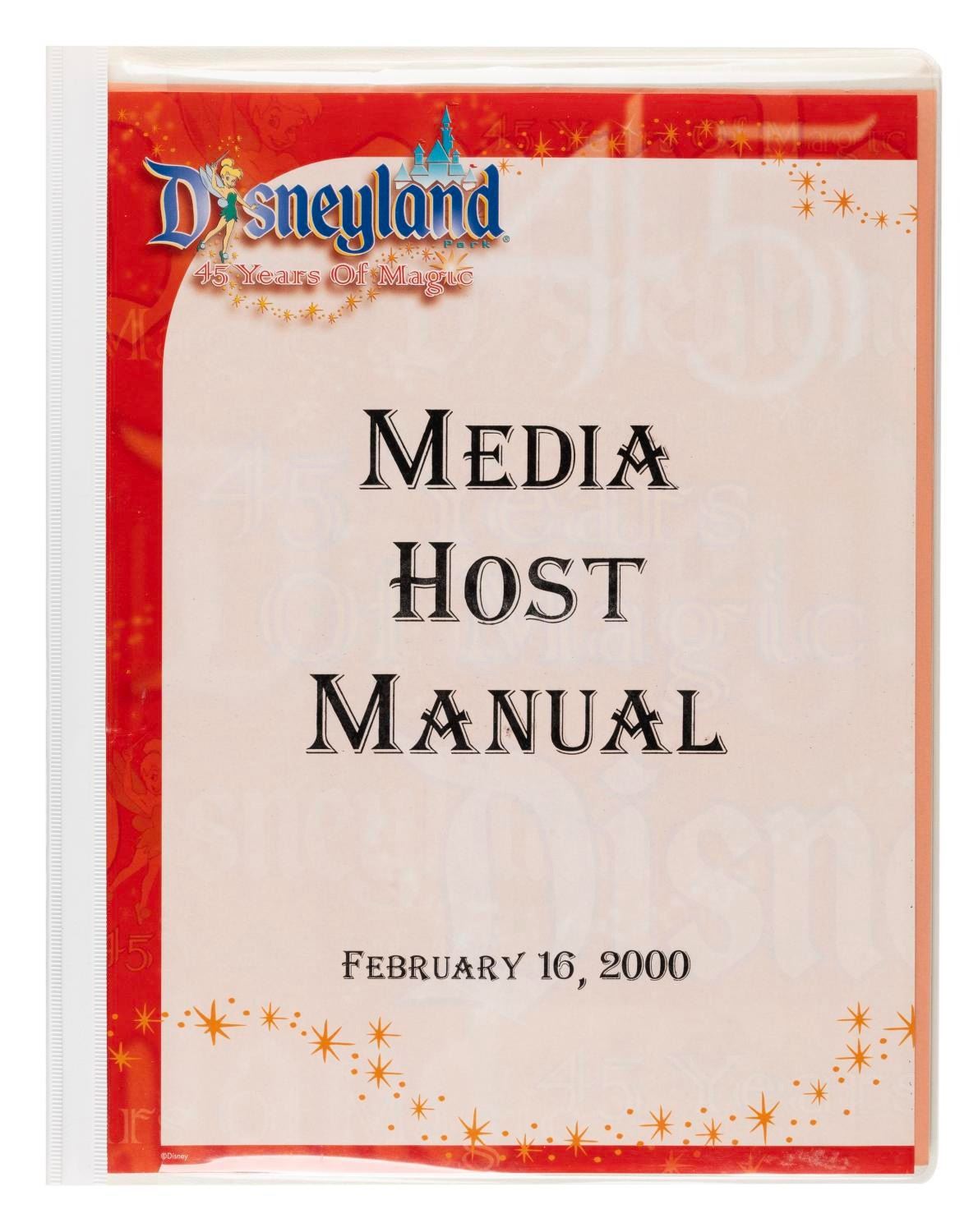 (Disneyland, 2000) A media host training manual for the premiere of the 45 Years of Magic Parade Press event from February 16th through 18th, 2000. The manual provides tips for greeting and hosting members of the press, and the packet of many xeroxed pages includes a Park map, event itinerary, and instructions on how to dress and interact with the press. Measuring 11.75" x 9", the manual is in very good condition with typical wear from use.