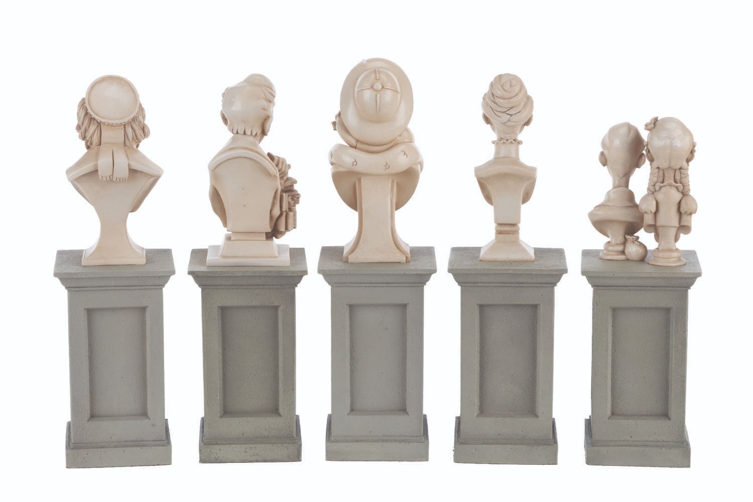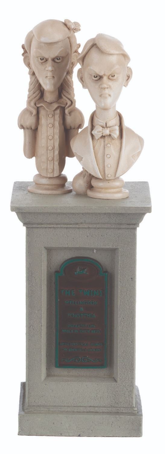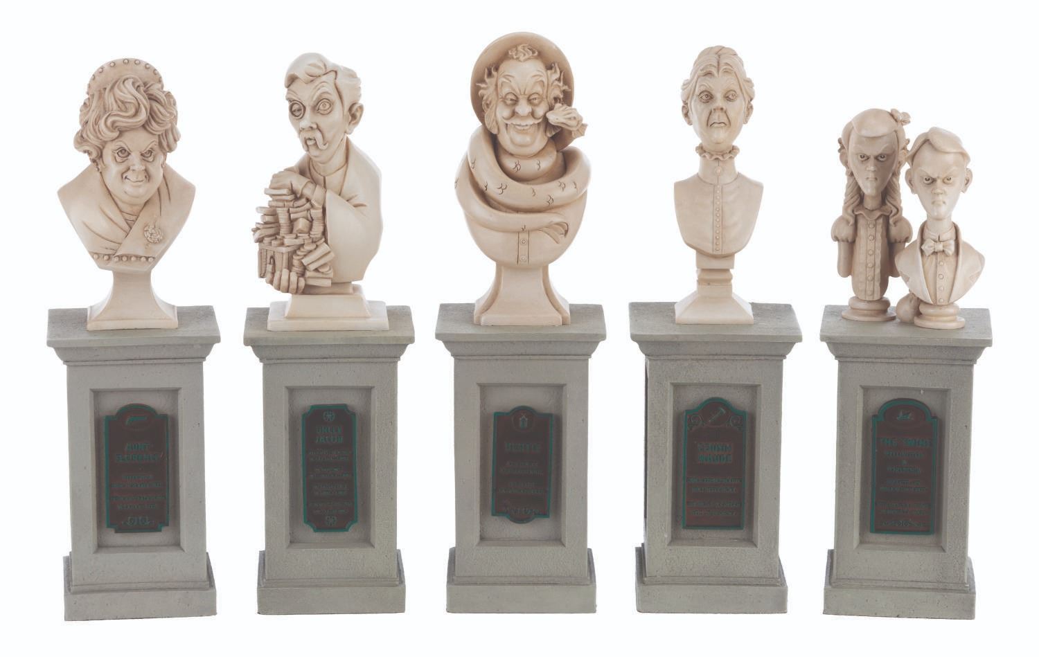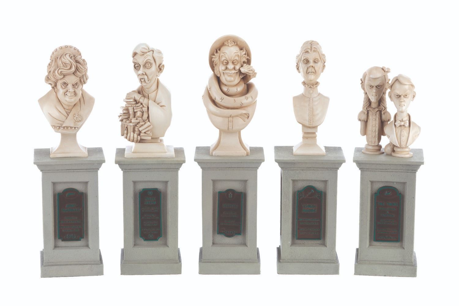 (Walt Disney World, 2014) A set of 5 sculptural busts on pillars commemorating the 45th anniversary of The Haunted Mansion. In 2010, life-size busts were installed in the queue of Walt Disney World's Haunted Mansion as part of an interactive mystery game. These stone powder miniatures include Aunt Florence, Uncle Jacob, Bertie, The Twins, and Cousin Maude. Ranging in size from 2.5" x 2.5" x 7.75 tall to 2.5" x 2.5" x 8.5" tall, the busts are in fine condition.