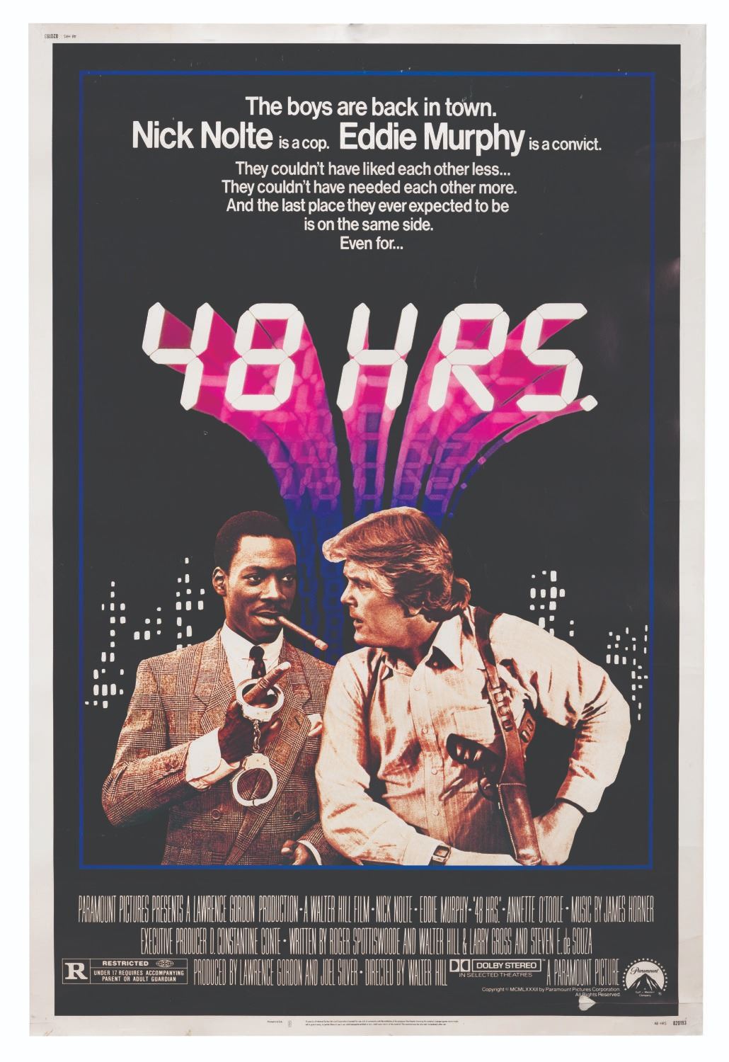 (Paramount, 1982) A three-sheet for "48 Hrs." starring Eddie Murphy and Nick Nolte in what many consider to be the original "buddy cop" genre movie. Measuring 40" x 60", the poster is in fair condition with several large cuts around the perimeter, creasing, tears, soiling, discoloration, scuffs, tape residue on the reverse from mounting, and one hole in the upper left section.