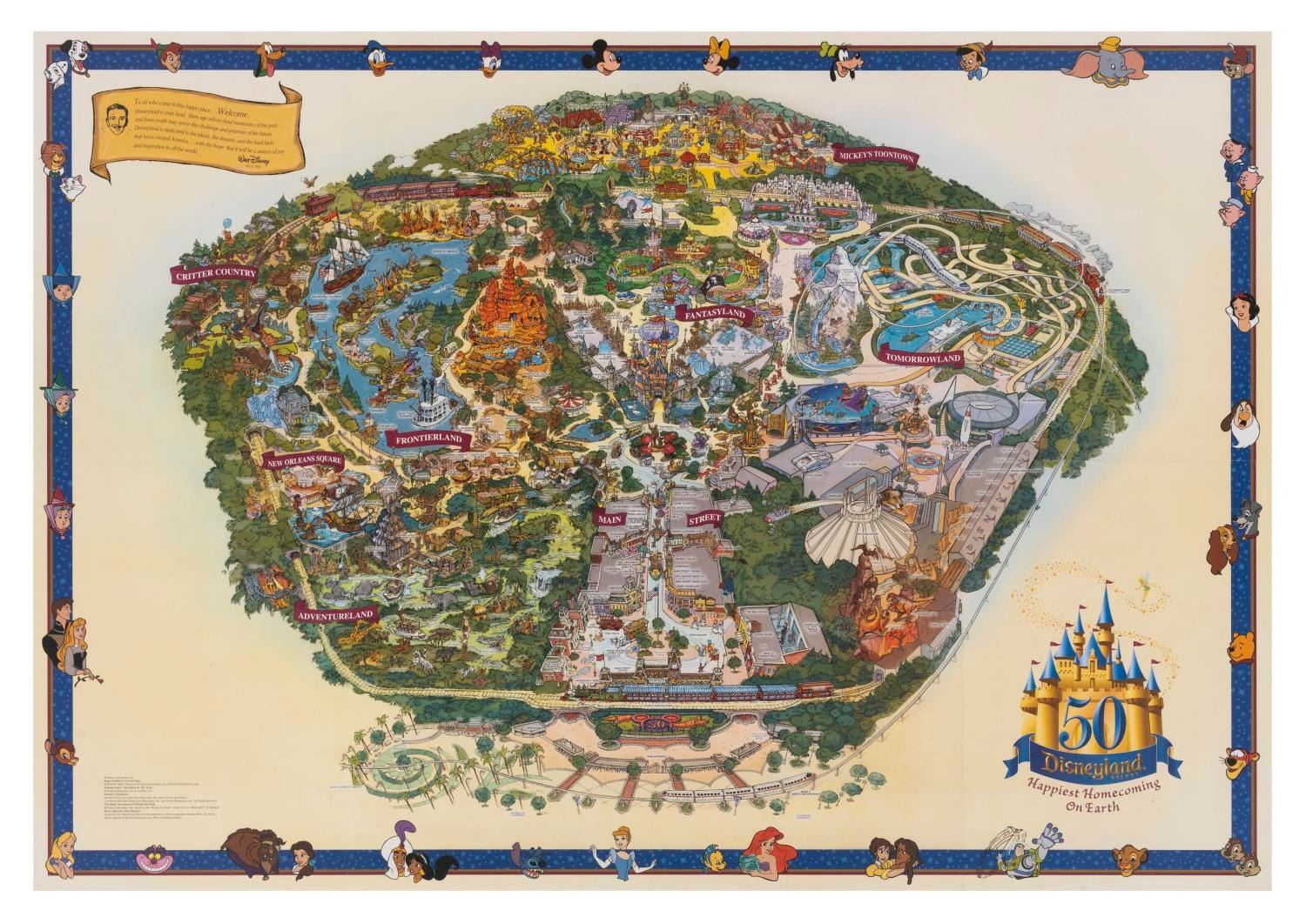 (Disneyland, 2005) A large souvenir map of Disneyland designed for the Park's 50th anniversary, featuring the first appearance of "Big Thunder Ranch" and "Buzz Lightyear Astro Blasters." Measuring 27" x 39", the map is in very good condition with light wear to edges and original folds.