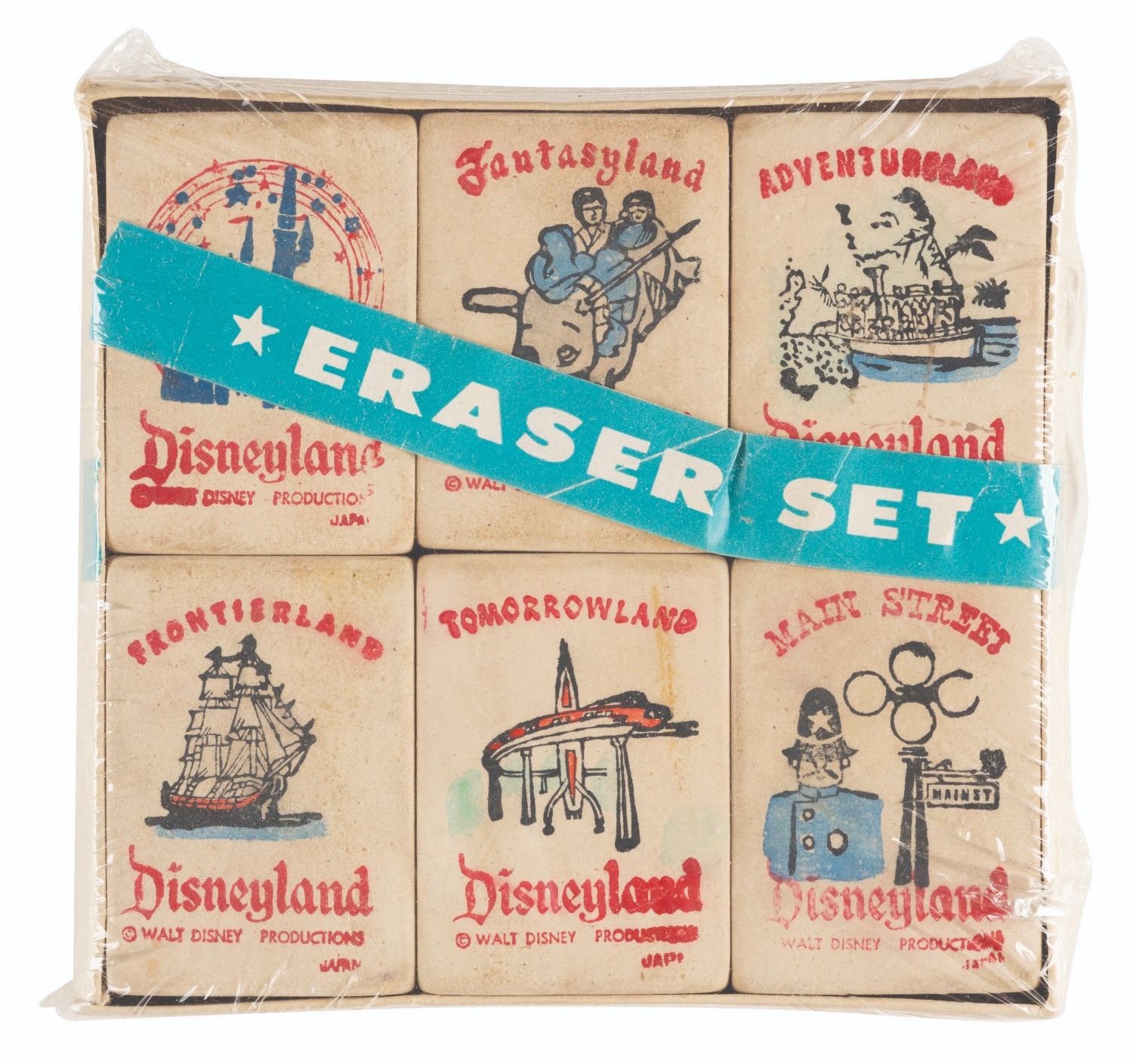 (Disneyland, 1960s) A set of six Disneyland erasers featuring Main Street, Tomorrowland, Fantasyland, Adventureland, Frontierland, and Sleeping Beauty Castle. This boxed set measures 4" x 4.25" and is in good condition with some discoloration from age and wear to the box. The label is torn and the box may have been re-shrink-wrapped.