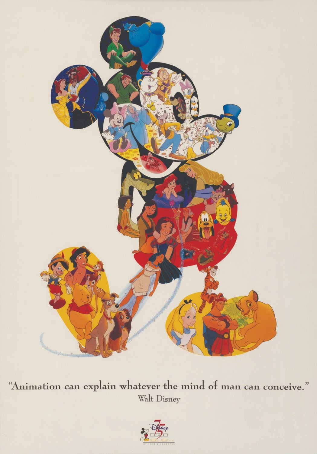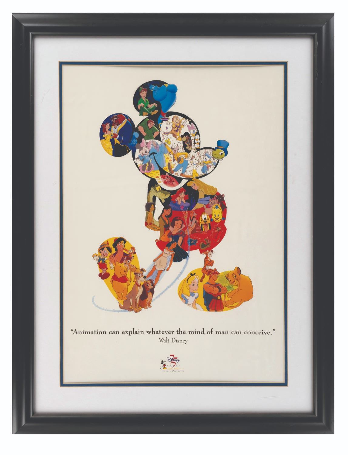 (Disney, 1998) A poster celebrating the 75th anniversary of the Walt Disney Company in 1998. Images of animated feature characters fill a collage that forms a portrait of Mickey Mouse, with a quote from Walt Disney. With a visible image of 18"x26", the framed poster is in very good condition with wear and scratches to the frame.