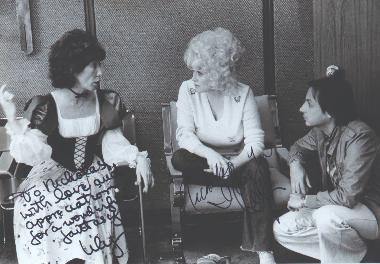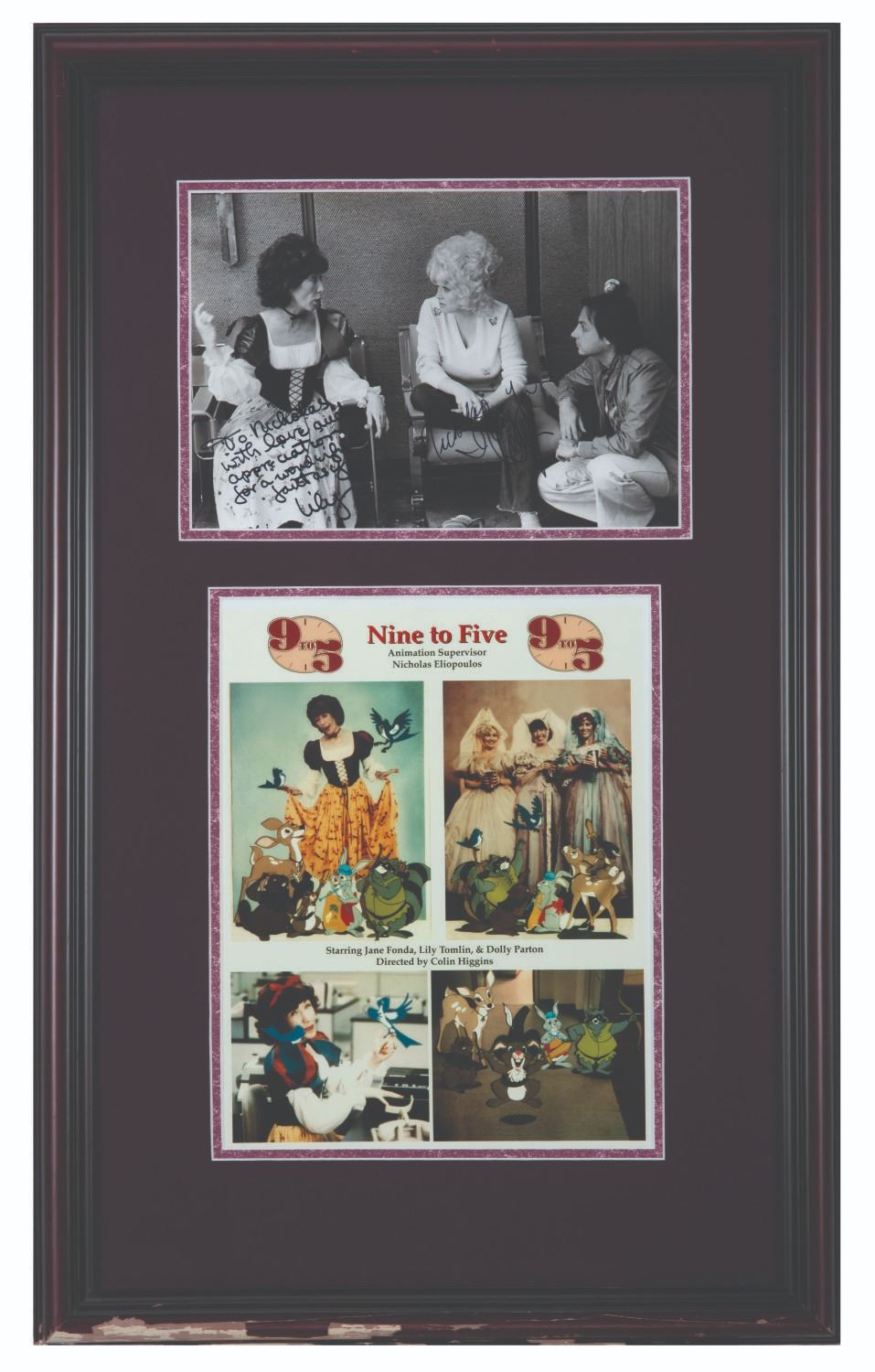 (20th Century Fox, 1980) A photo behind the scenes from the production of 9 to 5, signed by Lily Tomlin and Dolly Parton. The photo depicts Lily Tomlin in her Snow White-style costume from the animated fantasy sequence of the film. She is alongside Dolly and Nicholas Eliopoulos, the film's Animation Supervisor, to whom the signatures are dedicated. Measuring 8"x10", the photo with autographs is in very good condition, with very slight wear at the top edge. It is displayed beside an 8.5"x11" color piece depicting (4) images from the animated sequence.