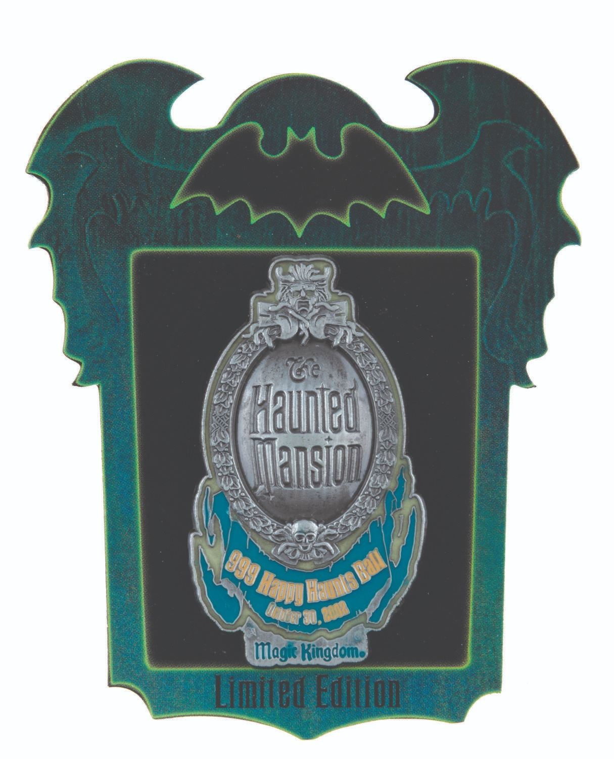 (Walt Disney World, 2002) A limited edition glow-in-the-dark Haunted Mansion Main Gate Plaque pin released exclusively at the 999 Happy Haunts Ball event at the Magic Kingdom. Limited to an edition of 2000, the pin measures 2" x 2.25" and is in fine condition on the original card.