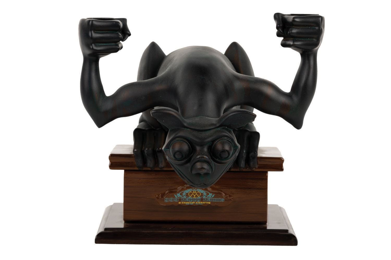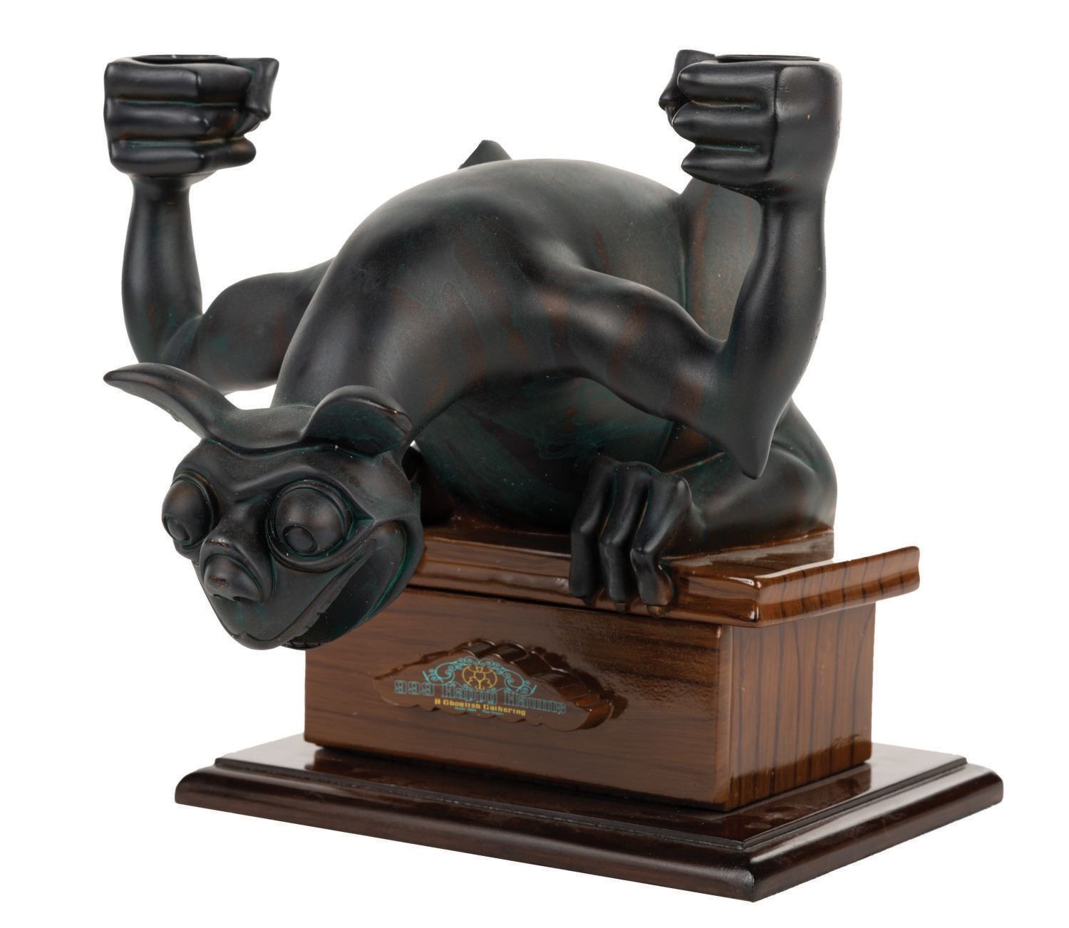 (Walt Disney World, 2004) A gargoyle candleholder from the "999 Happy Haunts: A Ghoulish Gathering" at The Magic Kingdom. The limited-edition statue features the title of the event on a sculpted plaque. Measuring 8" tall and 8"x9.5", the statue atop a faux wood finish base is in fine condition.