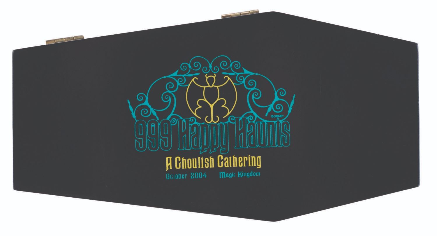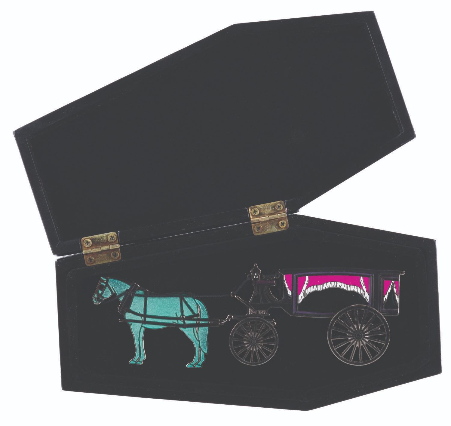 (Walt Disney World, 2004) A limited edition “A Deadly Delivery” pin released exclusively at the Haunted Mansion’s 999 Happy Haunts - Ghoulish Gathering event at the Magic Kingdom. Part of an edition of 500, the two-piece pin features a ghost horse leading a hearse carriage with spinning wheels as seen in front of the Haunted Mansion. Measuring 1.75” x 5.5” overall, the pin is in fine condition and comes with the original hinged, black velvet-lined 3.5” x 6.5” x 1” deep wooden coffin-shaped box in very good condition with light scuffs.
