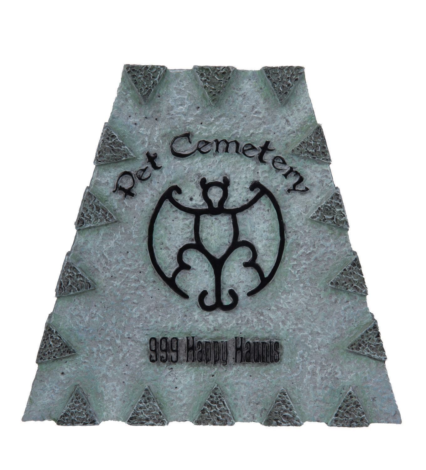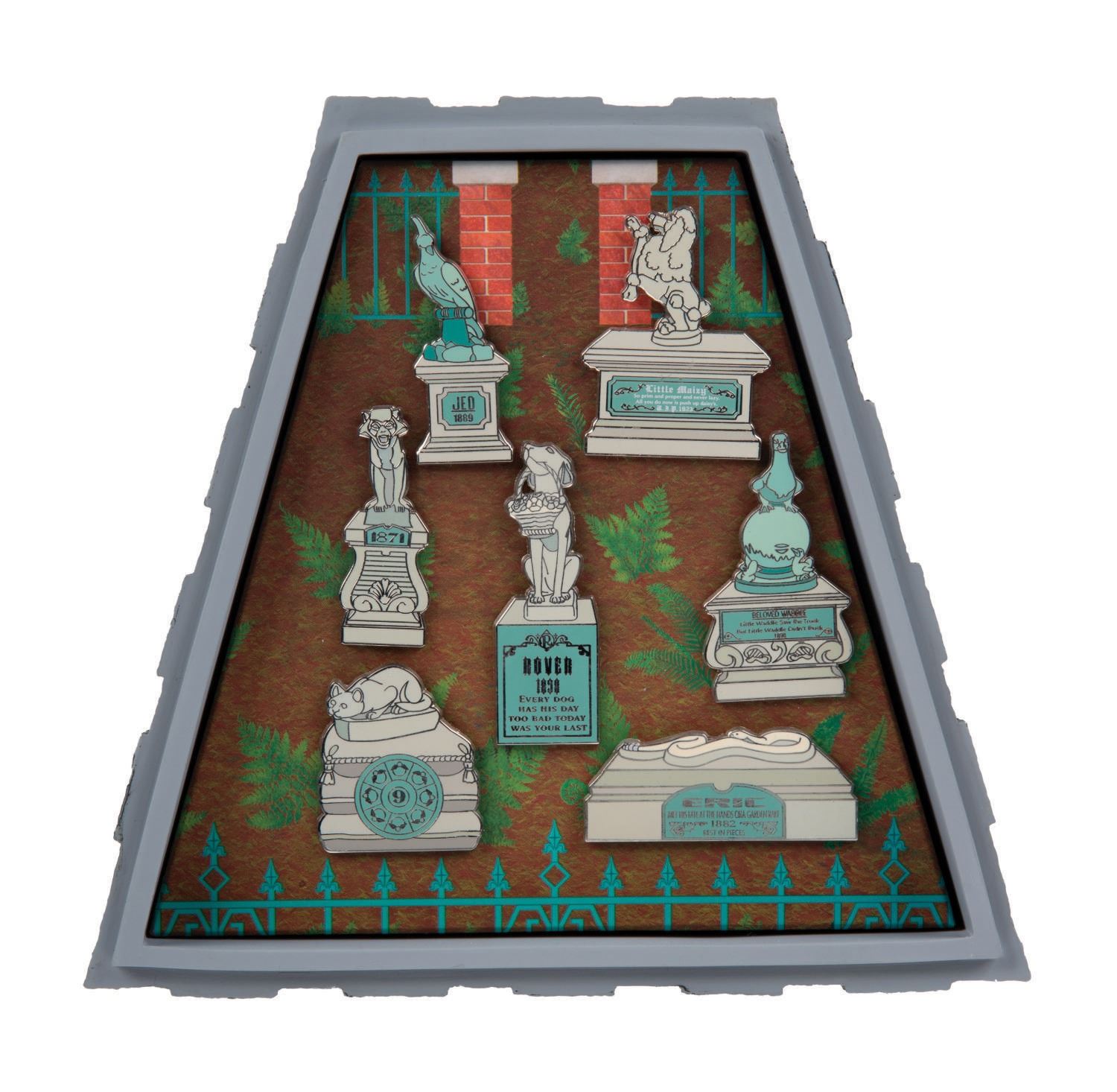(Walt Disney World, 2004) A "999 Happy Haunts Pet Cemetery" (7) pin set. The set memorializes (7) pet companions of the 999 Happy Haunts and was released in an edition of 250, contemporaneous with the "A Ghoulish Gathering" event at The Magic Kingdom. Measuring 2.25"x.75" and 1"x2", the pins are displayed within a tombstone-inspired collectable case.