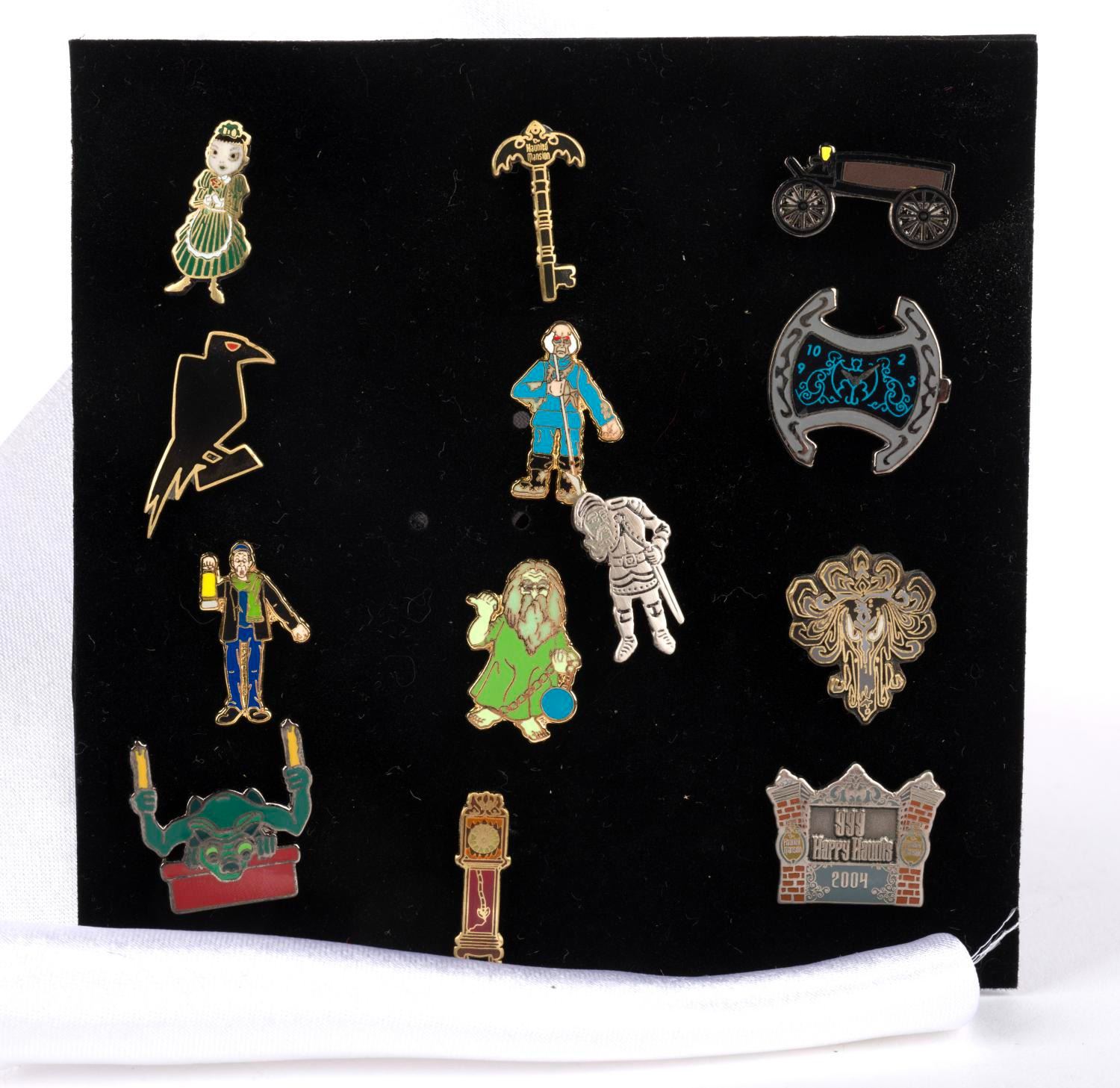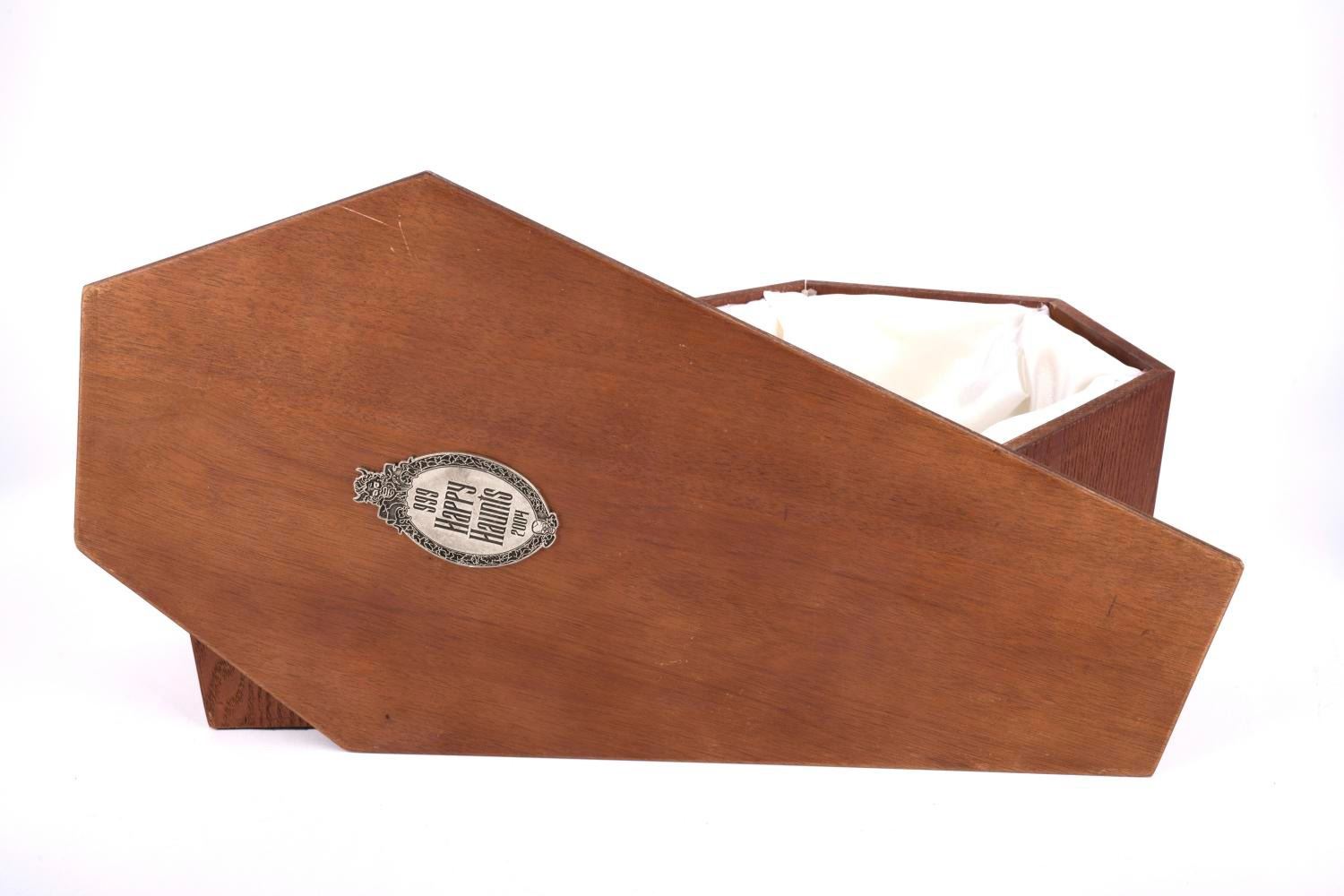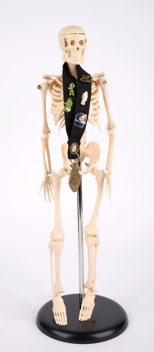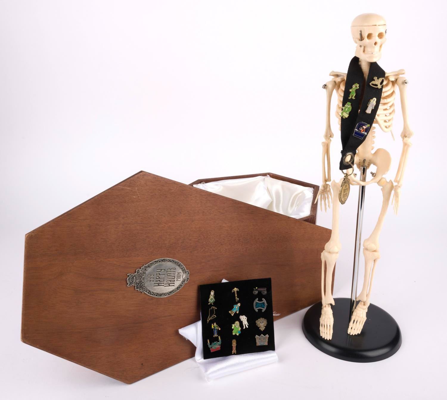 (Walt Disney World, 2004) An extremely rare "999 Happy Haunts: A Ghoulish Gathering" limited edition Skeleton Coffin & (18) mini-pin set. The boxed set was released limitedly as a gift for the (50) Guests who purchased the top-tier package for the event. The articulated skeleton, mini lanyard, (18) mini pins, and figure stand are packaged within a satin-lined wooden coffin with event medallion on lid. The coffin measures 19"x10.75"x5.75", while the plastic skeleton is 17" tall, and the pins are no bigger than .75" at their widest diameter, each piece in very good shape, with minor scuffs and wear to the stand from use.