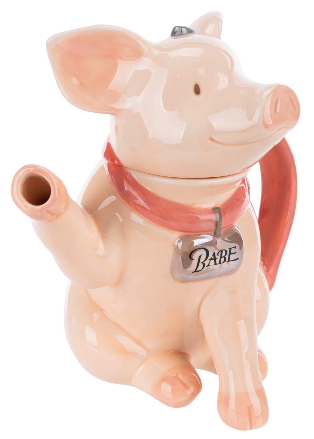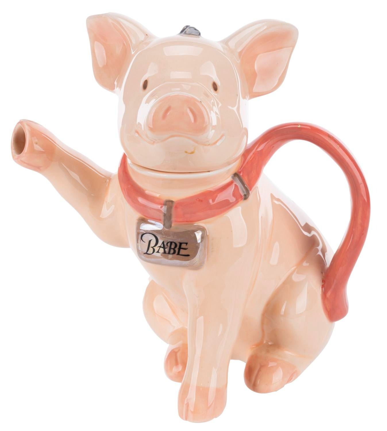 (Universal Pictures, 1995) A ceramic teapot in the shape of "Babe" the sheep-herding pig. Measuring 7" x 7.5" x 8.25" tall, the teapot is in very good condition with minor scuffs.