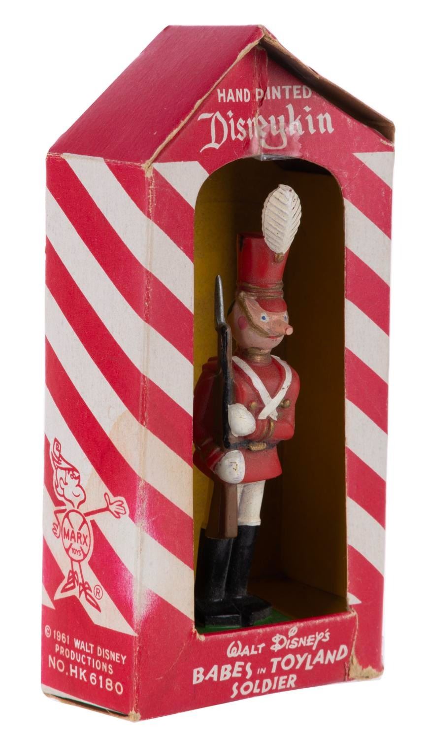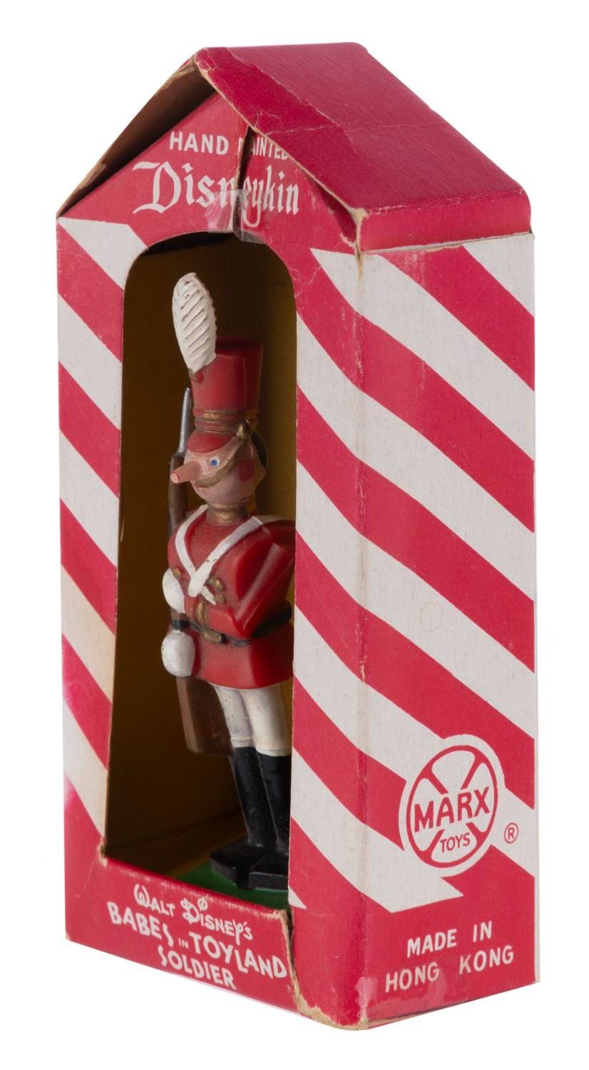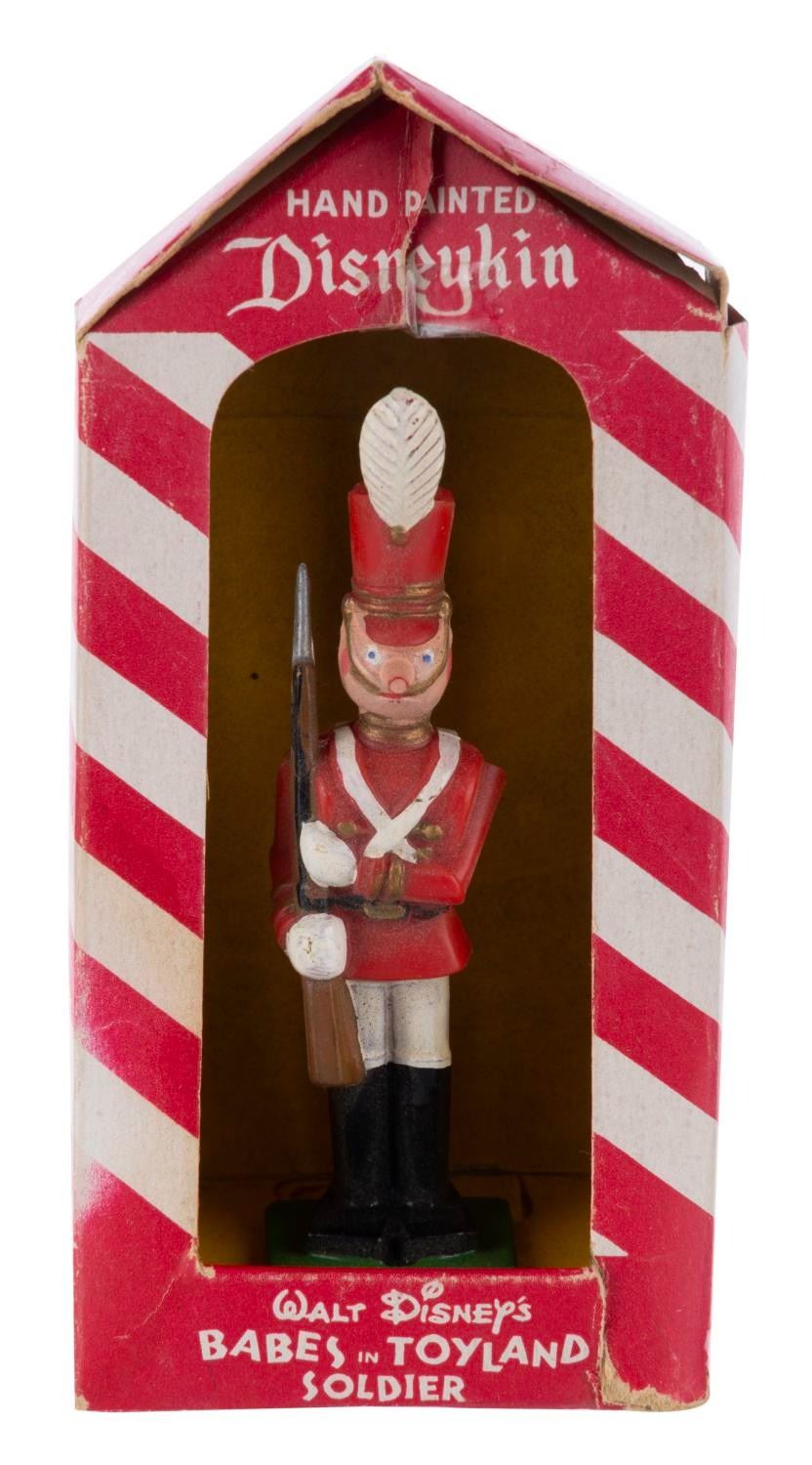(Disney, 1961) A Disneykins hand-painted miniature soldier manufactured by the Marx Toy Company for Walt Disney's 1961 film "Babes in Toyland." Measuring 1" x 3", the soldier is in very good condition with a black mark on its hat and typical color fading. The 2" x 4.25 display box is in fair condition with rips, stains, and tape visible from repair.