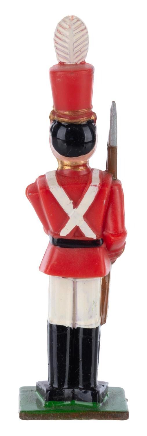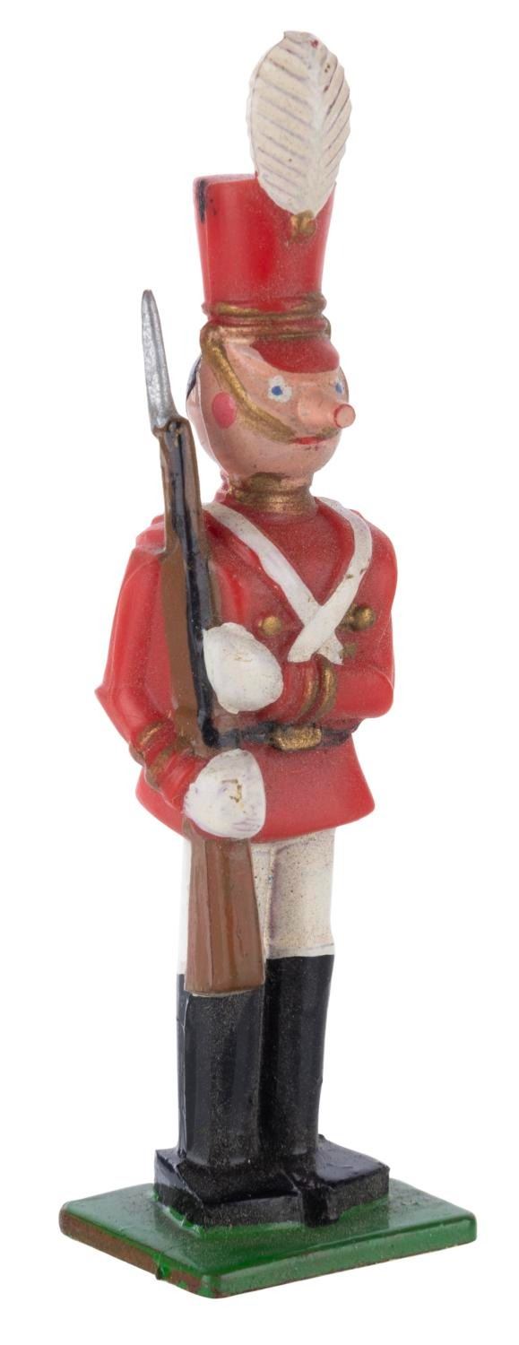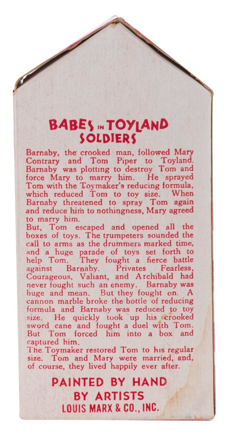 (Disney, 1961) A Disneykins hand-painted miniature soldier manufactured by the Marx Toy Company for Walt Disney's 1961 film "Babes in Toyland." Measuring 1" x 3", the soldier is in very good condition with a black mark on its hat and typical color fading. The 2" x 4.25 display box is in fair condition with rips, stains, and tape visible from repair.