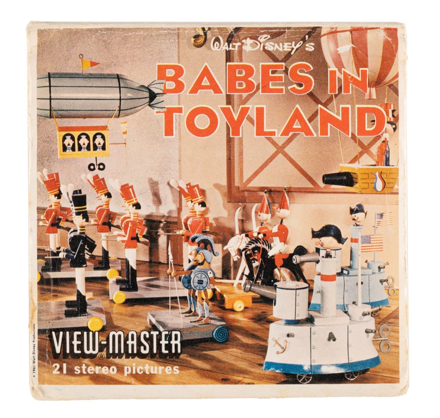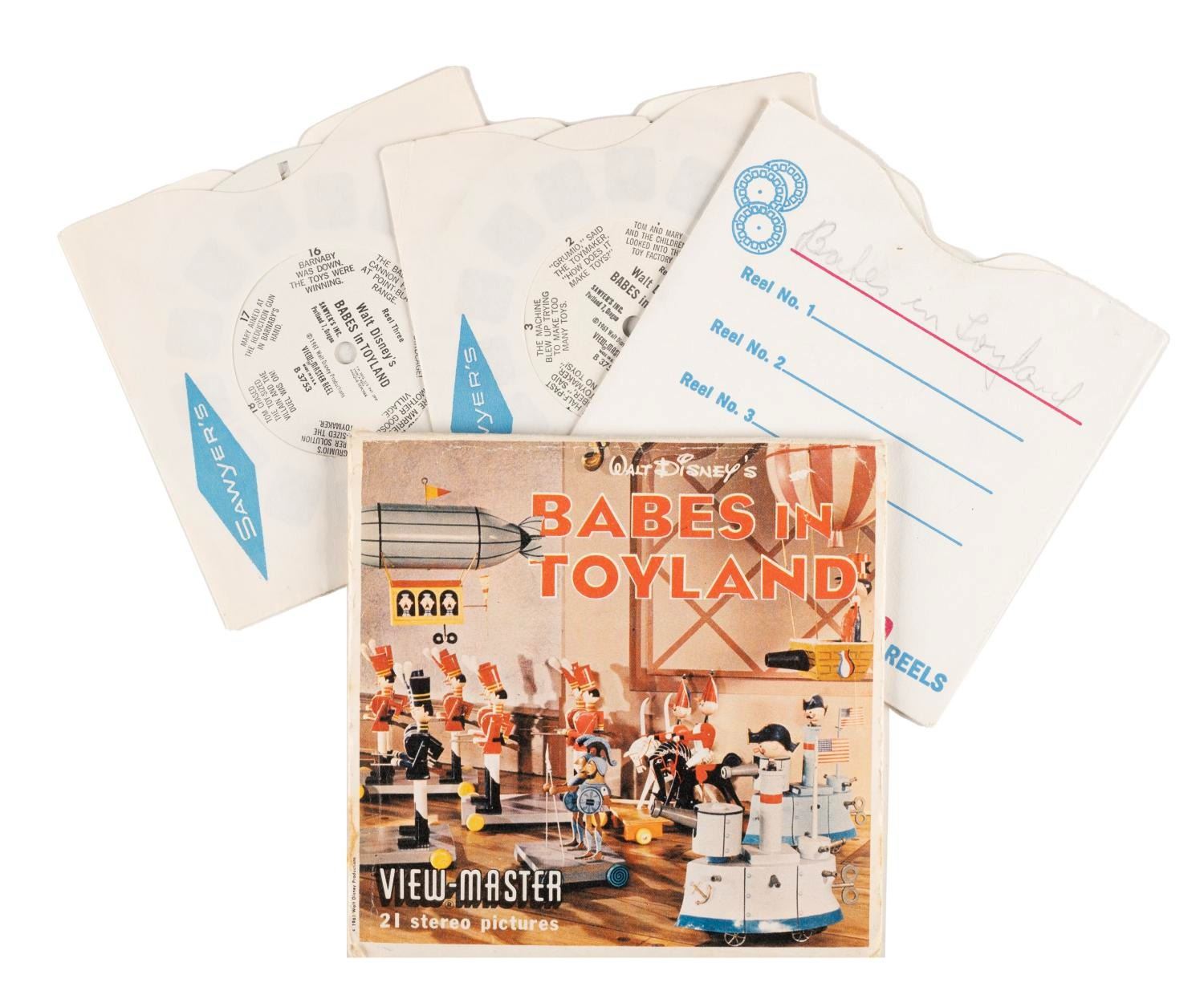 (Sawyers, 1961) A rare "Babes in Toyland" Sawyer's View-Master 3-disc set with a total of 21 color stereo pictures. Measuring 4.5" x 4.5", the package has been opened and is in good condition with discoloration from age, writing on one reel cover, creases, scuffs, stains, and wear.
