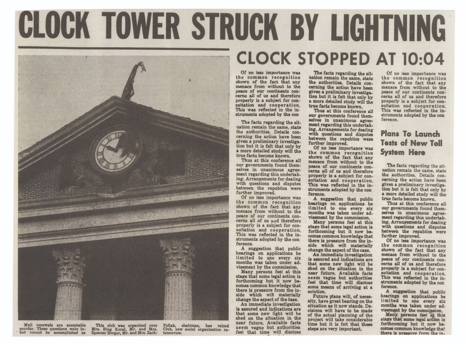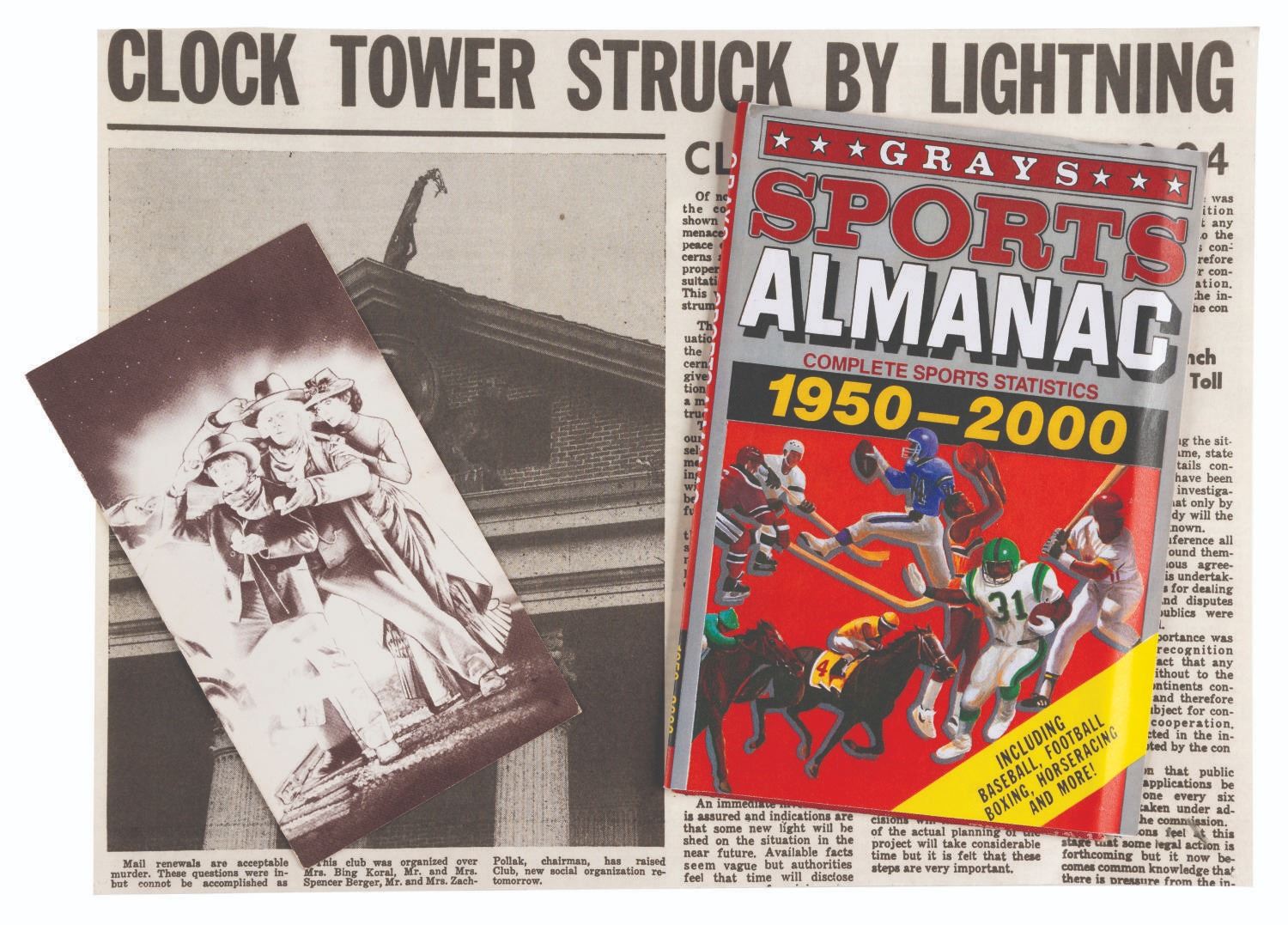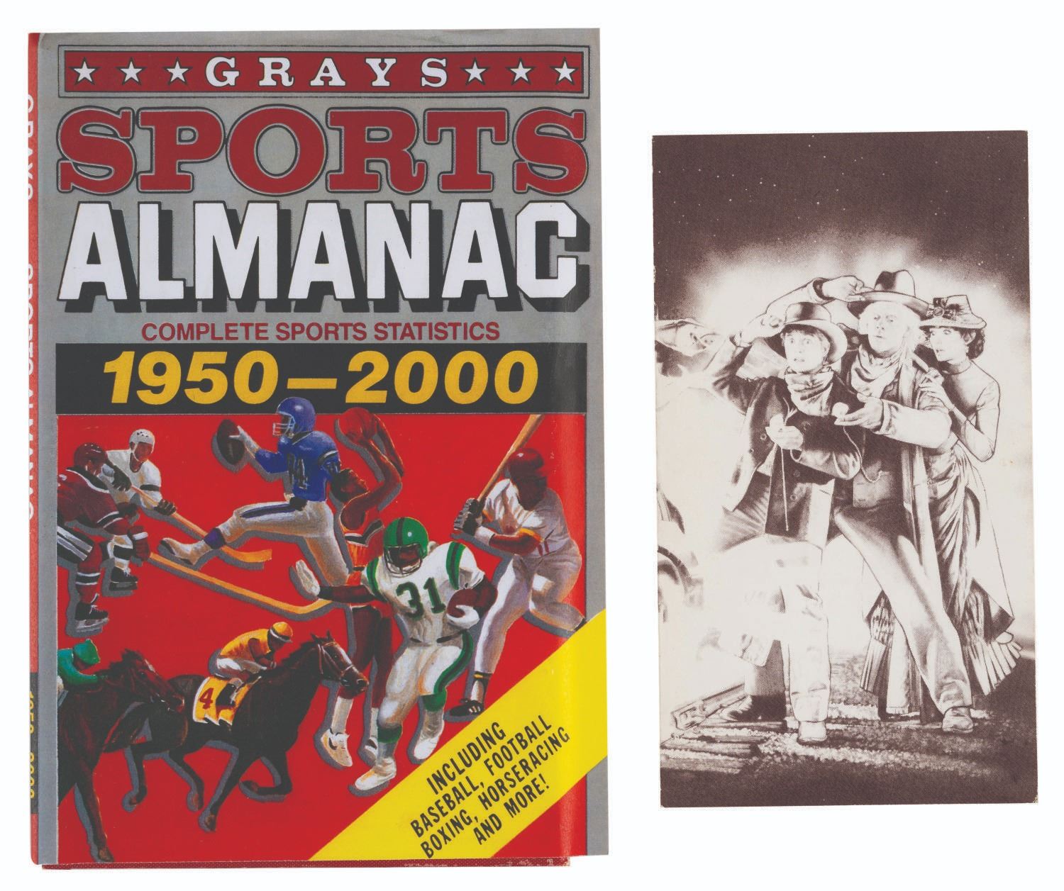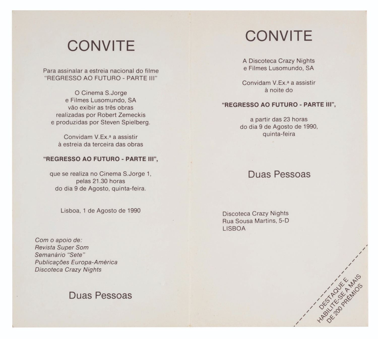 (Universal, 1990) An invitation for the premiere of "Back to the Future Part III” in Portugal, with props displayed at the party. Universal Studios sent prop reproductions from the film series including prints of the cover of Grays Sports Almanac and the front page of the Hill Valley Telegraph newspaper. Measuring between 7” x 4” and 11” x 14.75”, the items are in good condition with edge wear, creasing, pinholes, and light discoloration.