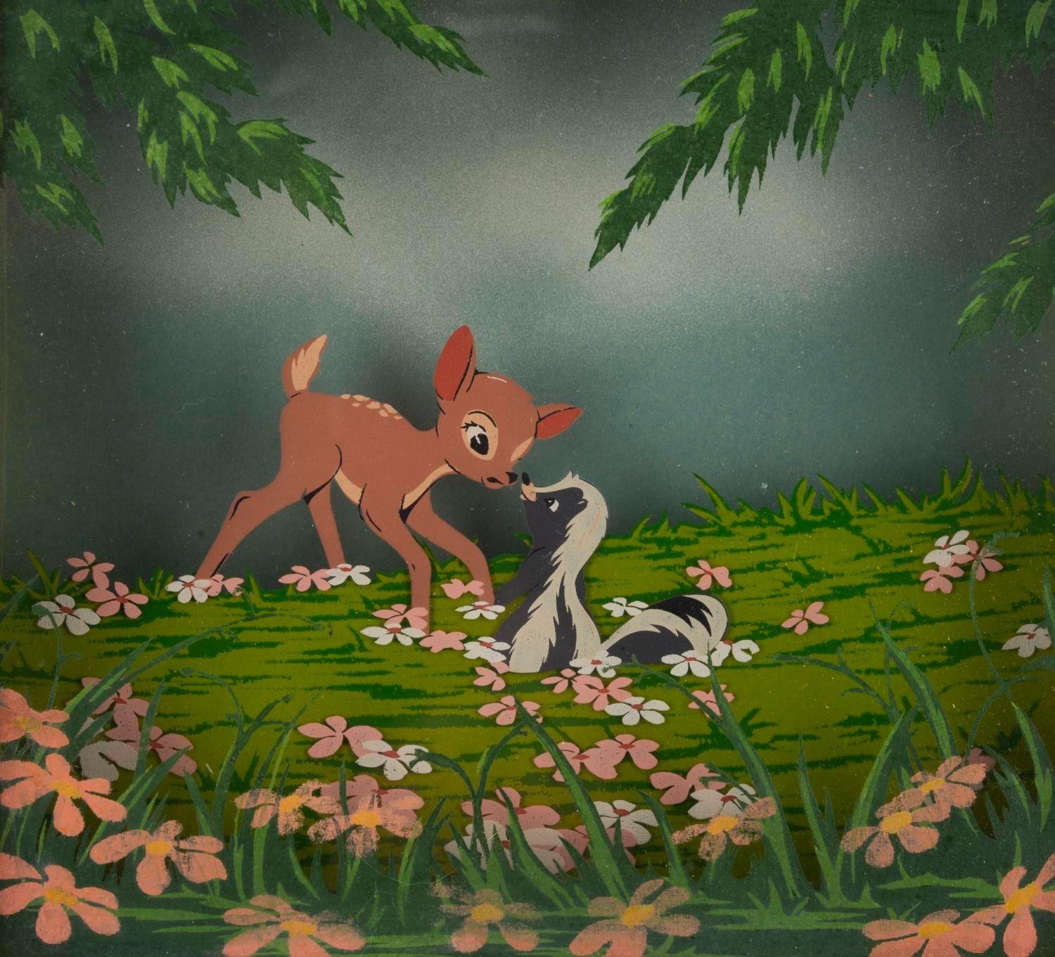 (Courvoisier, 1940s) A “Bambi Meets Little Flower, the Skunk,” multiplane painting No.13 by Courvoisier Galleries. After their success with the marketing and distribution of original production cels, Courvoisier Galleries of San Francisco presented these hand-painted on glass multiplane paintings as a way to demonstrate the use of Disney's Multiplane Camera. Composed of three 5.5” x 6” hand-painted glass layers, in an 8” x 8.75” x 1.75” deep frame, the piece is in very good condition with scuffs, chips, and paint loss to the frame, and paper loss and tears to the Courvoisier certificate on the reverse.